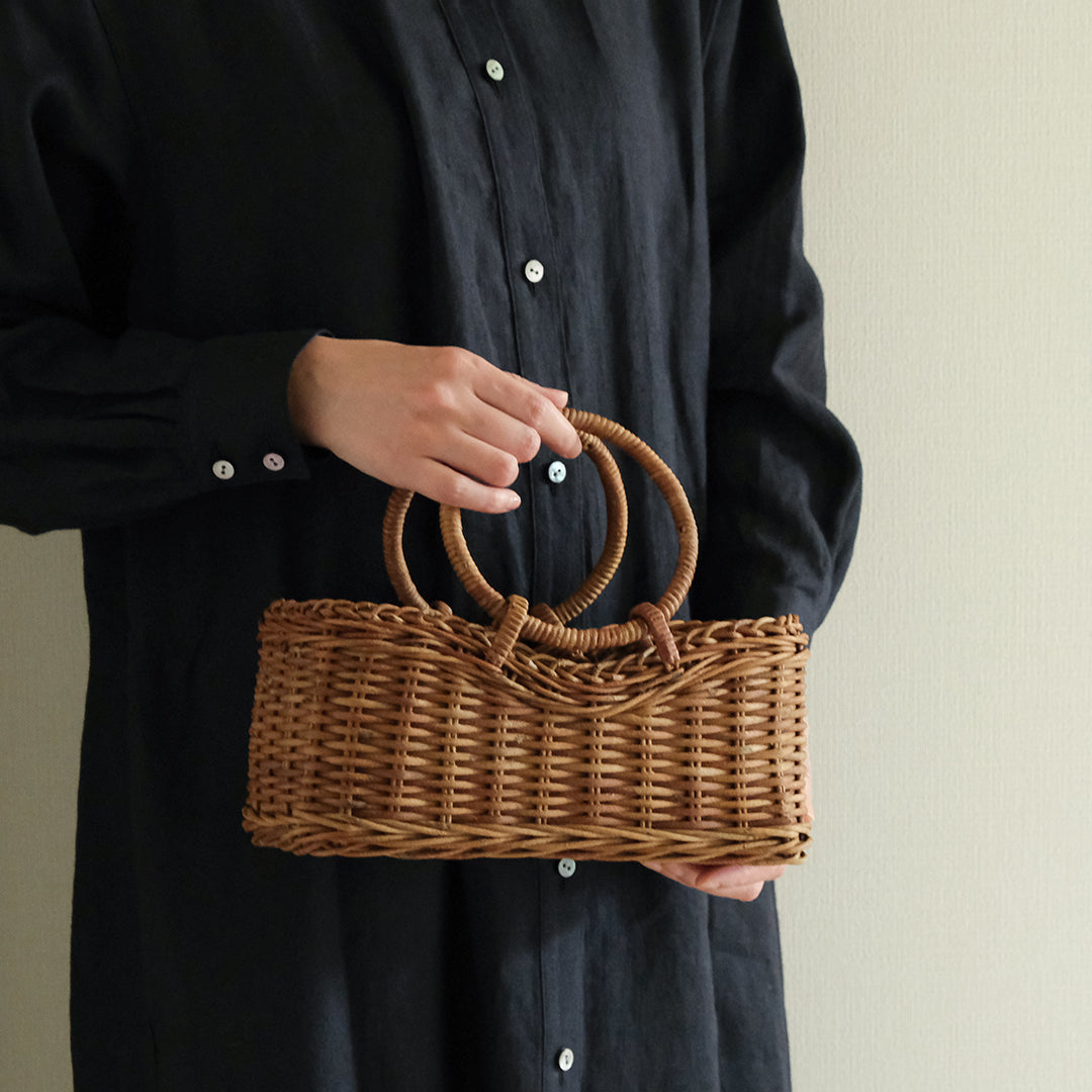 小振りでコンパクトなのでリネンのワンピースやブラウスなど可憐なスタイルとも好相性。天然素材同士で相性がよく、装いを選ばずに使えます。