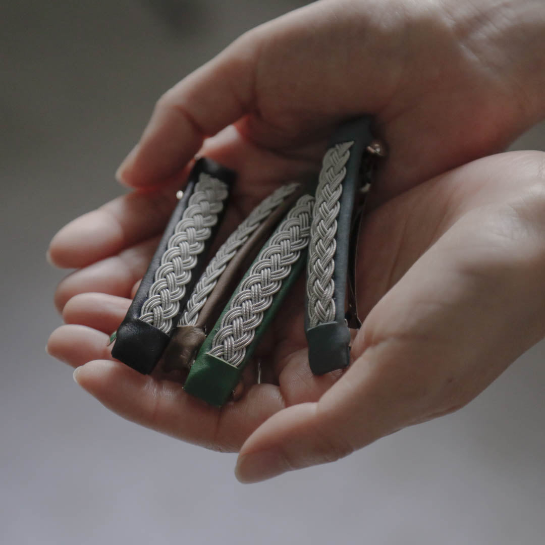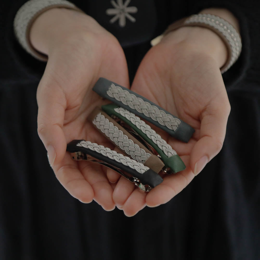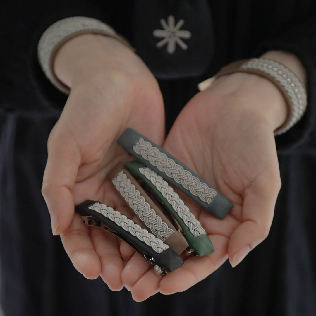 バレッタBRT001は、3本取りの錫糸を使った四つ編みデザイン。パチンと留めるだけで、素敵な雰囲気に見せてくれます。サイズは使い勝手のよい8cmです。