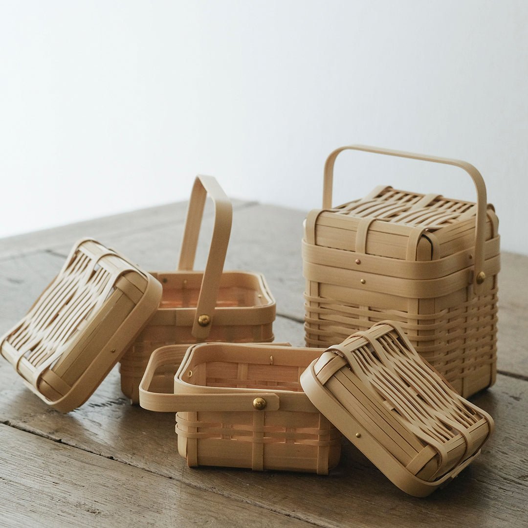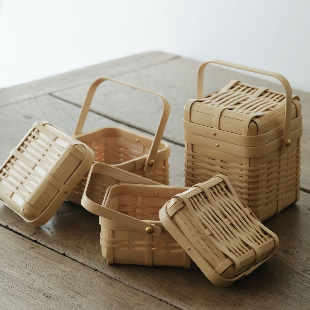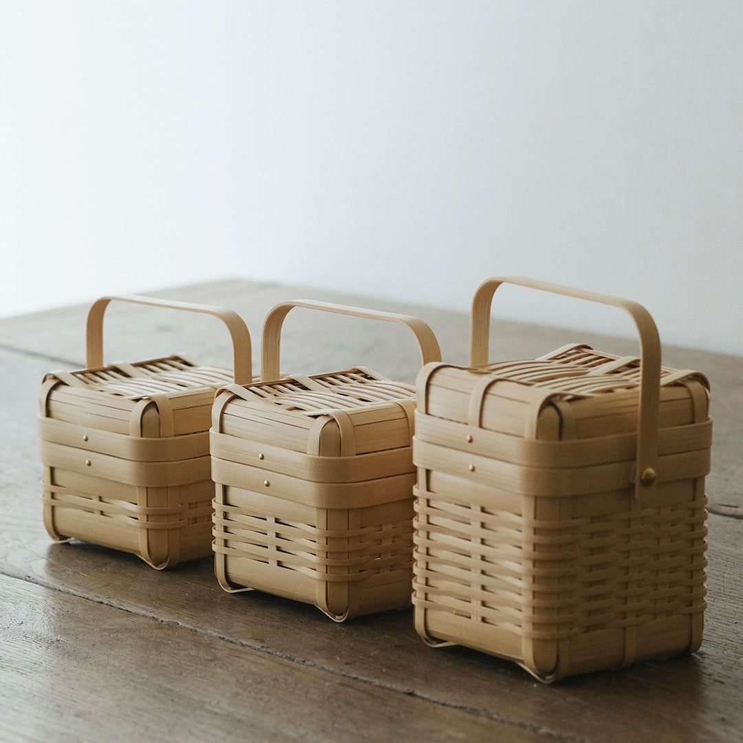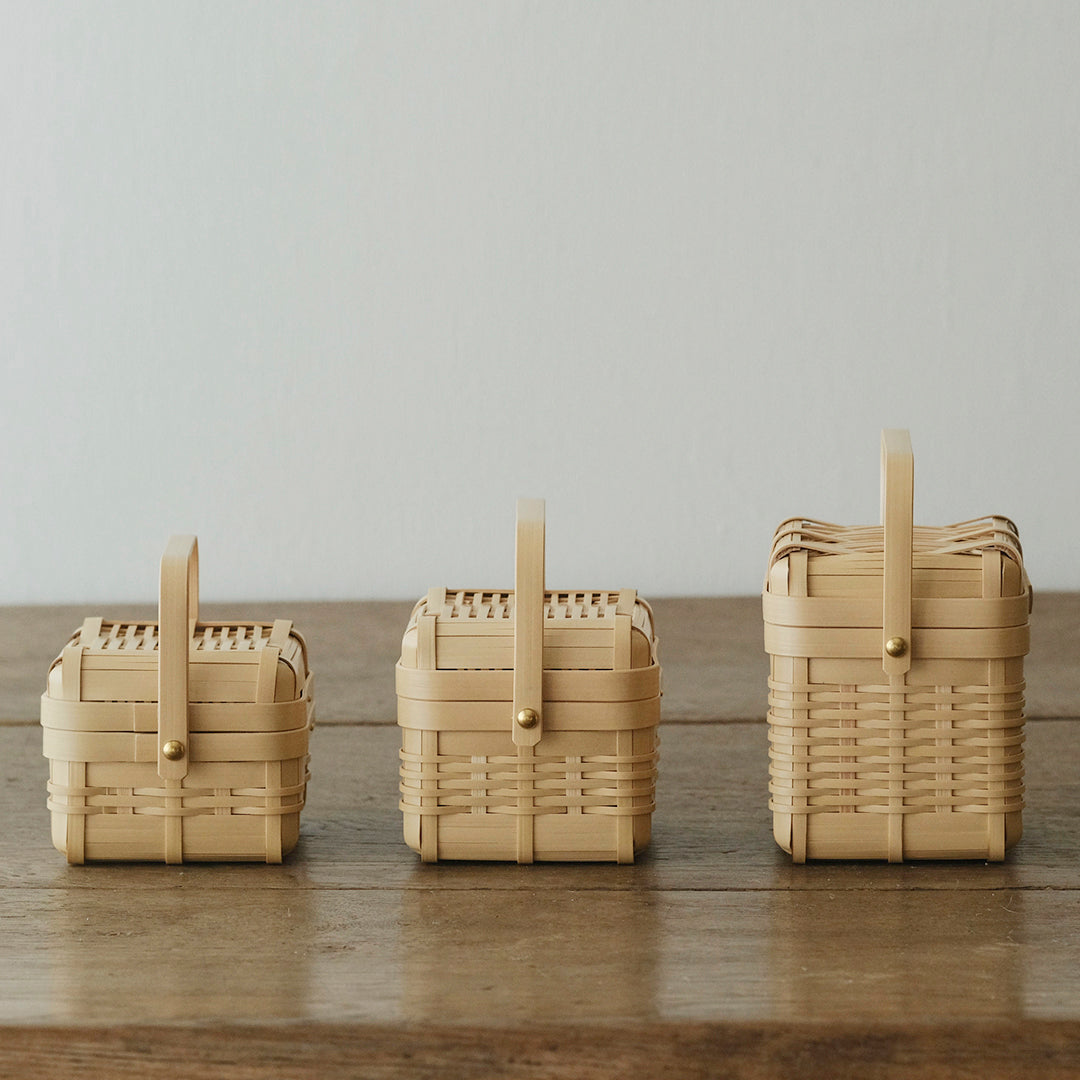 別府竹細工の手法でかごを編む、福田真理子さんによる竹かご。取手をつけた、高さの異なる3種類の小箱をご紹介します。なくしたくない大切なものや、毎日身に着ける小さいものの置き場所に。