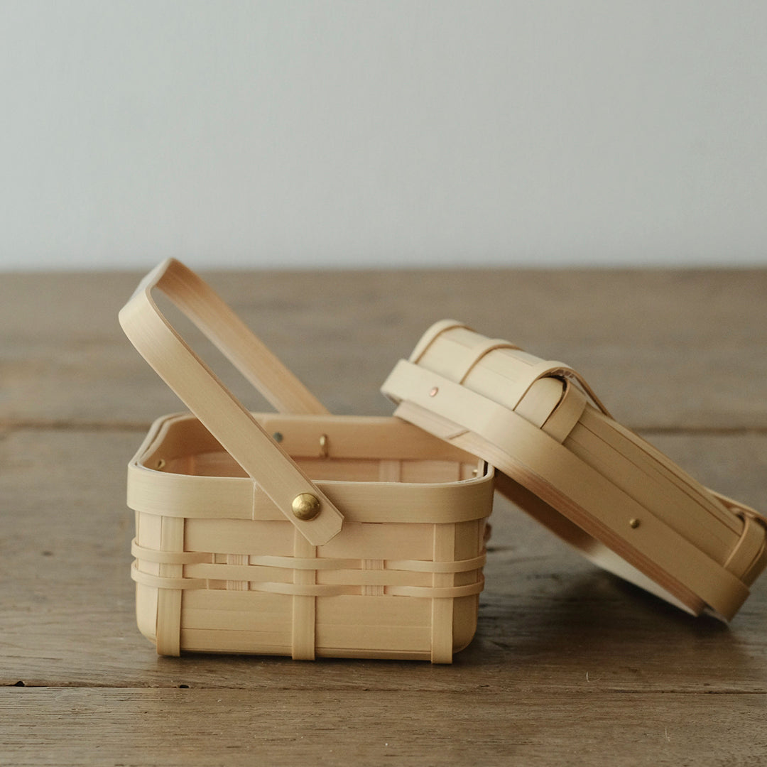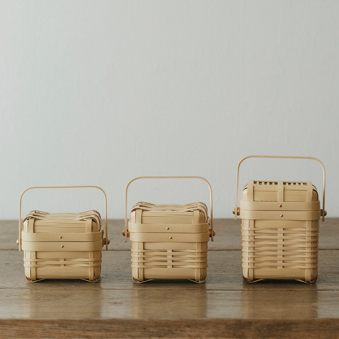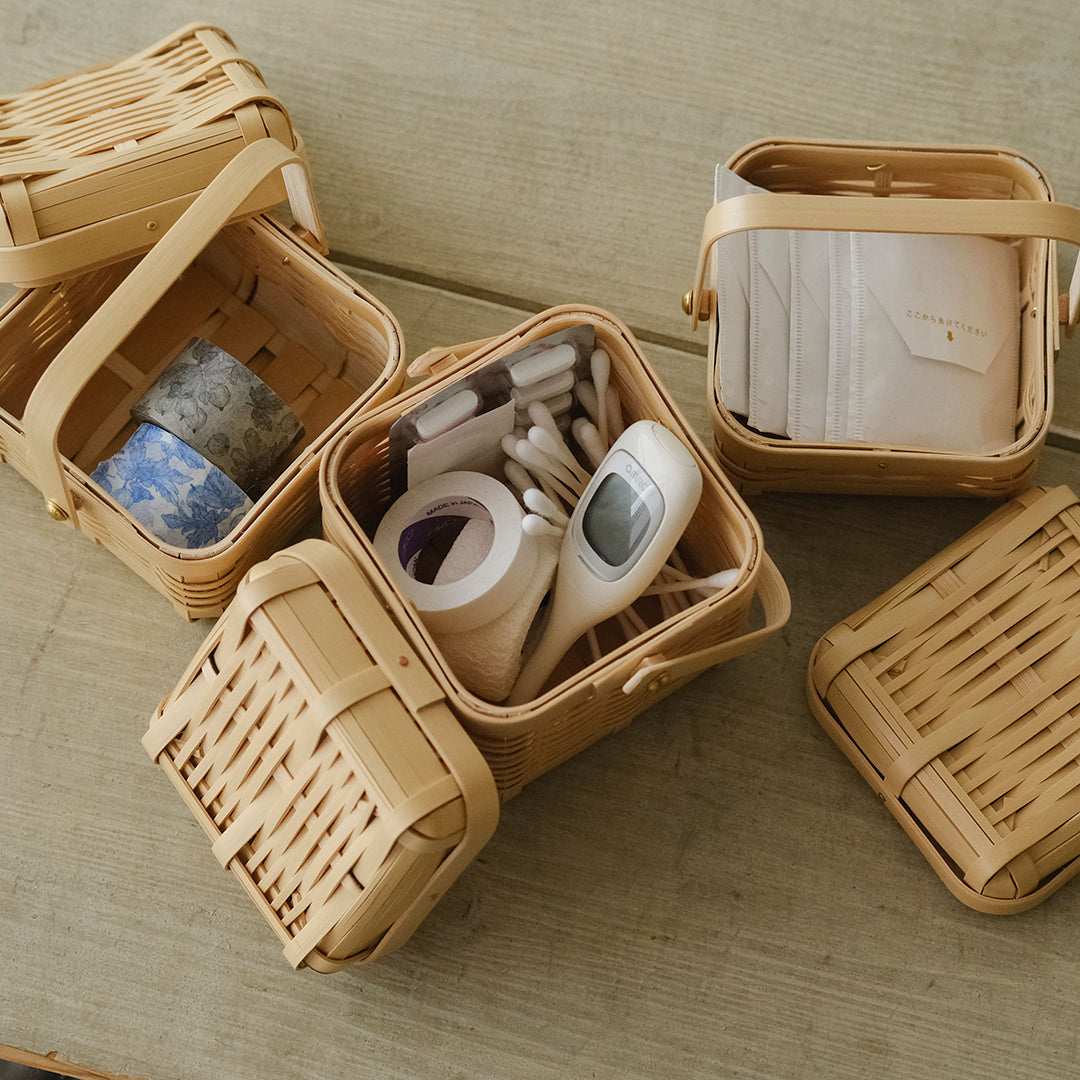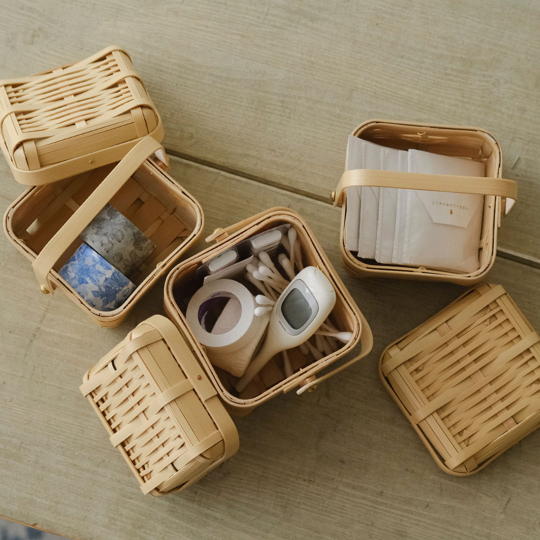 別府竹細工の手法でかごを編む、福田真理子さんによる竹かご。取手をつけた、高さの異なる3種類の小箱をご紹介します。なくしたくない大切なものや、毎日身に着ける小さいものの置き場所に。