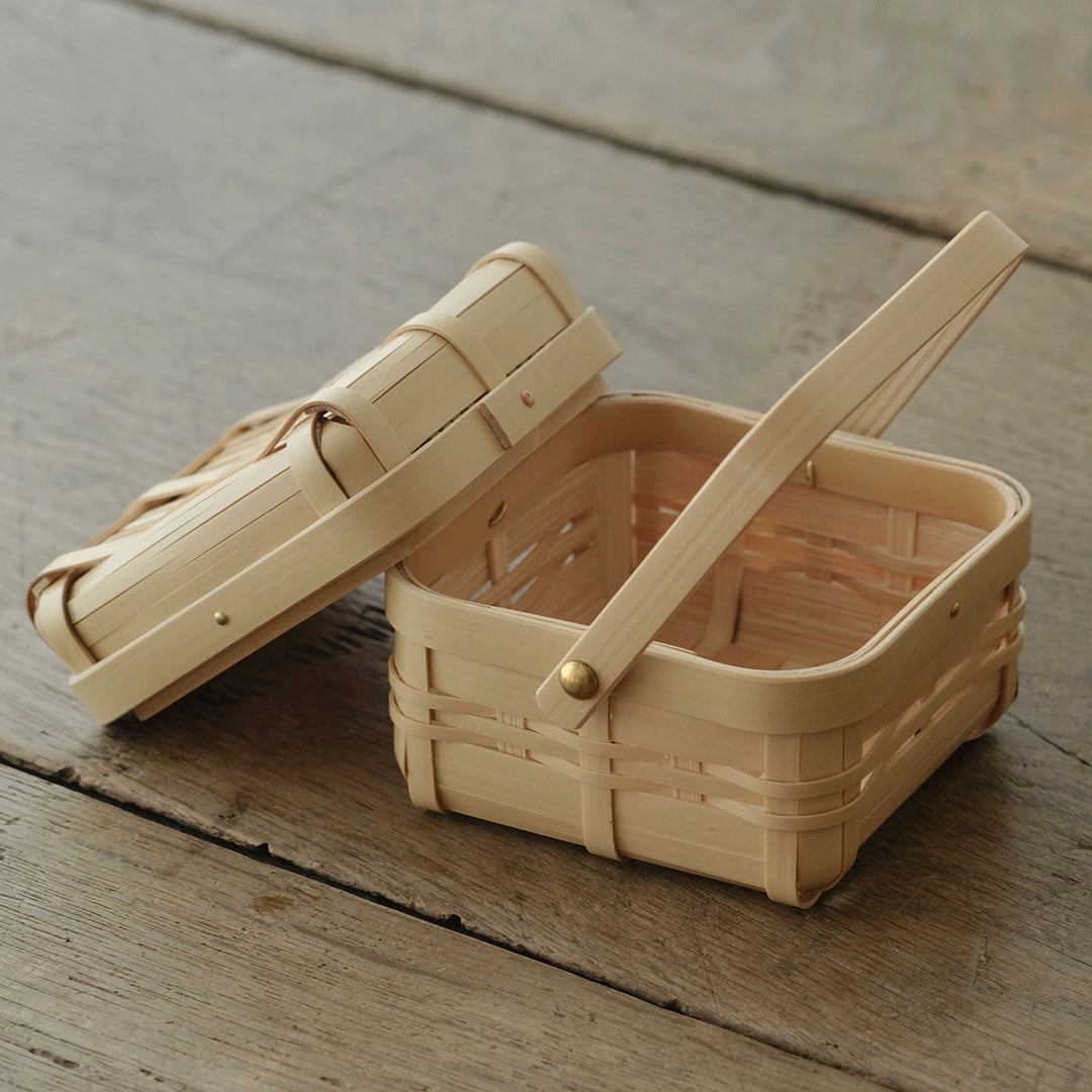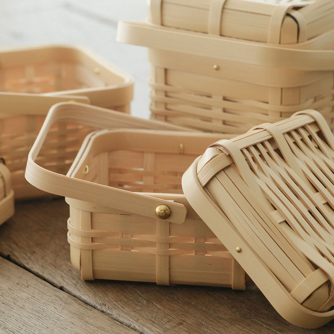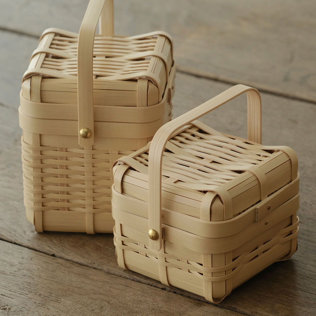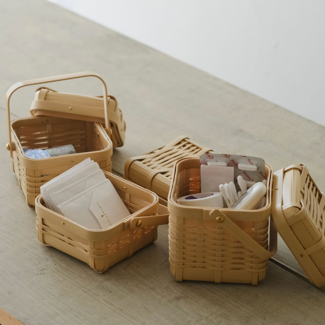 別府竹細工の手法でかごを編む、福田真理子さんによる竹かご。取手をつけた、高さの異なる3種類の小箱をご紹介します。なくしたくない大切なものや、毎日身に着ける小さいものの置き場所に。