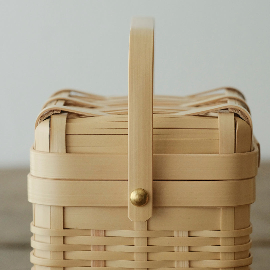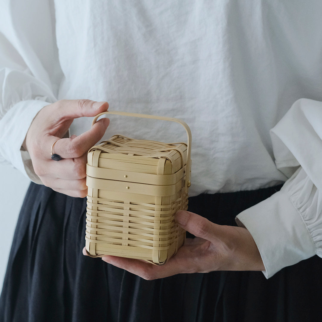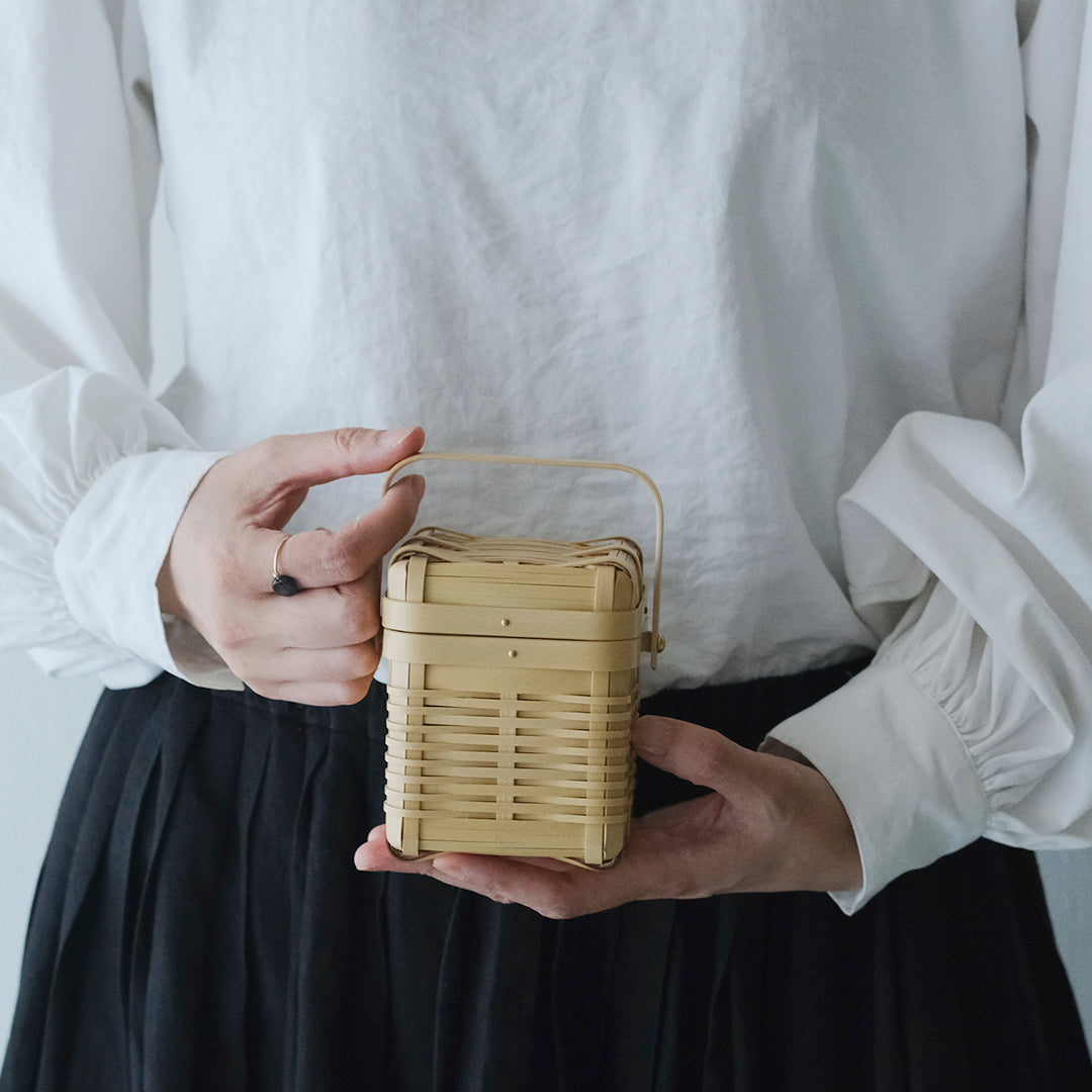 中身の見えないふたつきのかごは汎用性も高く、生活の中にそっと静かに寄り添ってくれる存在です。取手は自由に動かせるので置く場所を選ばず、収納しやすく機能的。ふたもかちっときれいに閉まるので、心地よく開閉動作ができます。素材は真竹。その真竹に熱処理を施し、油や色を抜いた「白竹」を使い編まれています。白竹のみずみずしい透明感は、明るく上品な印象をもたらします。