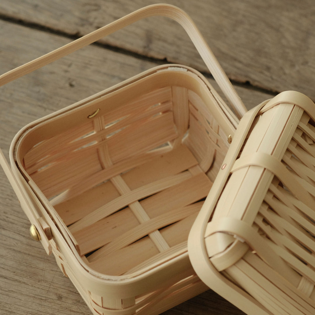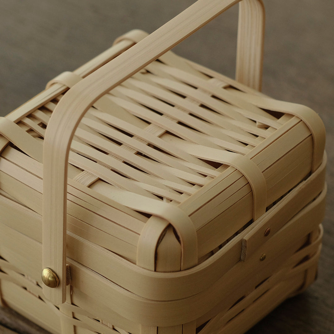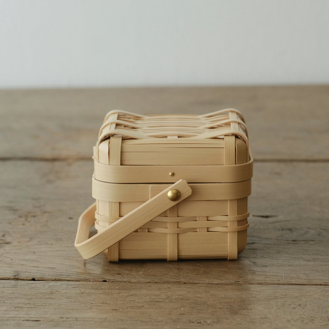 中身の見えないふたつきのかごは汎用性も高く、生活の中にそっと静かに寄り添ってくれる存在です。取手は自由に動かせるので置く場所を選ばず、収納しやすく機能的。ふたもかちっときれいに閉まるので、心地よく開閉動作ができます。素材は真竹。その真竹に熱処理を施し、油や色を抜いた「白竹」を使い編まれています。白竹のみずみずしい透明感は、明るく上品な印象をもたらします。