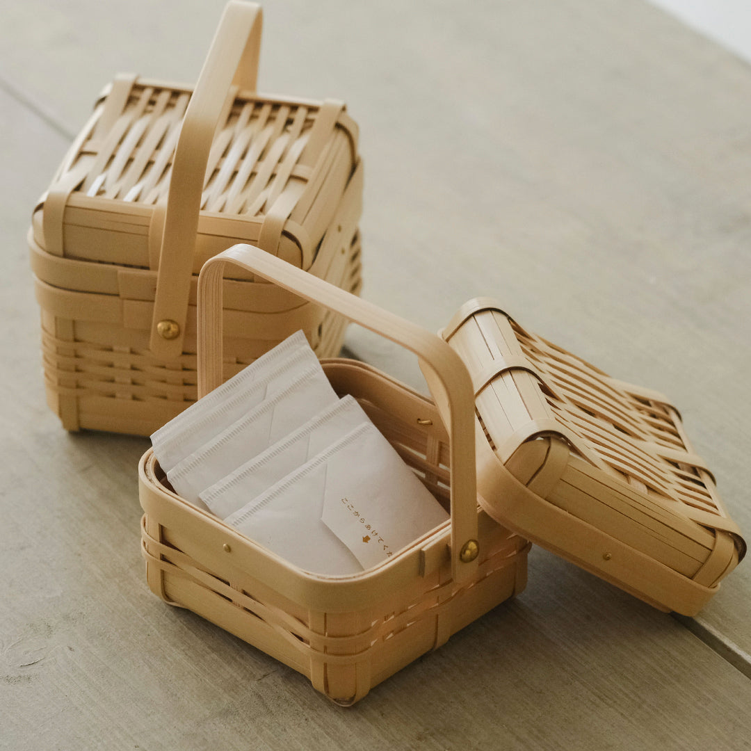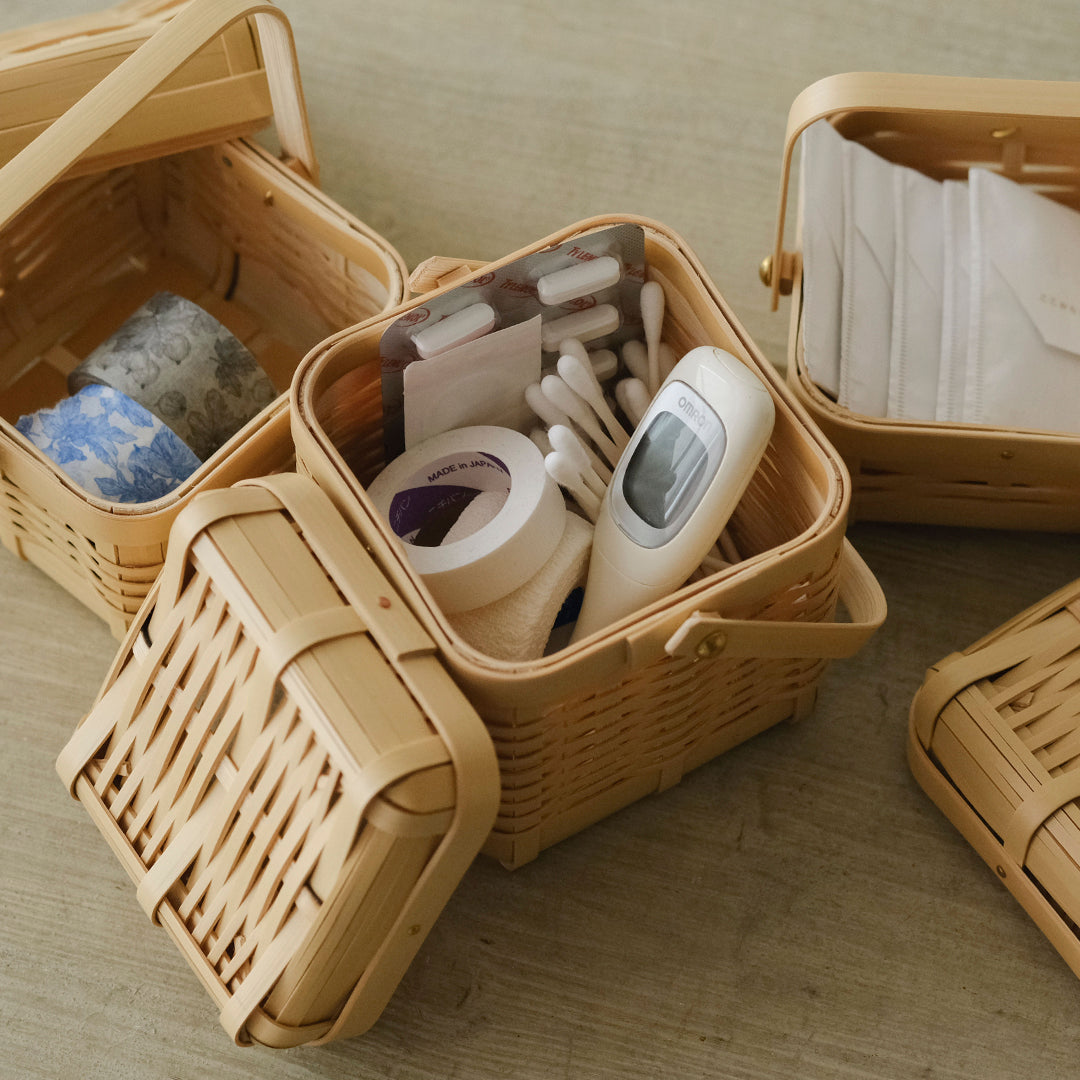 今回のかご展で新しくご紹介する、取手をつけた小さな竹の小箱。高さの異なる3つの小箱は、いざというシーンで必要なものを入れて、お部屋のインテリアとしても楽しめます。