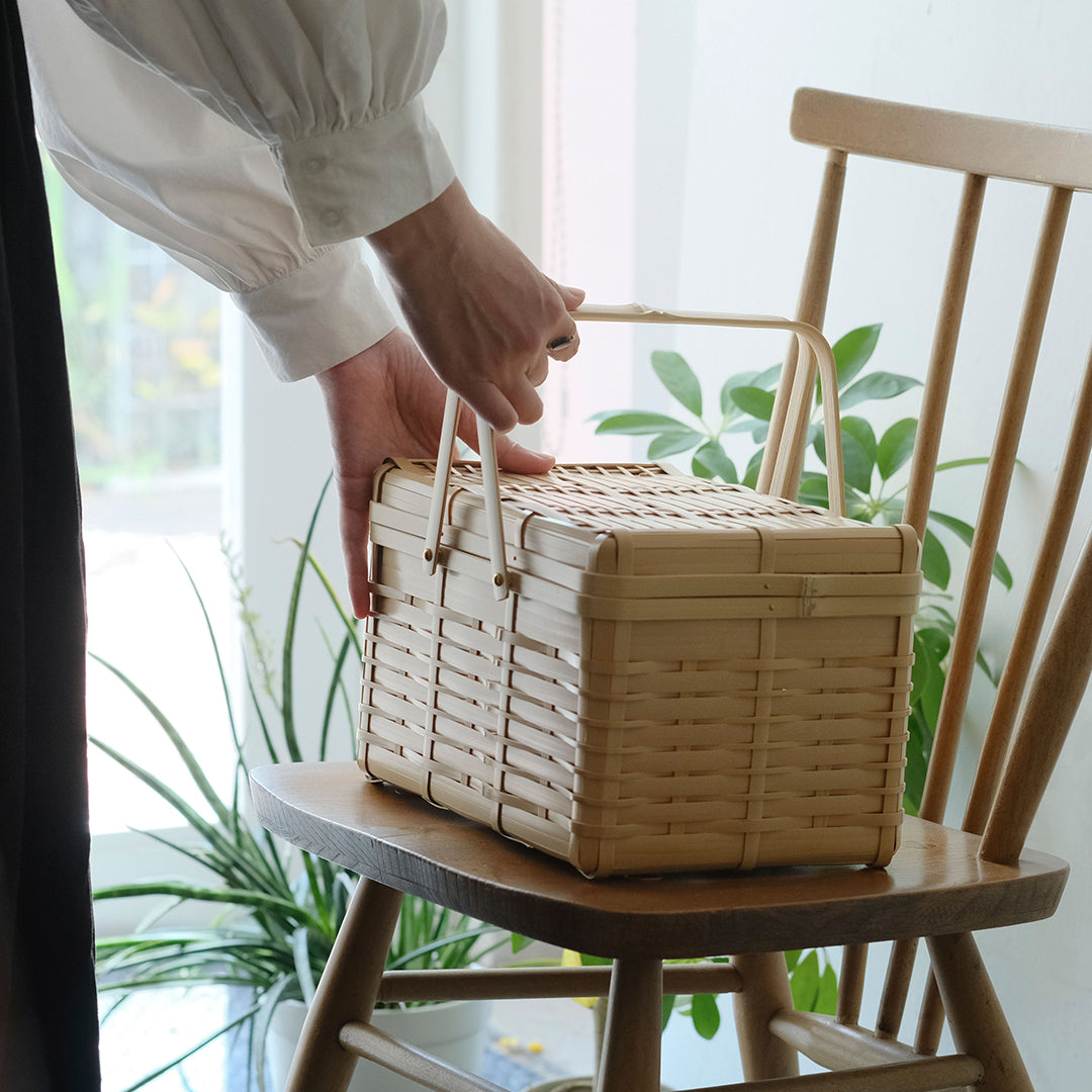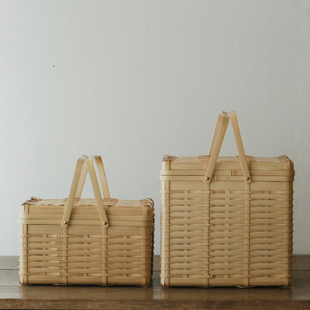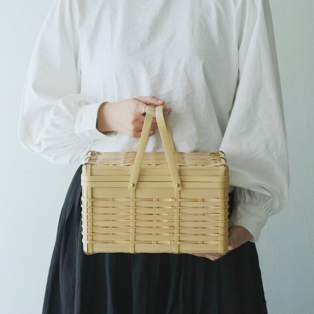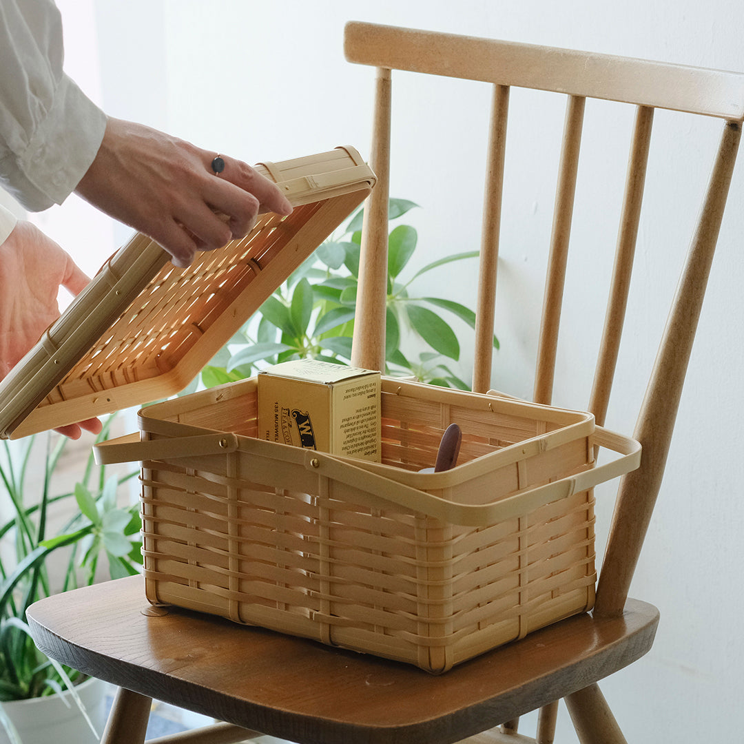 中身の見えないふたつきのかごは汎用性も高く、生活の中にそっと静かに寄り添ってくれる存在です。取手は自由に動かせるので置く場所を選ばず、収納しやすく機能的。ふたもかちっときれいに閉まるので、心地よく開閉動作ができます。素材は真竹。その真竹に熱処理を施し、油や色を抜いた「白竹」を使い編まれています。白竹のみずみずしい透明感は、明るく上品な印象をもたらします。