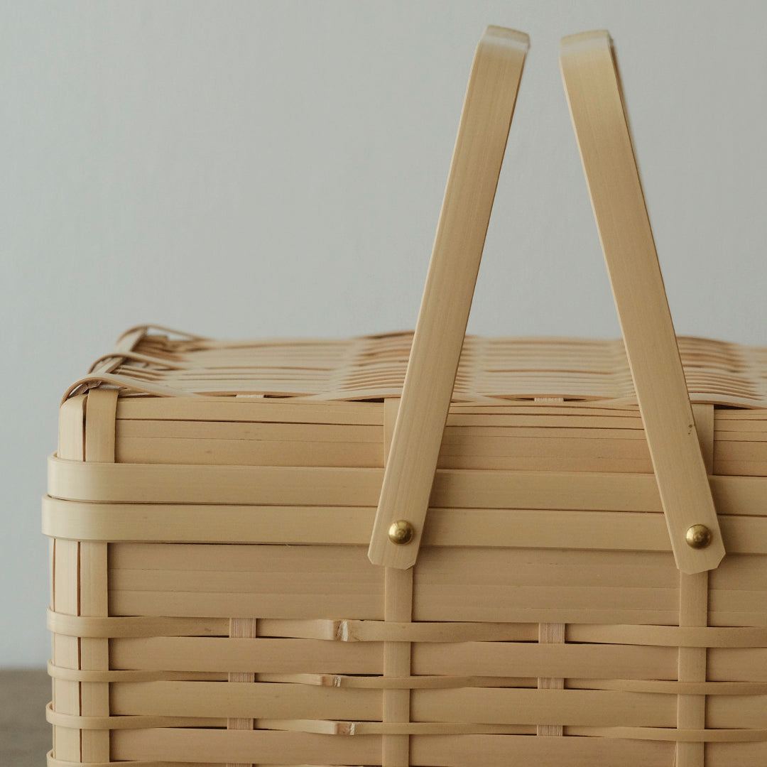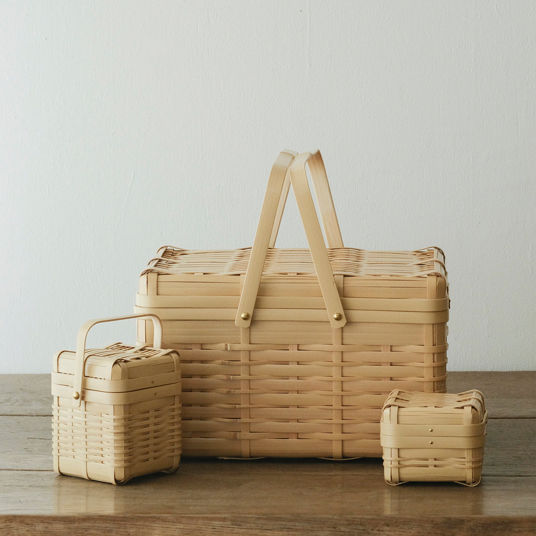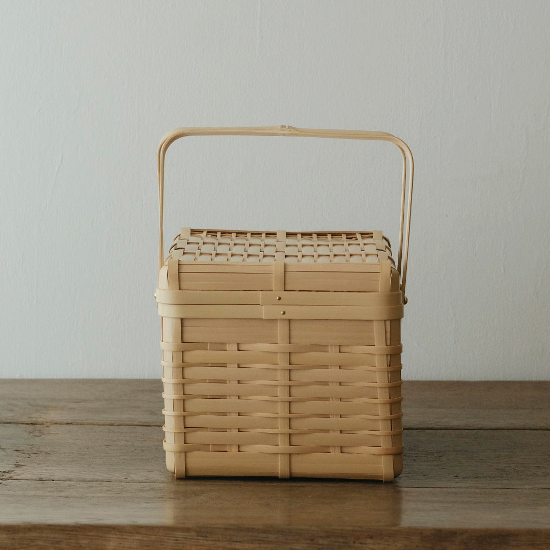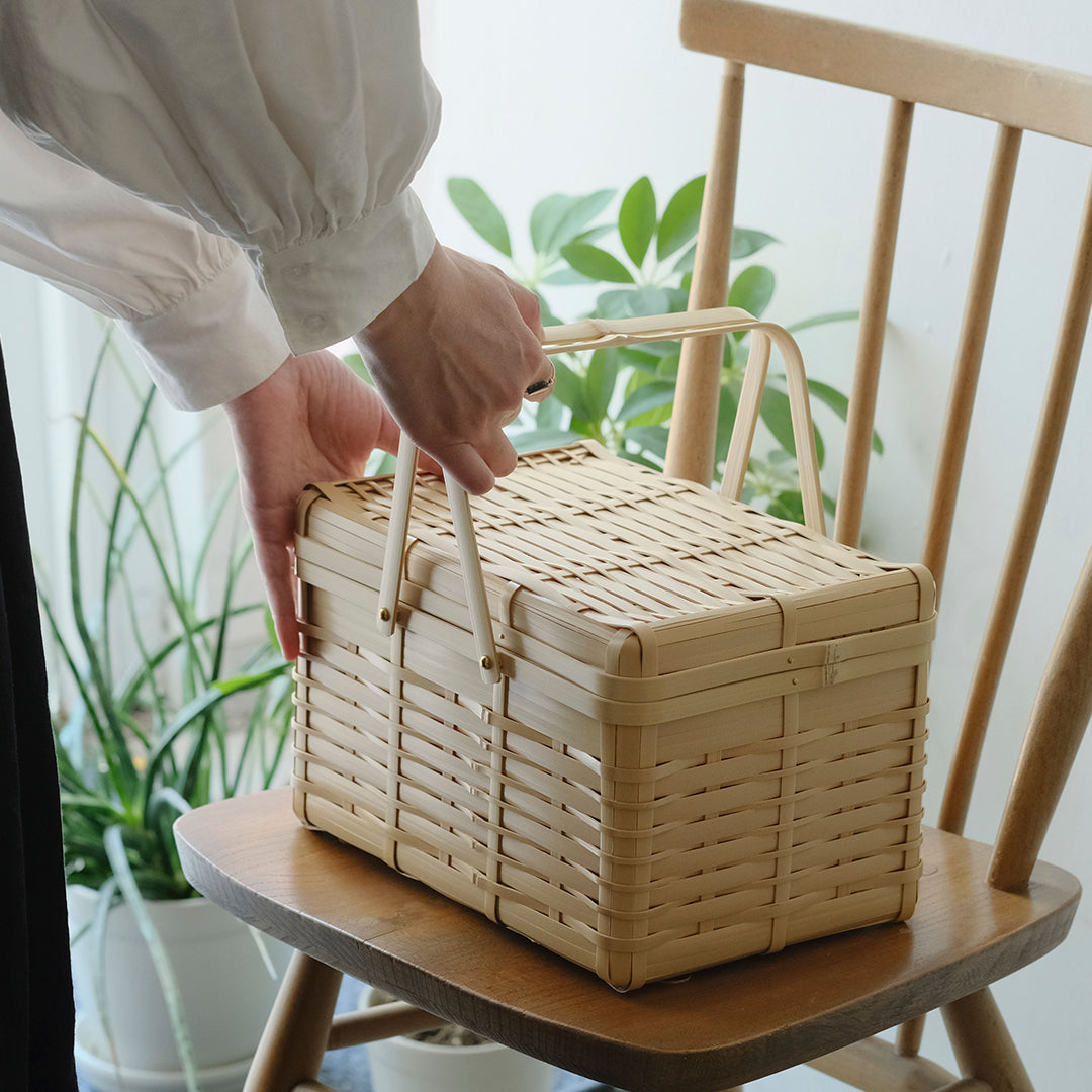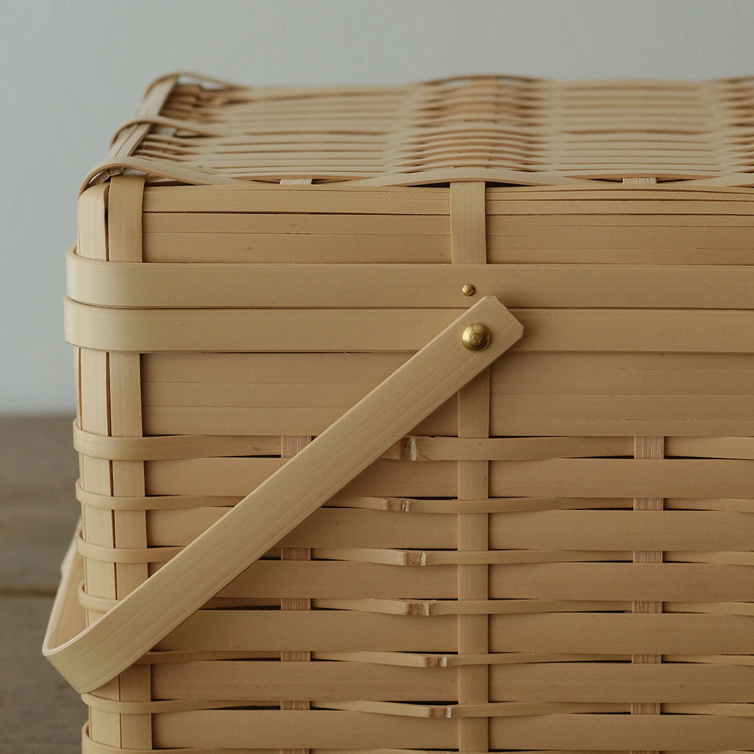 中身の見えないふたつきのかごは汎用性も高く、生活の中にそっと静かに寄り添ってくれる存在です。取手は自由に動かせるので置く場所を選ばず、収納しやすく機能的。ふたもかちっときれいに閉まるので、心地よく開閉動作ができます。素材は真竹。その真竹に熱処理を施し、油や色を抜いた「白竹」を使い編まれています。白竹のみずみずしい透明感は、明るく上品な印象をもたらします。