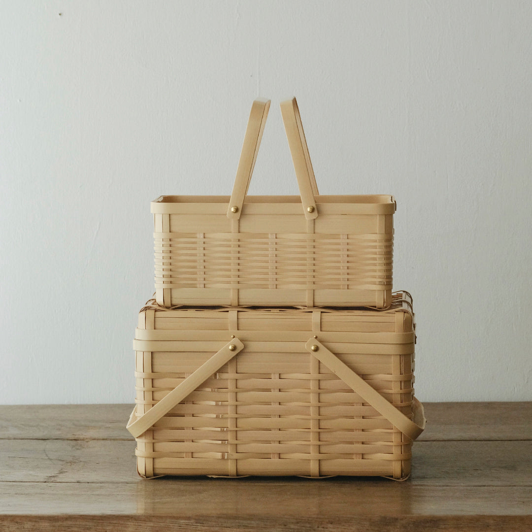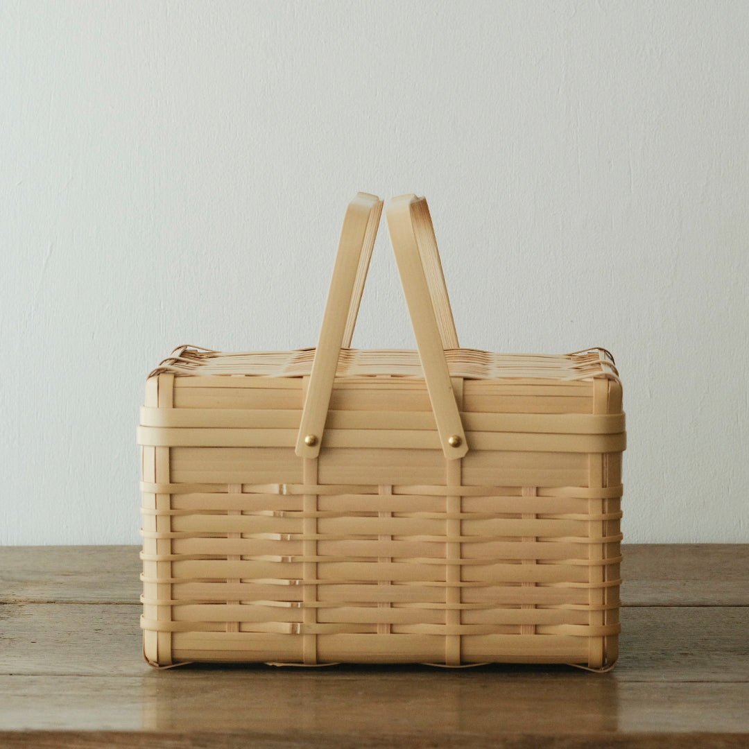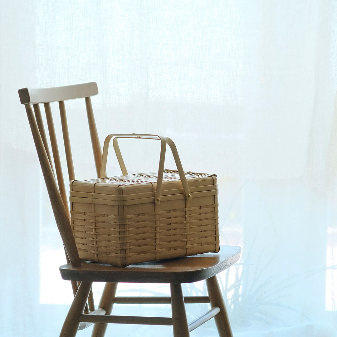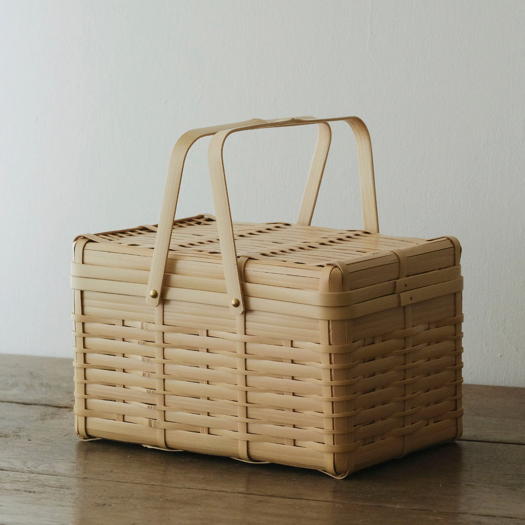 中身の見えないふたつきのかごは汎用性も高く、生活の中にそっと静かに寄り添ってくれる存在です。取手は自由に動かせるので置く場所を選ばず、収納しやすく機能的。ふたもかちっときれいに閉まるので、心地よく開閉動作ができます。素材は真竹。その真竹に熱処理を施し、油や色を抜いた「白竹」を使い編まれています。白竹のみずみずしい透明感は、明るく上品な印象をもたらします。
