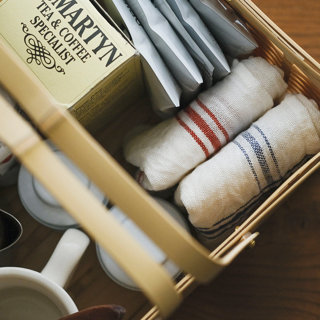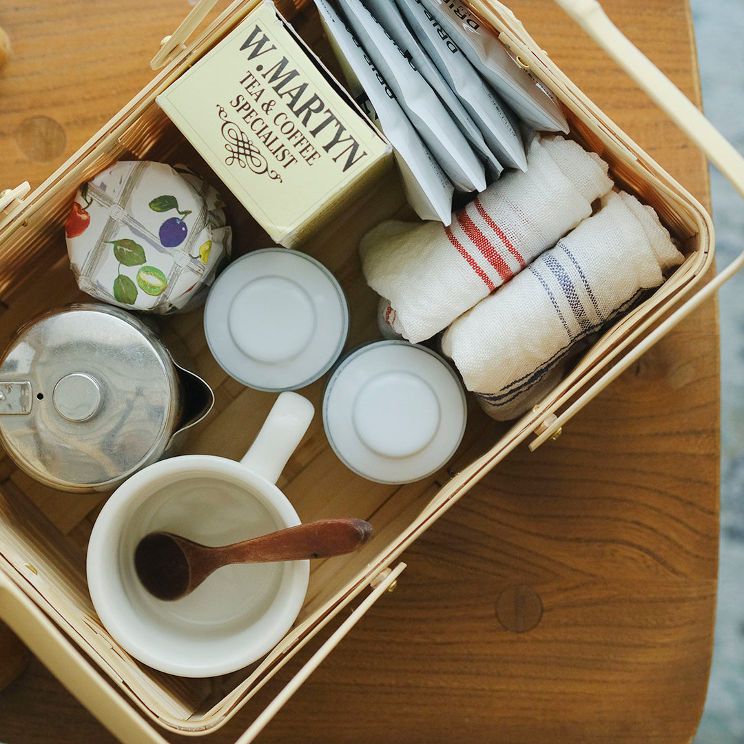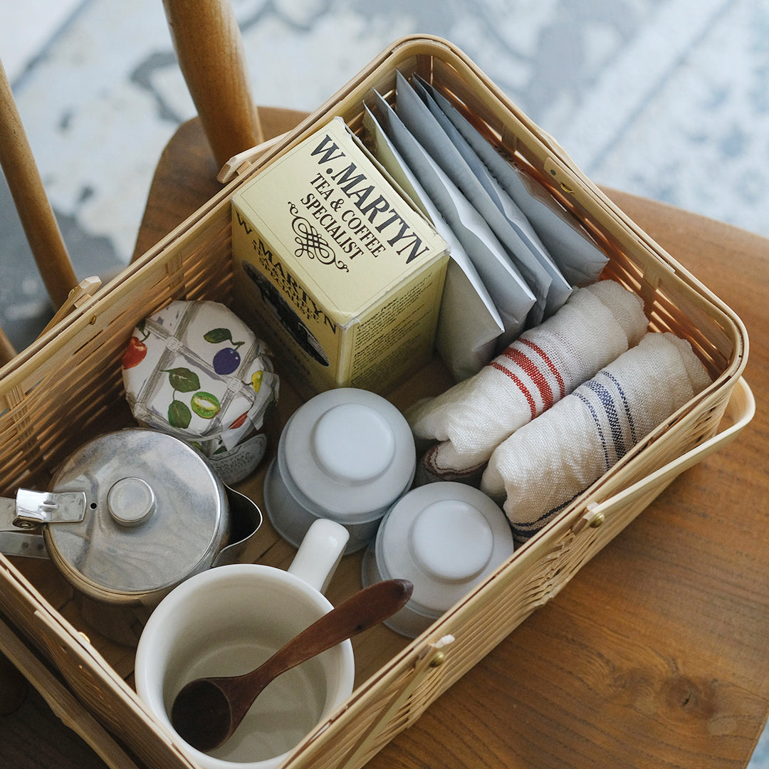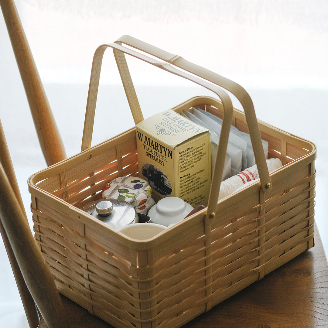 必要だけれど見せたくない生活感のあるものもすっきりと隠してくれる竹かご。取手があるので、お茶やコーヒーのセットを一式入れてそのままキッチンからどこへでも。