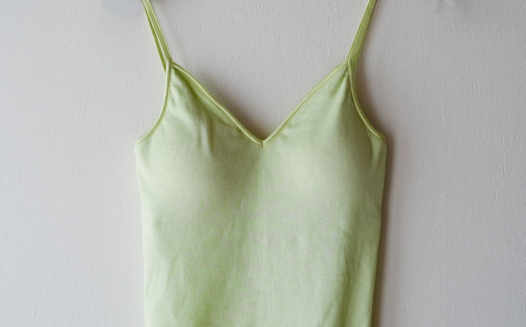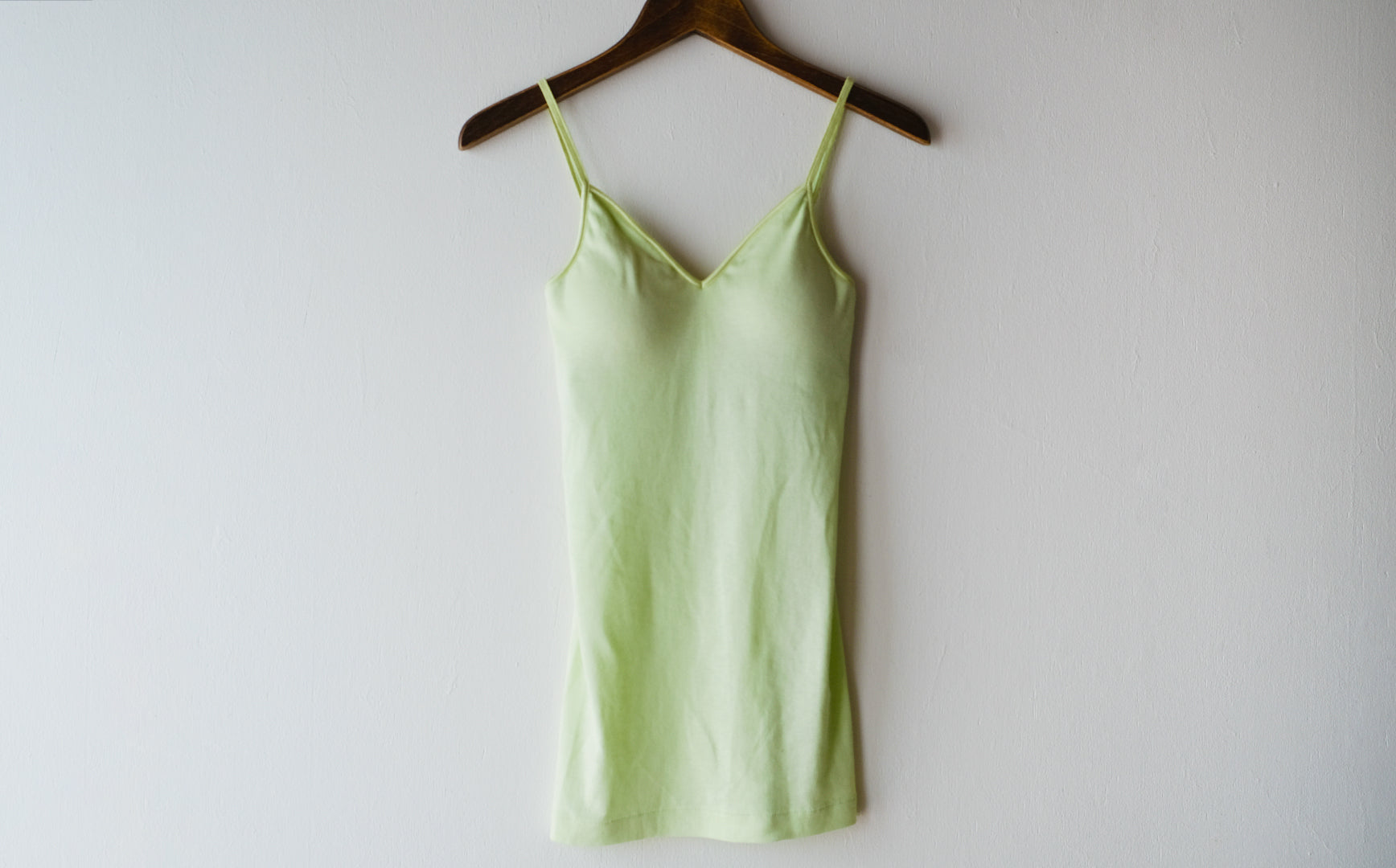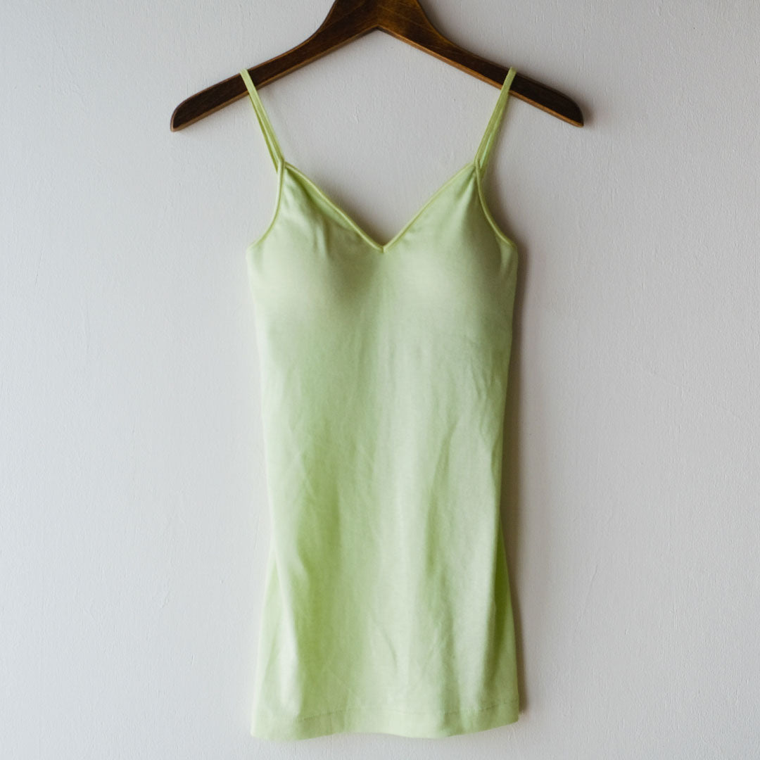 「Souple Luz」のパッド入りのキャミソールは、インナーとして1枚で完結し、オールシーズン頼れるアイテム。爽やかな「ライム」カラーは、植物の持つエネルギーを素肌で感じられます。