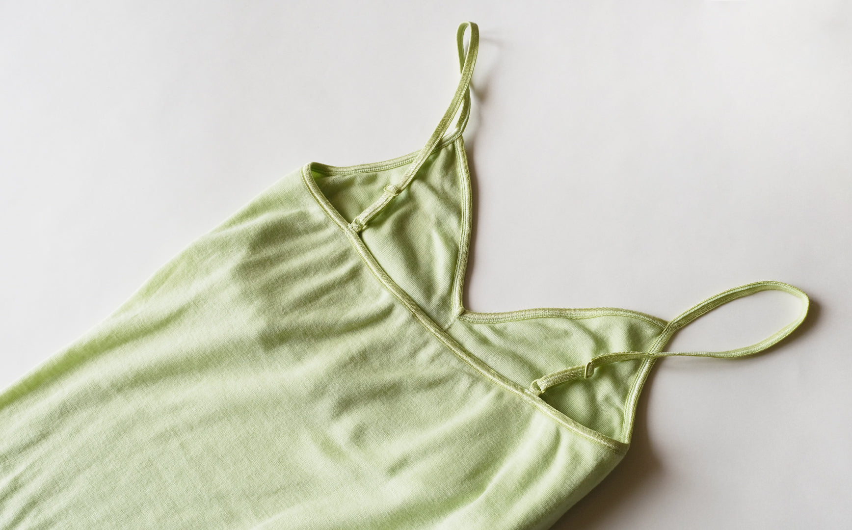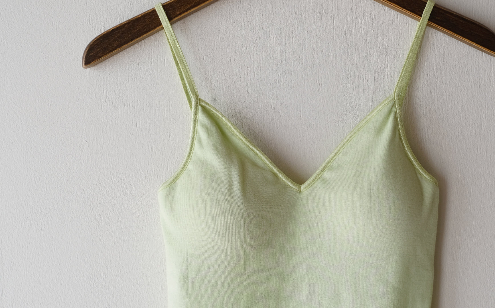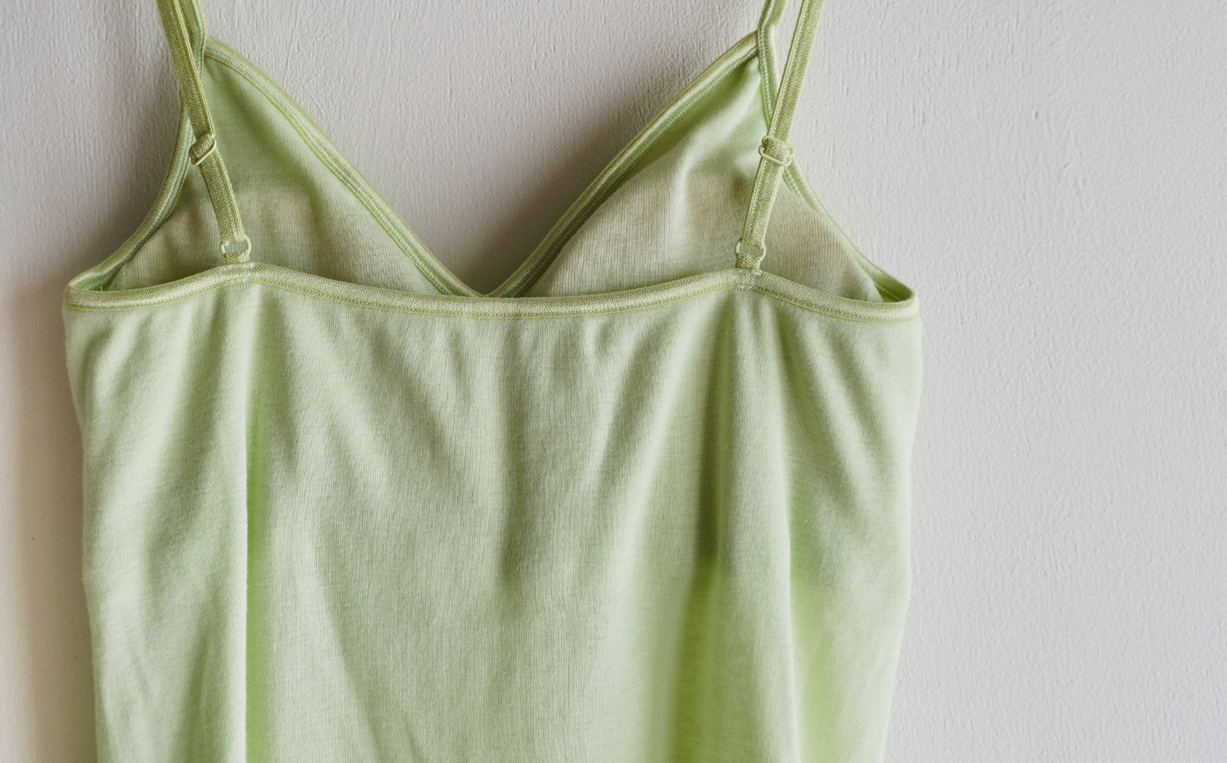 「Souple Luz」のパッド入りのキャミソールは、インナーとして1枚で完結し、オールシーズン頼れるアイテム。爽やかな「ライム」カラーは、植物の持つエネルギーを素肌で感じられます。