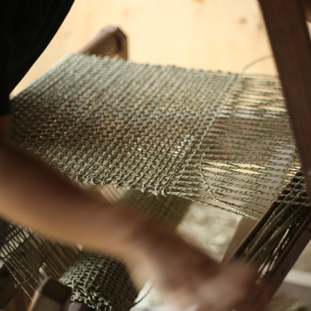 つくり手の須浪隆貴さんにお話しをうかがって驚いたのがその製作工程。てっきりいぐさをそのまま編んでいくのかと思ったら、織物にするのだそうです。