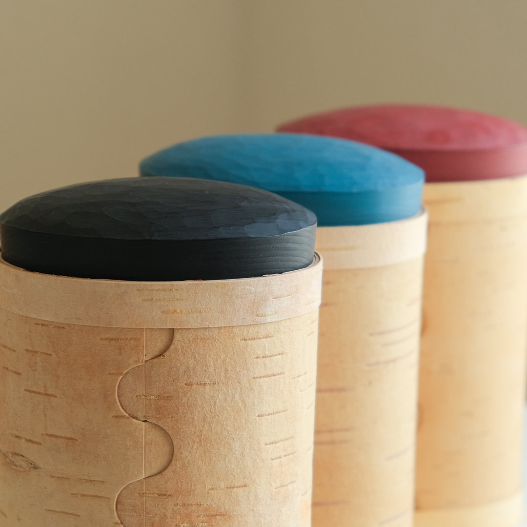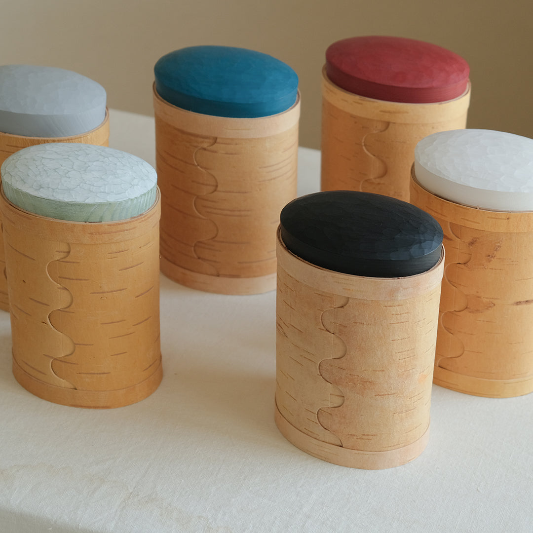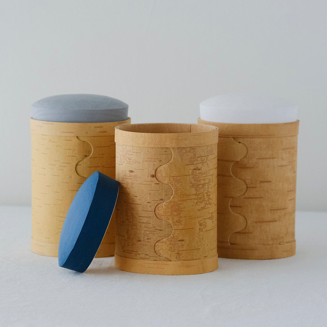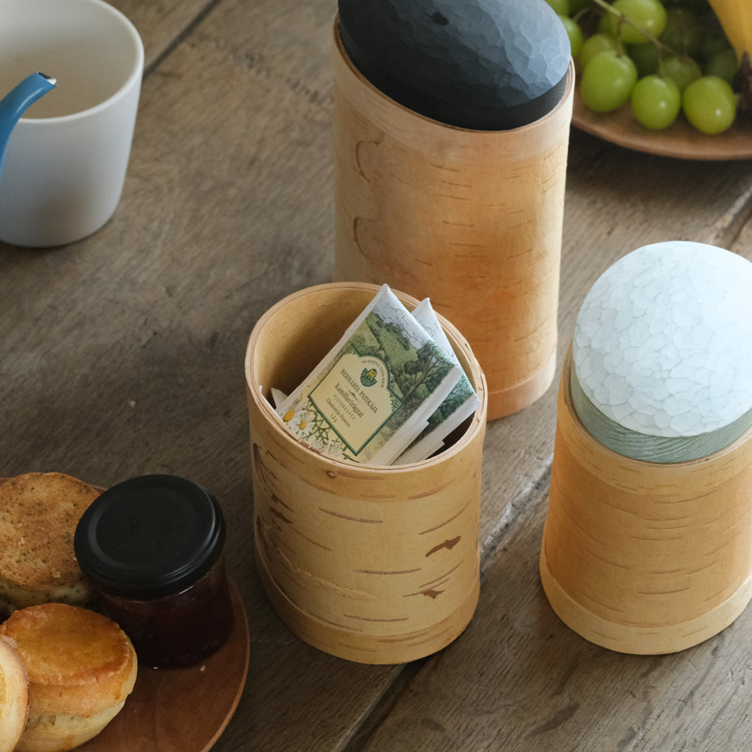 はっとするような色の蓋が目を引くキャニスターは、白樺の樹皮と松の木でつくられています。