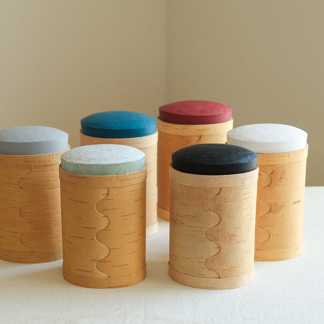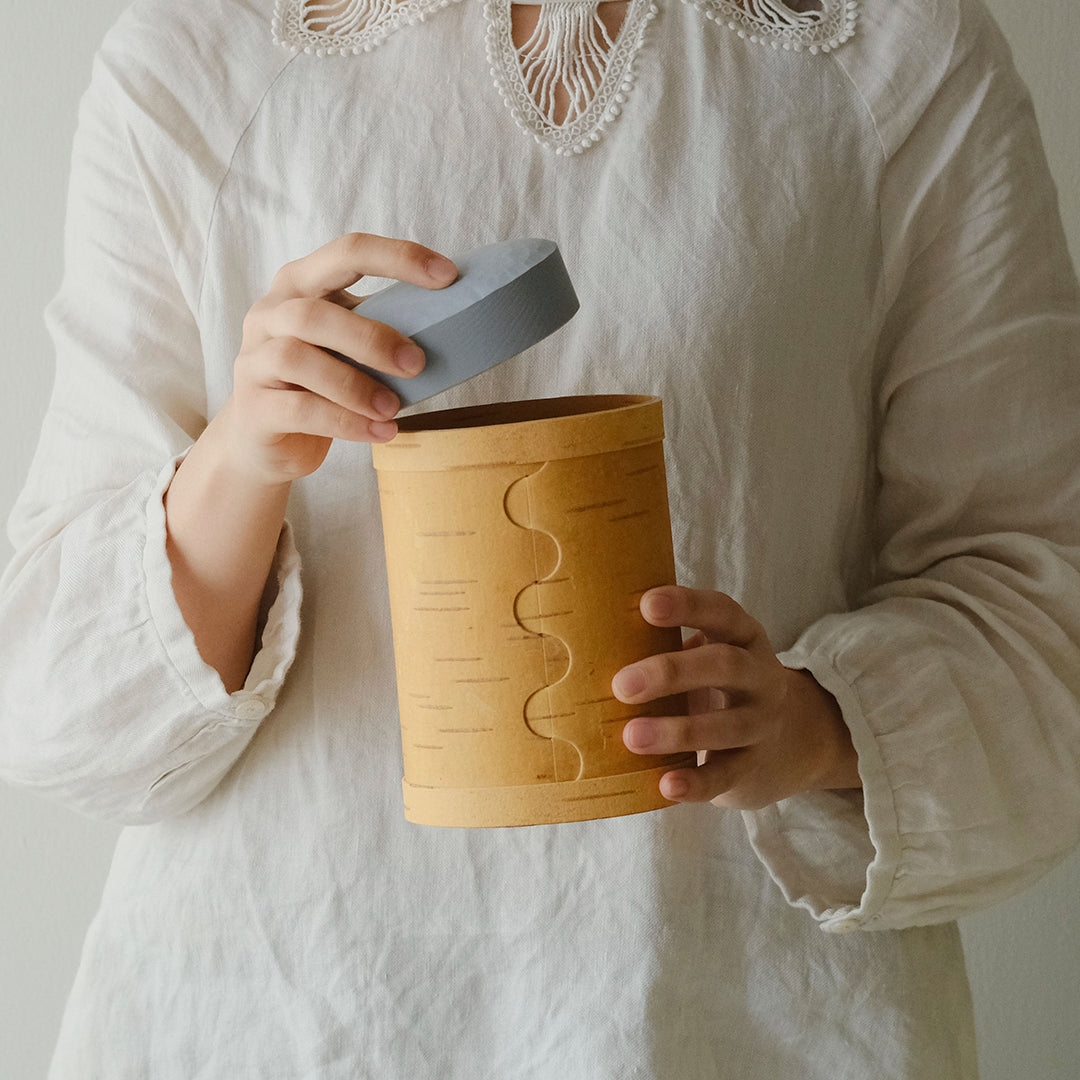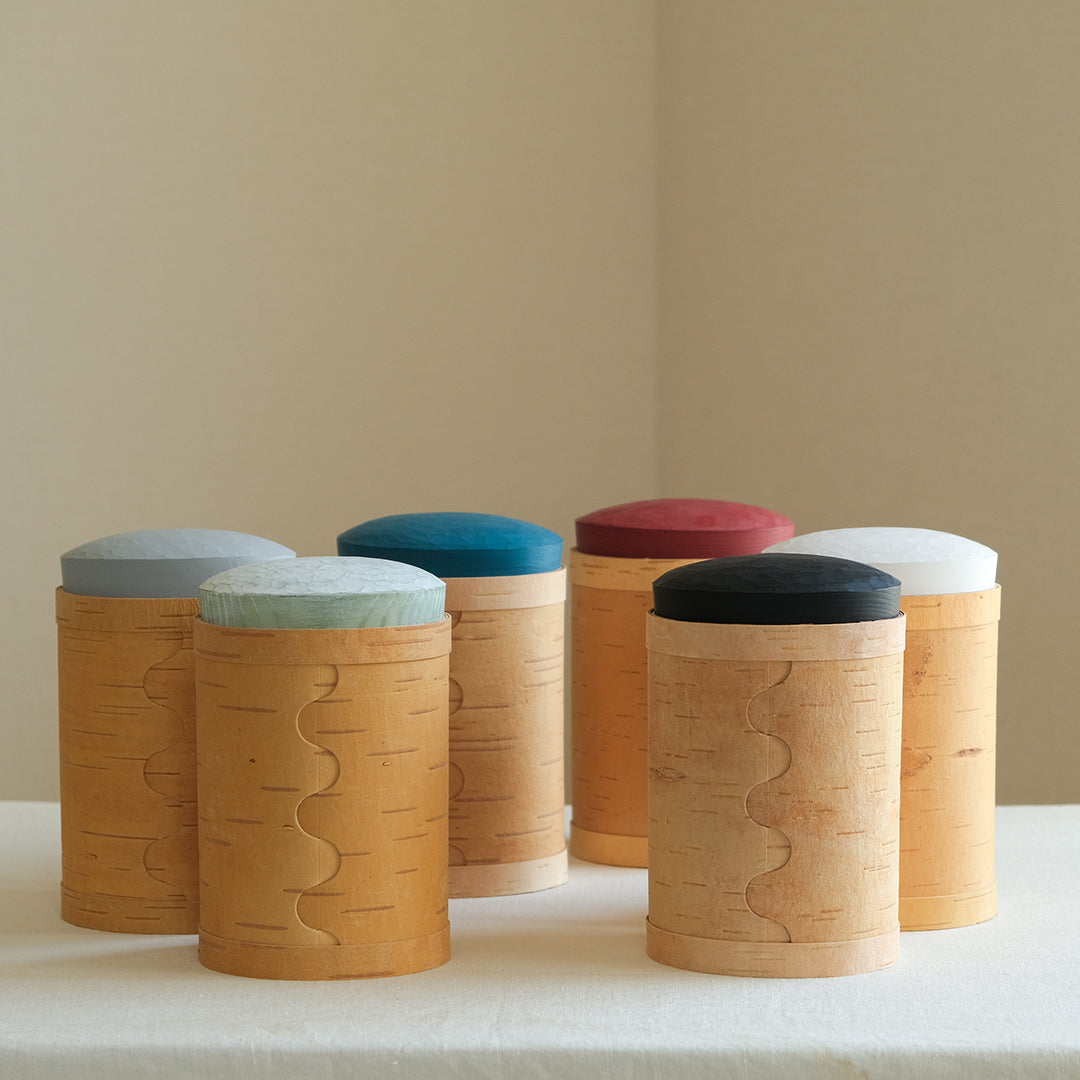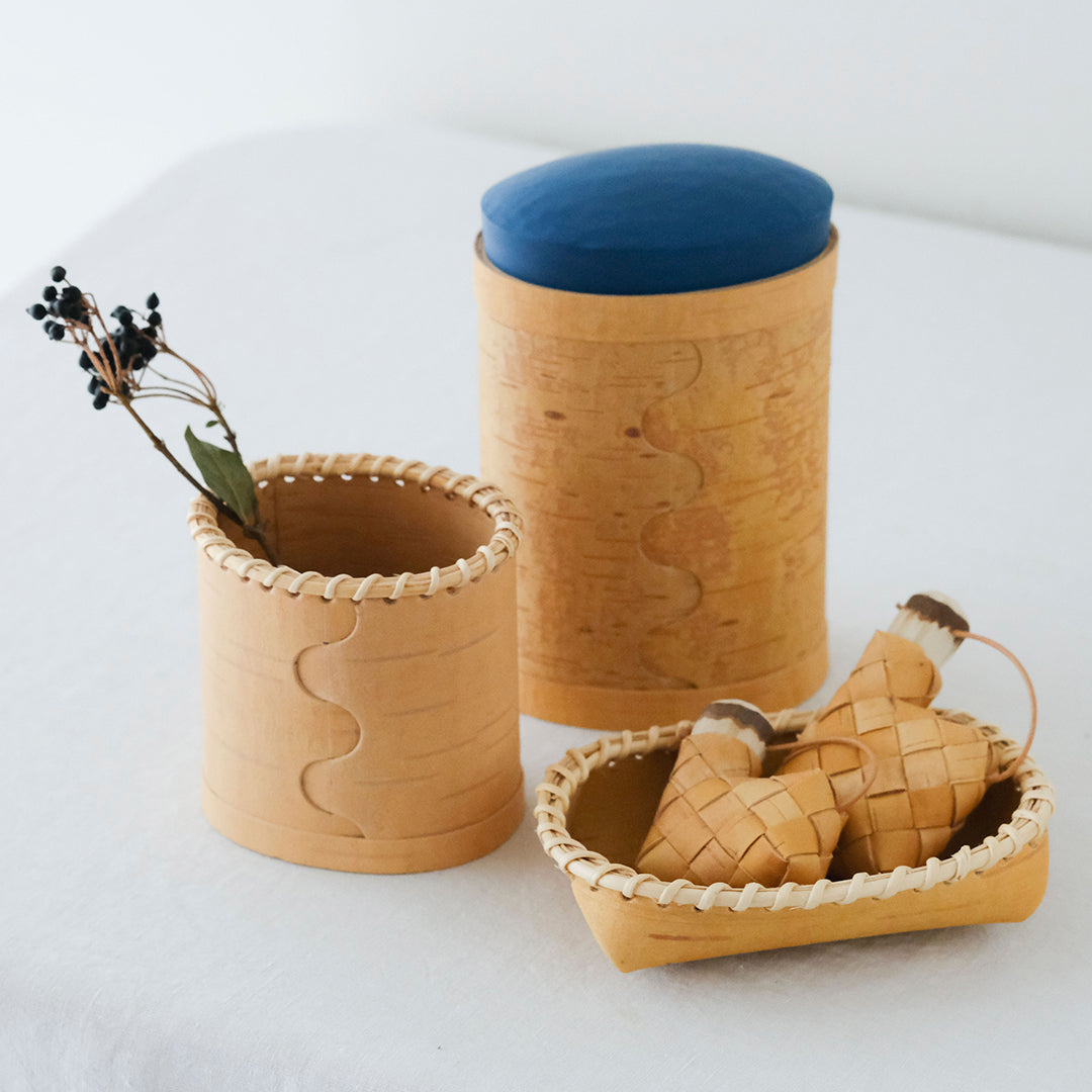 はっとするような色の蓋が目を引くキャニスターは、白樺の樹皮と松の木でつくられています。