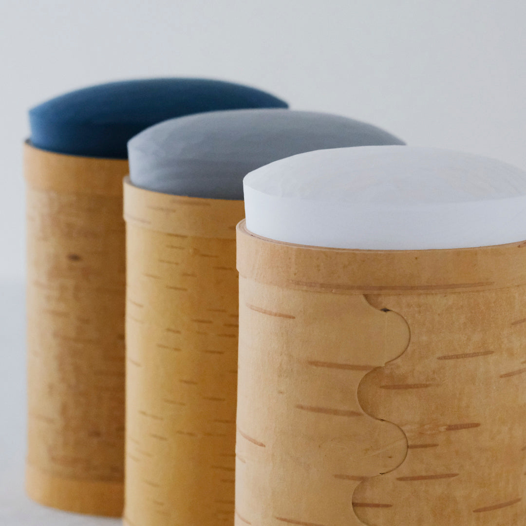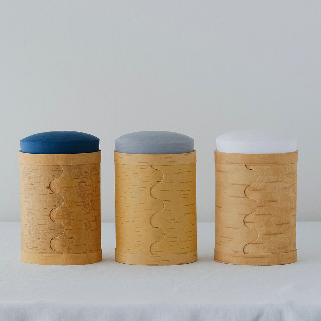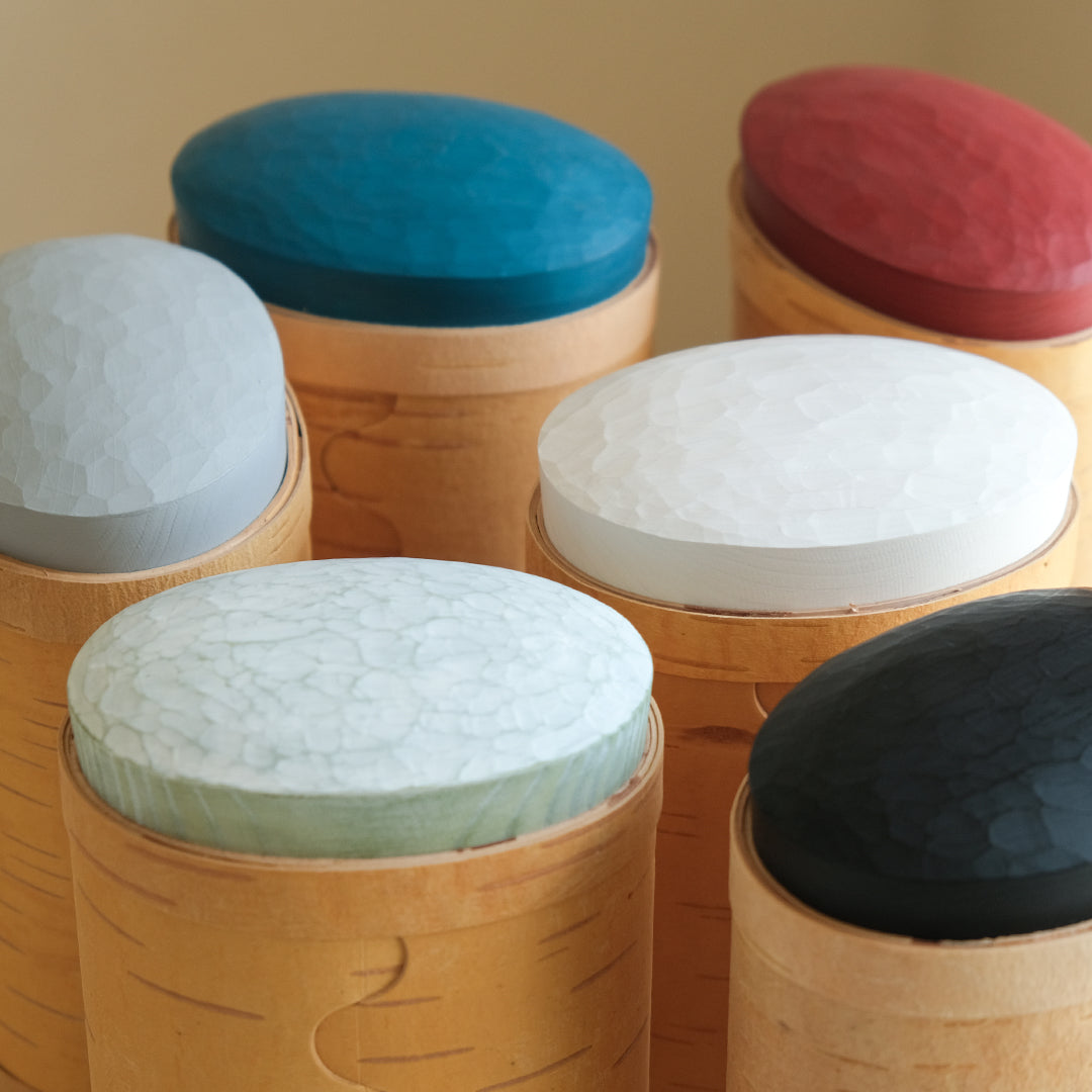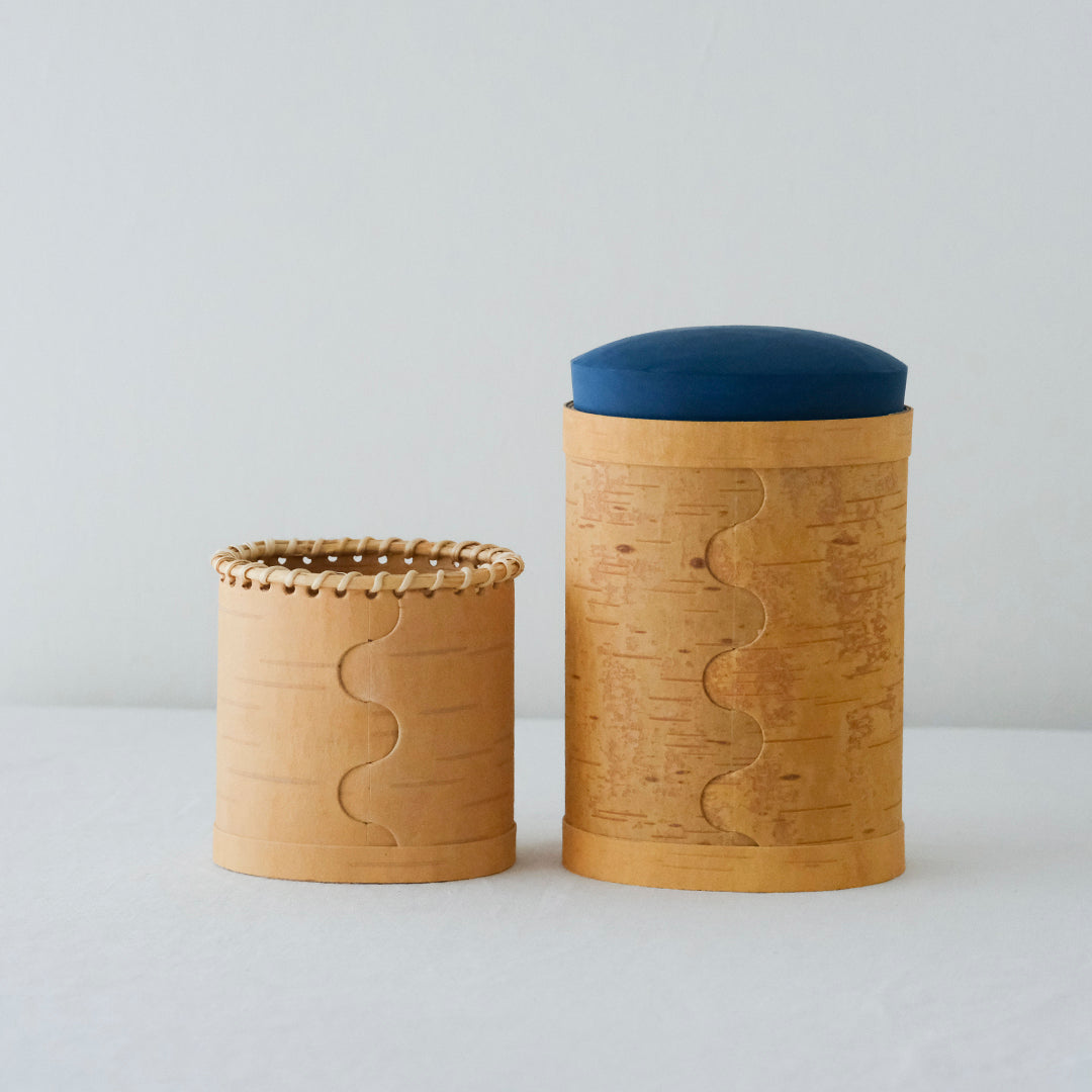 はっとするような色の蓋が目を引くキャニスターは、白樺の樹皮と松の木でつくられています。