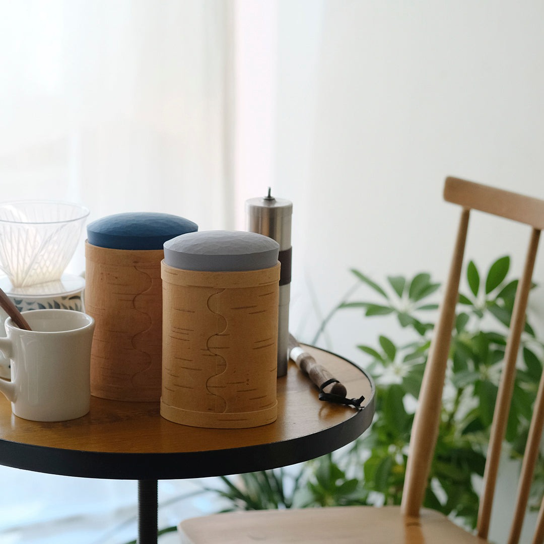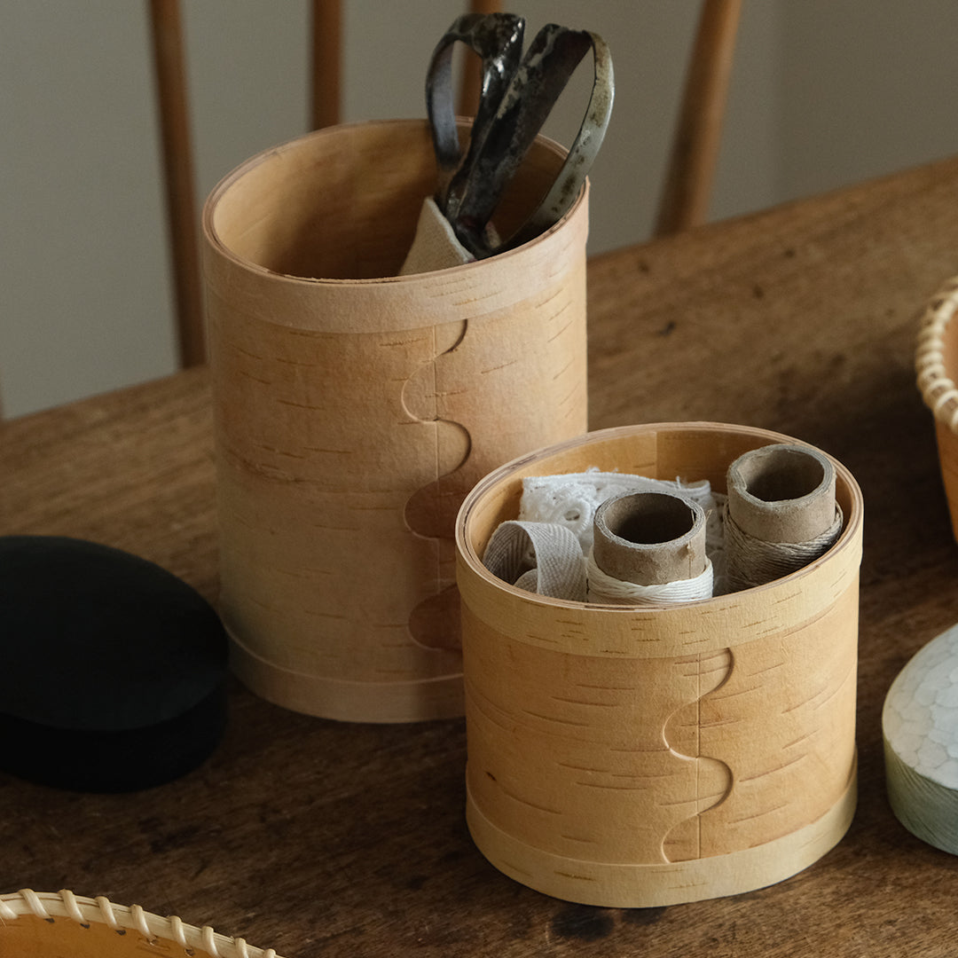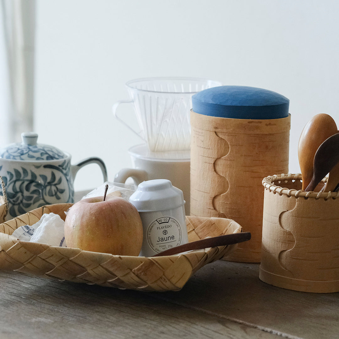 スウェーデンの古くからの生活を伝えるように、伝統的な技術で白樺のかごをつくる迫田希久さん。カラフルな蓋のキャニスター「Burk」シリーズより、大サイズをご紹介します。