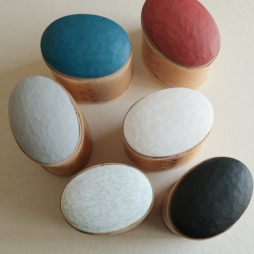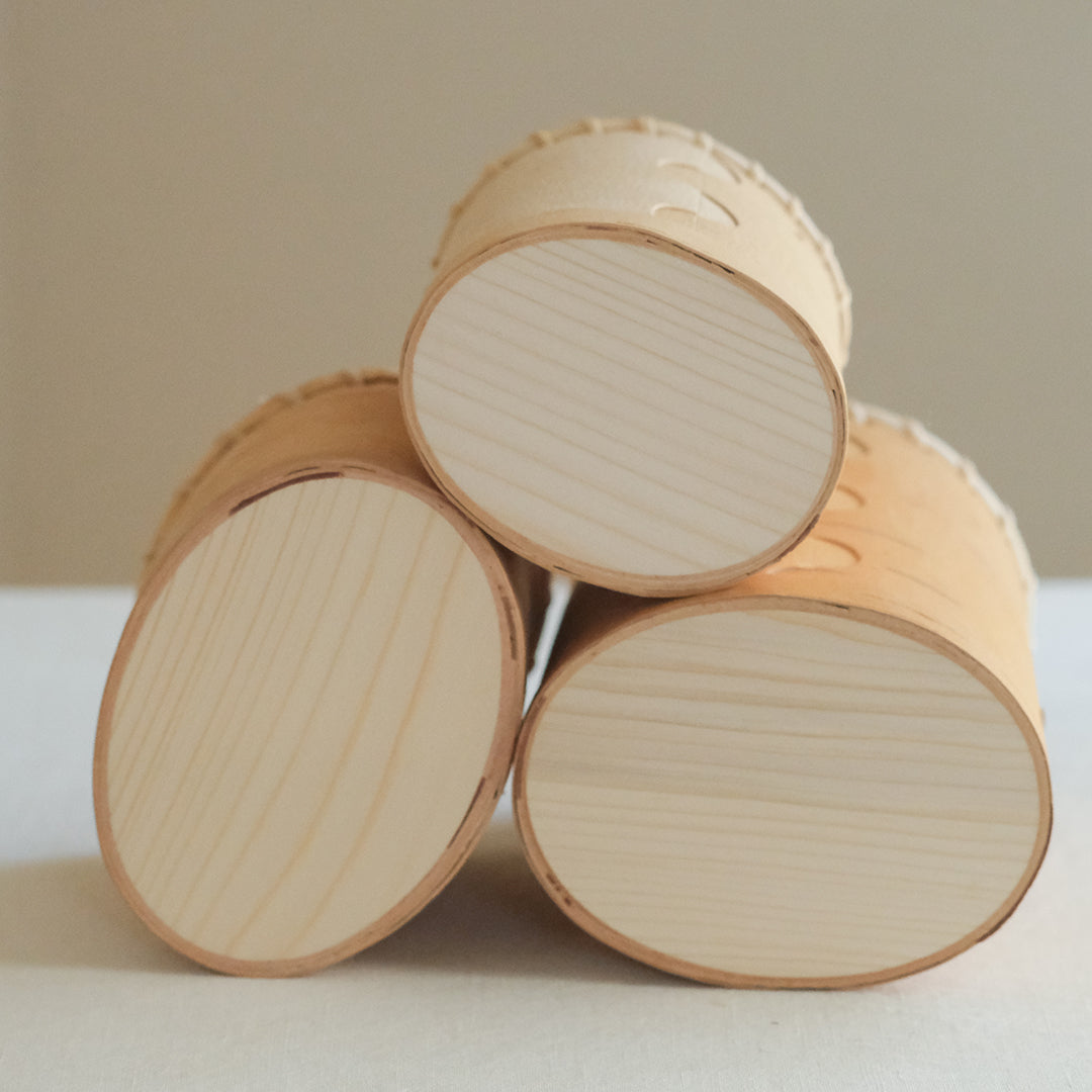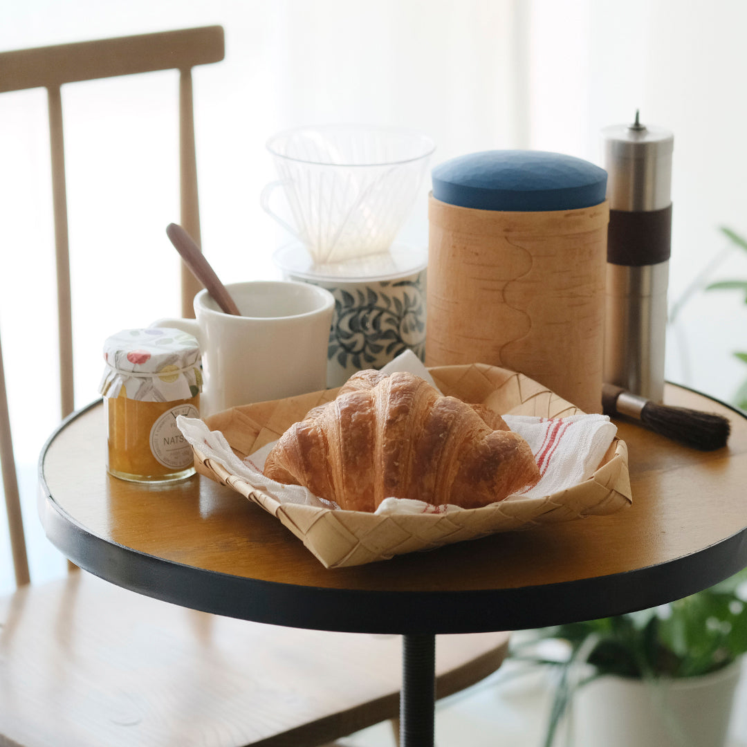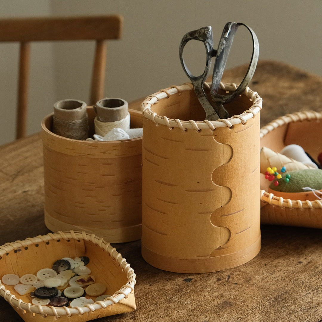 スウェーデンの古くからの生活を伝えるように、伝統的な技術で白樺のかごをつくる迫田希久さん。カラフルな蓋のキャニスター「Burk」シリーズより、大サイズをご紹介します。
