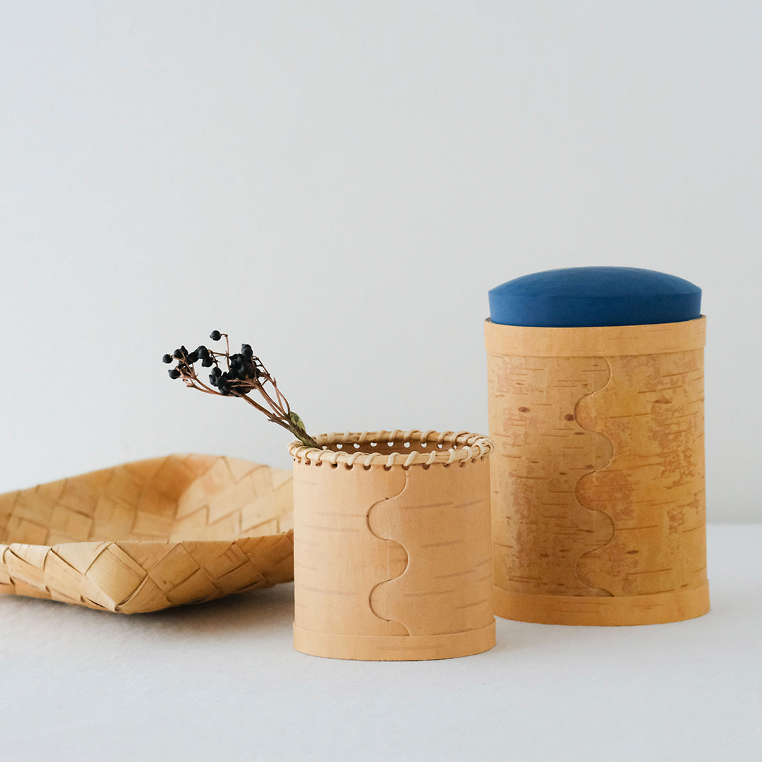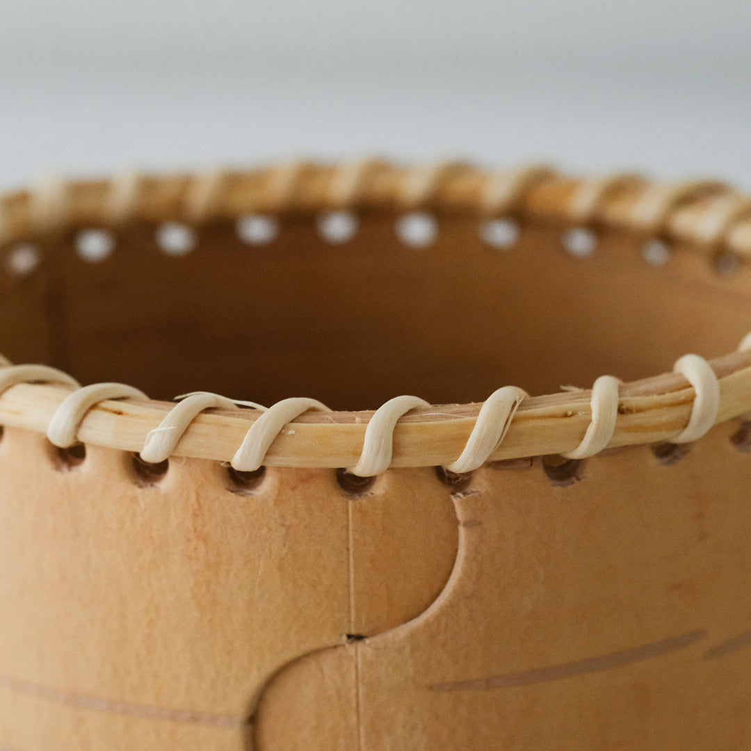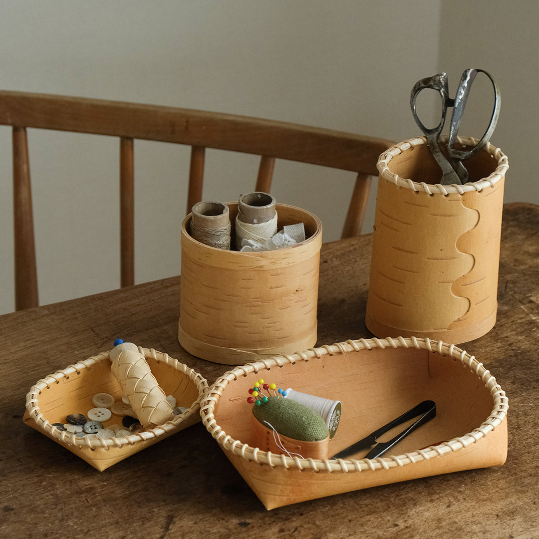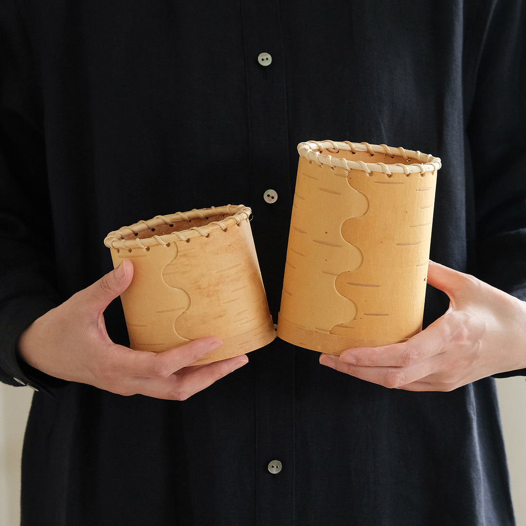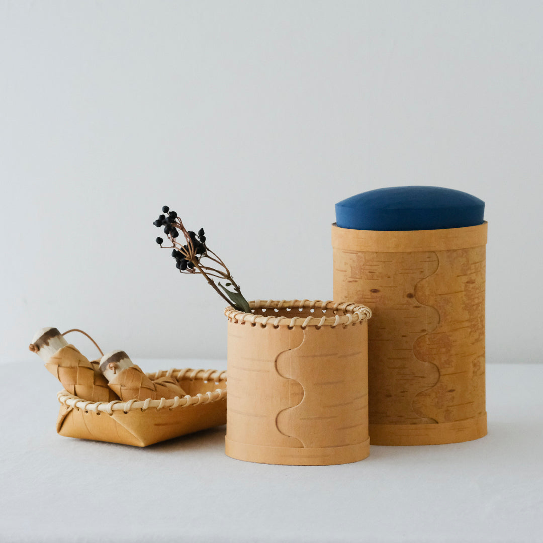 小さな動物がひょっこりと顔を出しそうな、白樺樹皮でつくられたやさしい雰囲気のお道具立て。森の中から借りてきたかのような自然の恵みが感じられます。▲中S