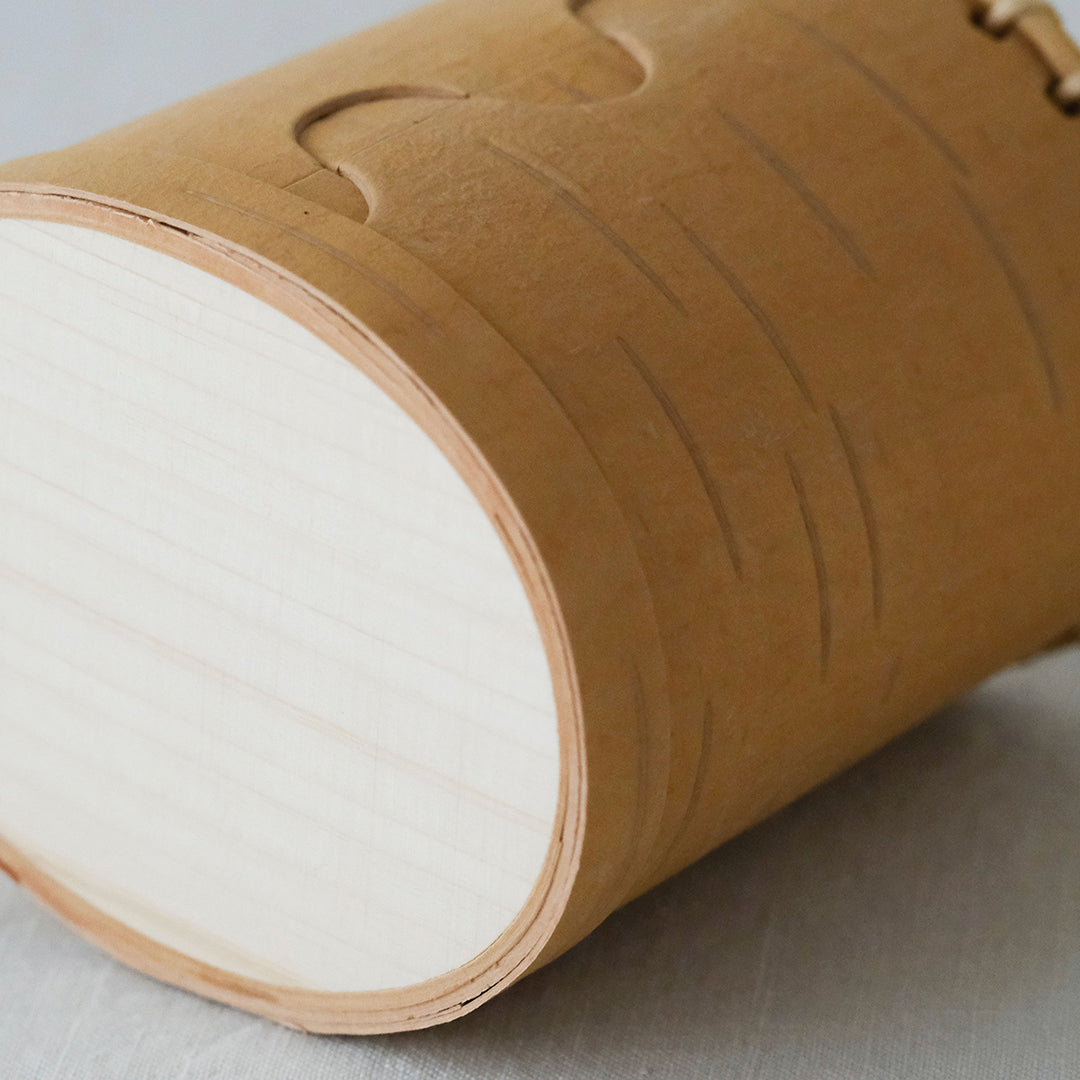 丸い刃物で形づくったパーツを、光を透過するくらいまで薄く削ぎ落し、はめ込みます。外側と内側、計2枚の樹皮をくるりと合わせて。