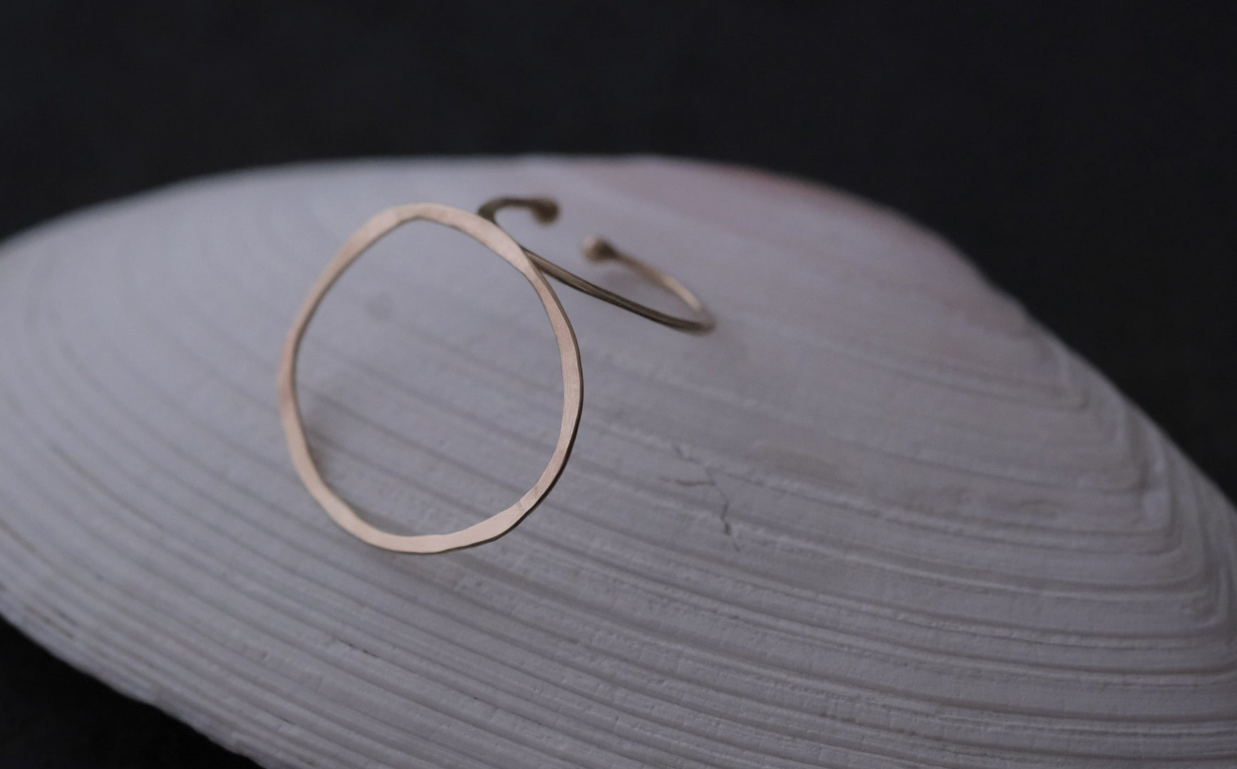 Rippleシリーズでイメージしたのは、水面に小石を落とした時に広がる波紋。10金で輪っかをつくり、トントントンと金槌でかたちづくられています。