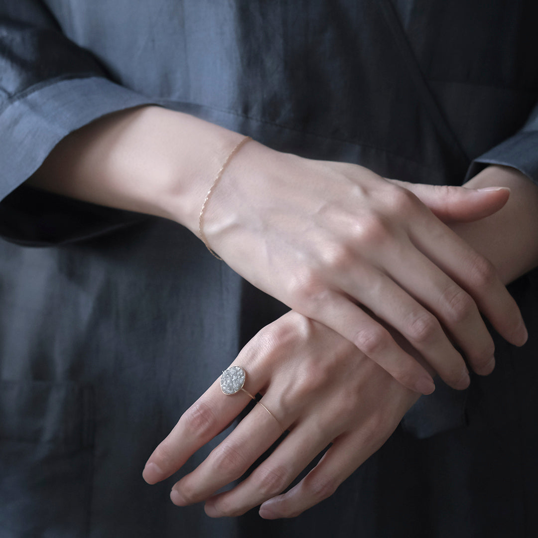 Atelier elのNilasシリーズは、自然な模様をまとったスライスローズカットのダイヤモンドの欠片を敷きつめてつくられています。
