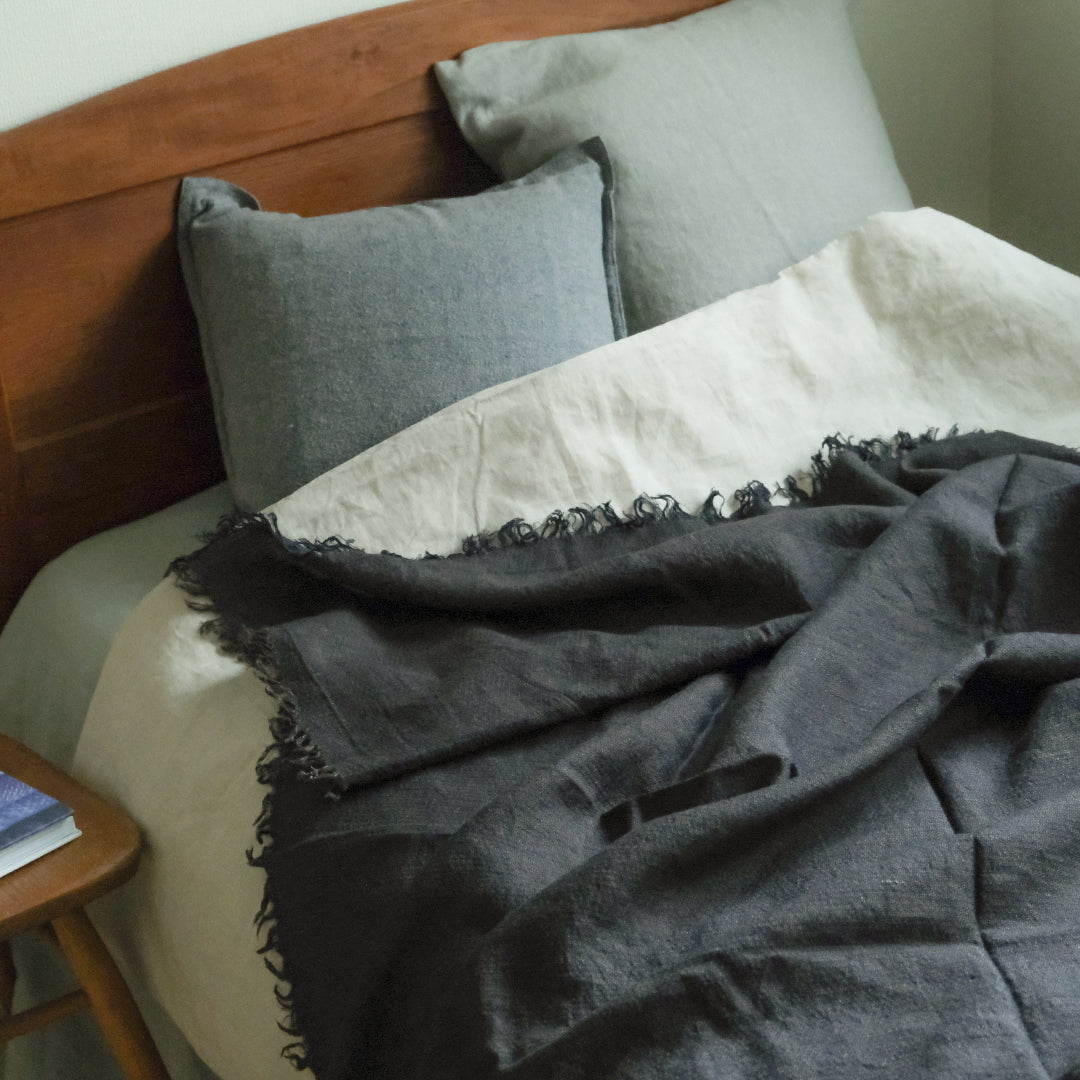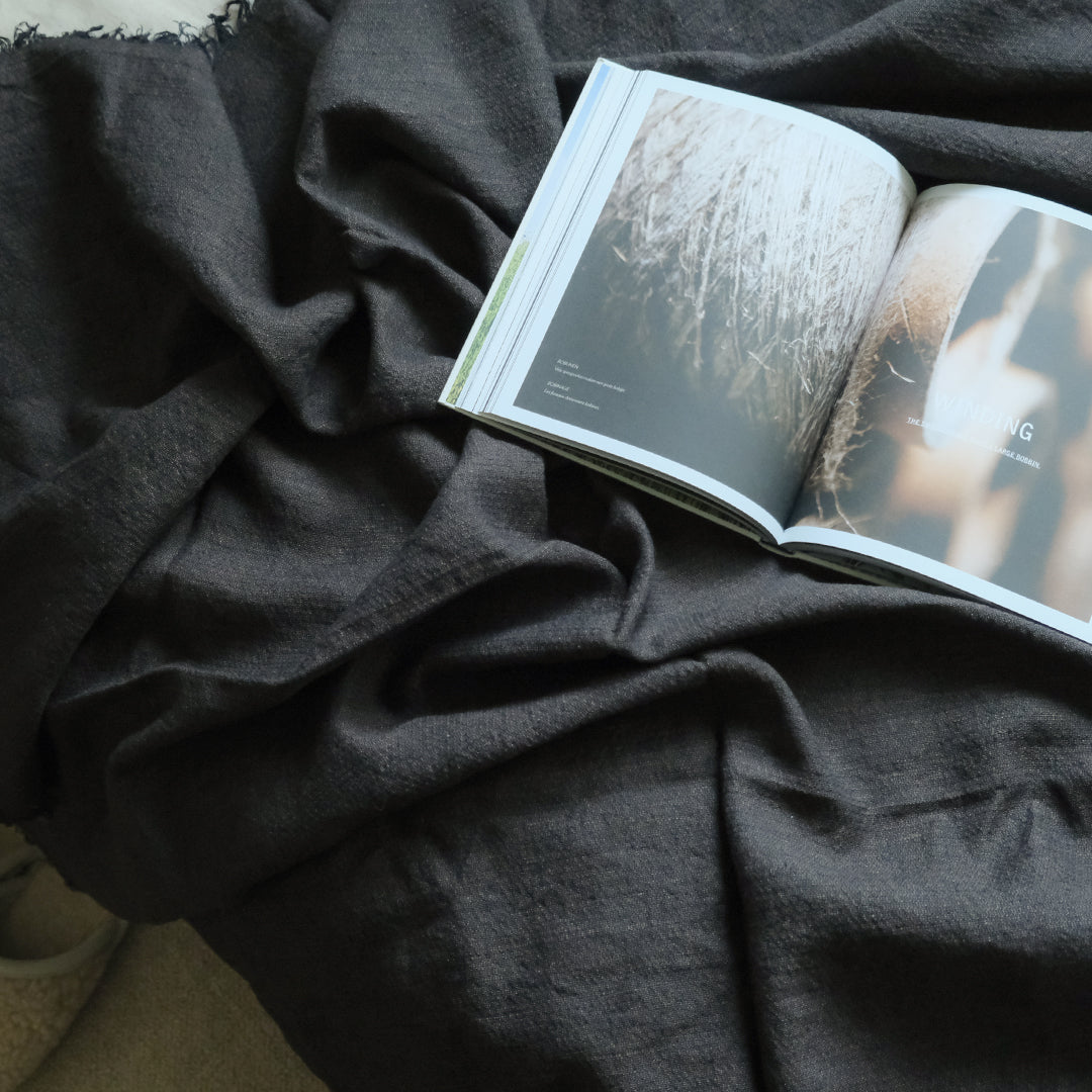 ほどよいボリューム感はひざ掛けやブランケットにもピッタリ。カラーはブラックとブラウン×ブラックにタン×ブルーの3色。2色の糸を使っているブラウン×ブラックとタン×ブルーは、フリンジの色が縦と横と異なり、独特の雰囲気が楽しめます。