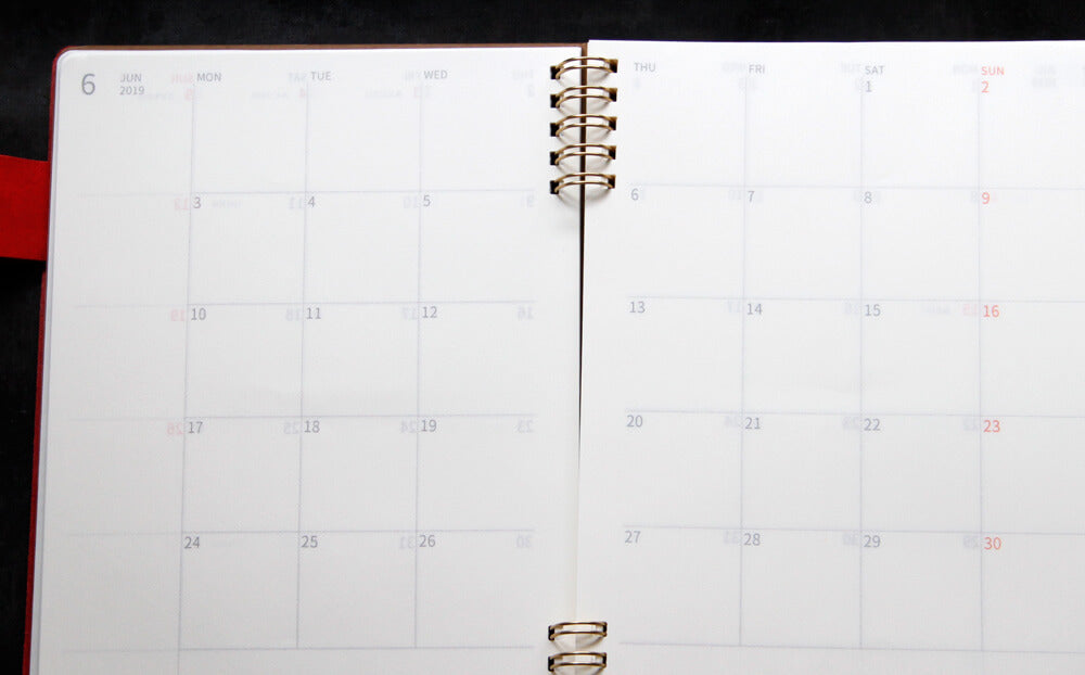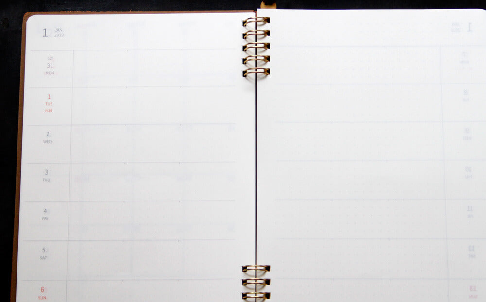 革の手帳をお送りいただくと、来年用の中紙をセットしてお送りします。手帳のカレンダータイプは月間のみか月間+週間を、フリーページは無地か方眼をご希望の中身をお選びください。