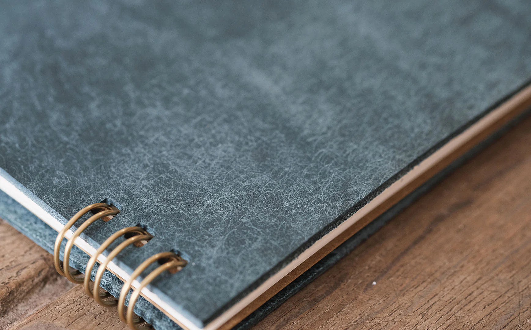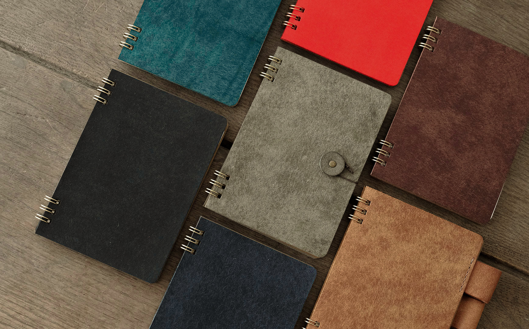 「旅人が持っていそうなノート、カフェで思いついたアイディアを書き留めるノート。革のカバーは使っていくうちにいい味が出て、中紙はなめらかな書き心地で自由な気持ちで綴ることができる」