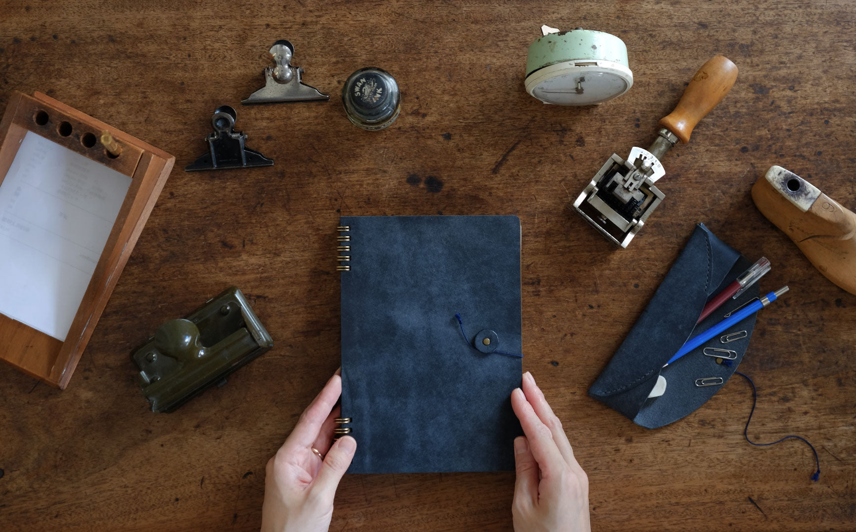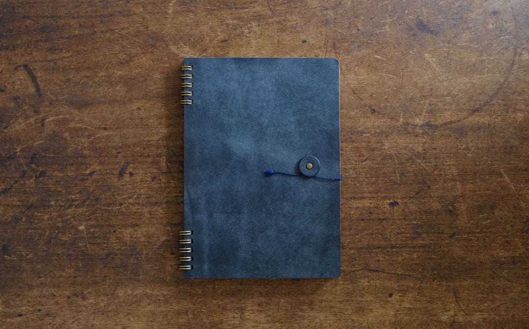 「旅人が持っていそうなノート、カフェで思いついたアイディアを書き留めるノート。革のカバーは使っていくうちにいい味が出て、中紙はなめらかな書き心地で自由な気持ちで綴ることができる」