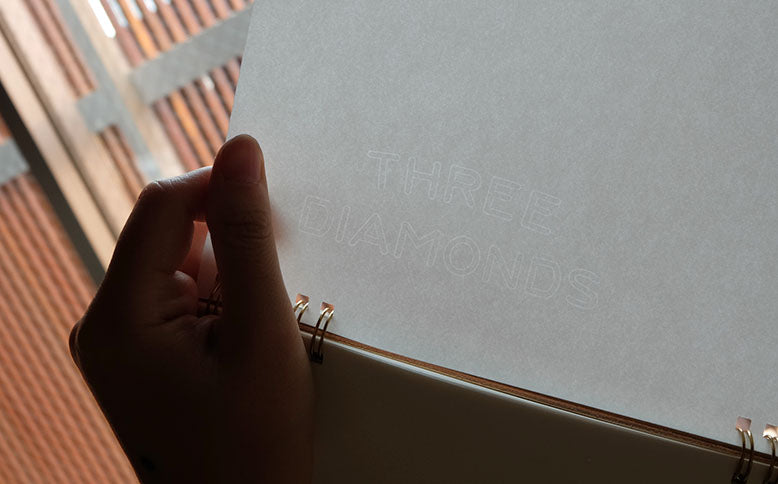 ▲紙を透かしてみると、「THREE DIAMONDS」の文字(一部のページのみ)