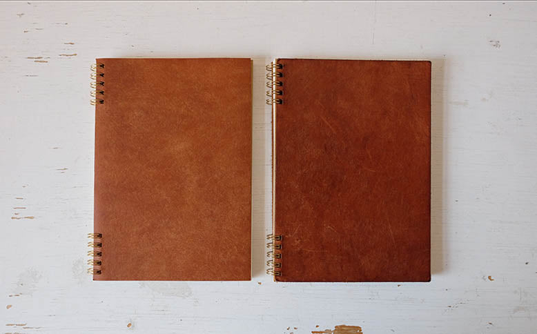 最初はマットでも、使い込むうちにどんどん艶が増していき、経年変化を楽しめます。左:新品、右:2年使用したもの(色はキャメル)▲写真はA5サイズです