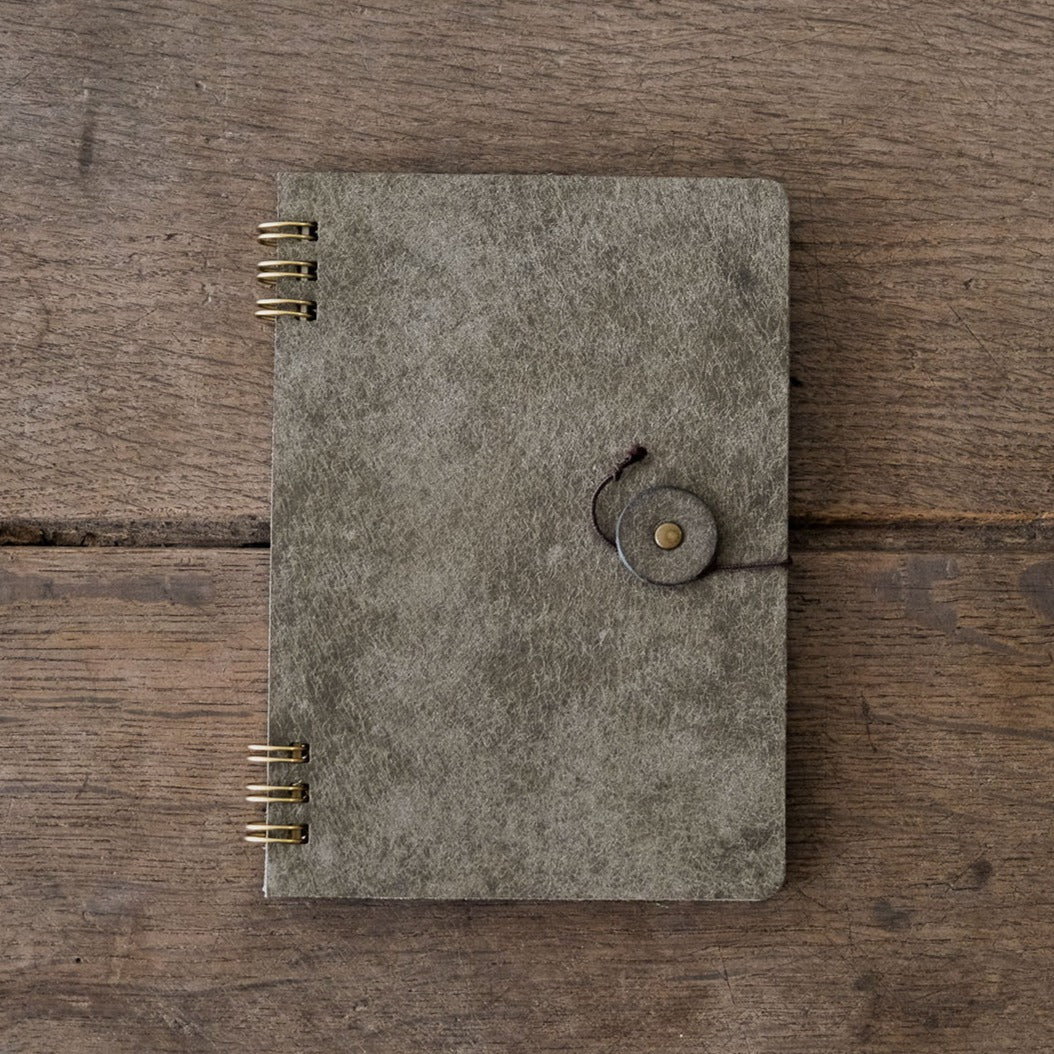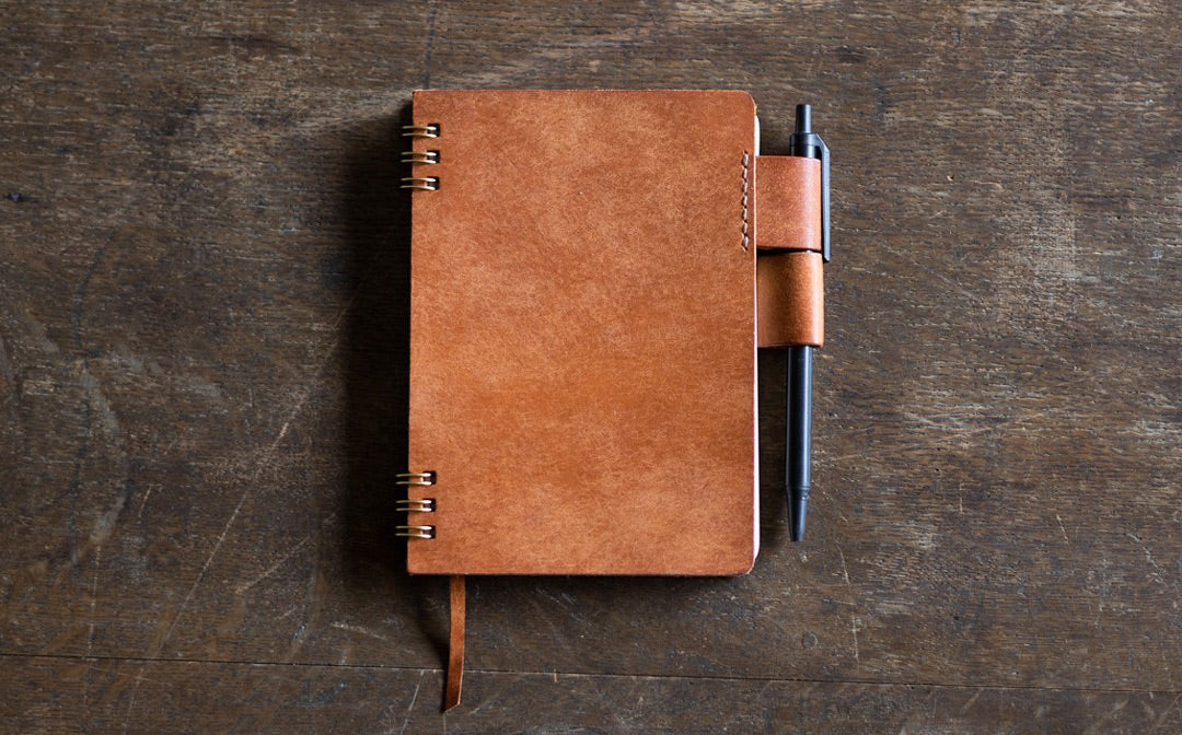 「旅人が持っていそうなノート、カフェで思いついたアイディアを書き留めるノート。革のカバーは使っていくうちにいい味が出て、中紙はなめらかな書き心地で自由な気持ちで綴ることができる」