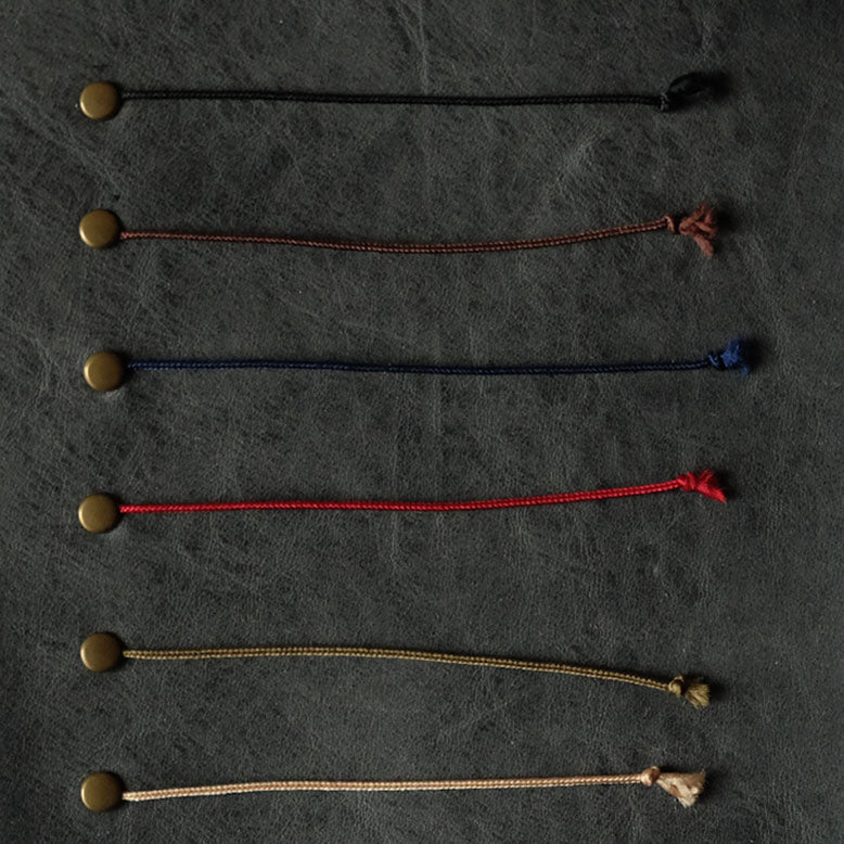 裏表紙に小さなカシメで留めてあるので、しおりを落とす心配もありません。2本ご希望の場合は、2本目を表表紙に増やすことができます。