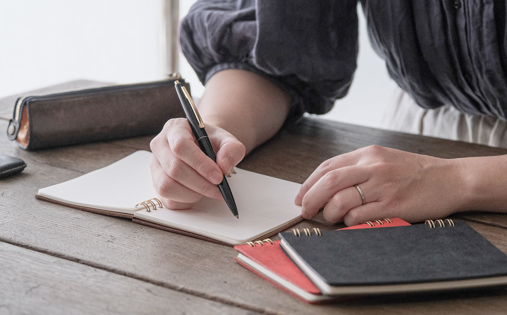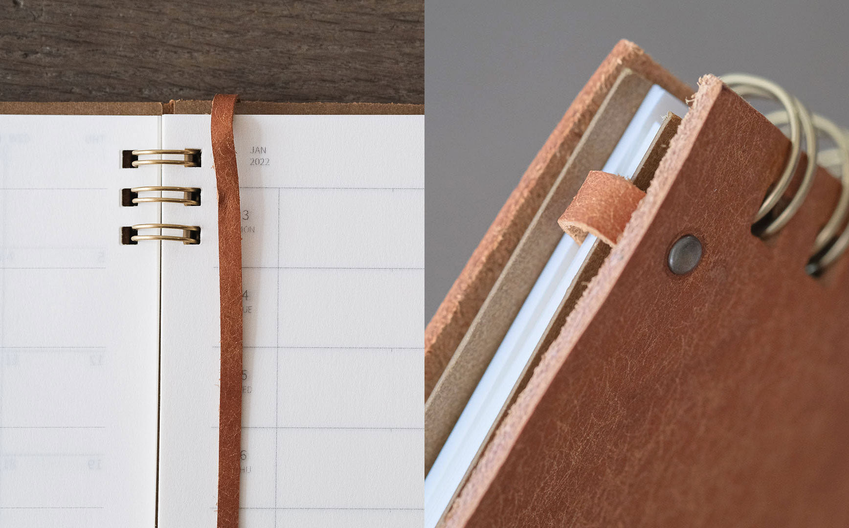 手帳は全て、リングでとじています。取り外しができるので、中紙を替えれば革の表紙はそのまま使いつづけることができます。▲真ん中のリングがないため、書くときに邪魔になりません
