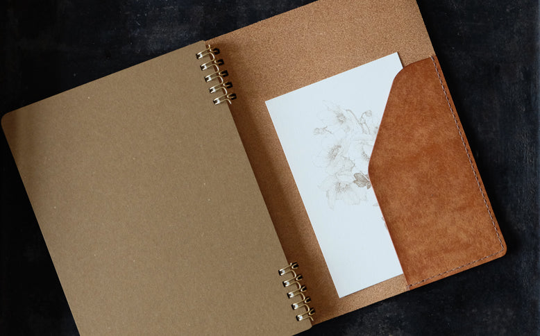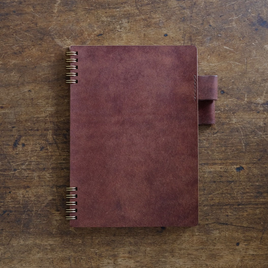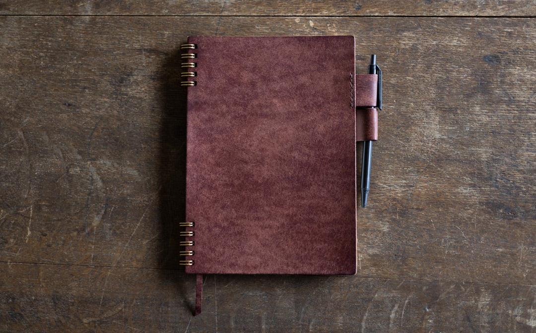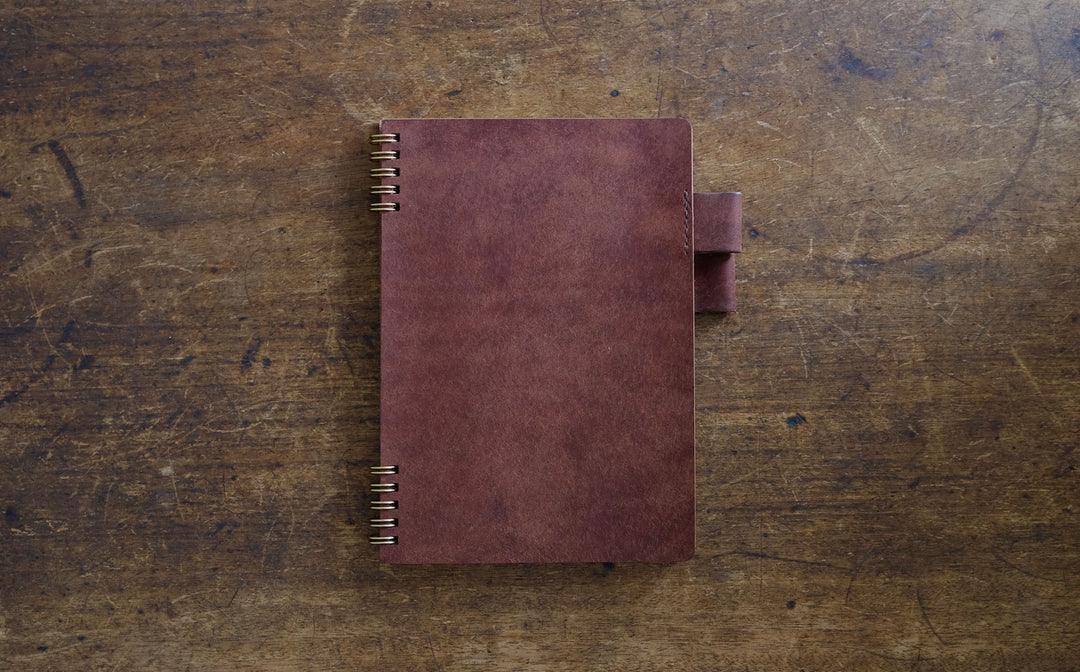 「旅人が持っていそうなノート、カフェで思いついたアイディアを書き留めるノート。革のカバーは使っていくうちにいい味が出て、中紙はなめらかな書き心地で自由な気持ちで綴ることができる」