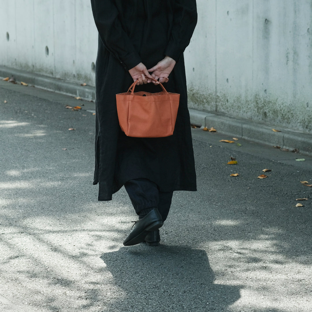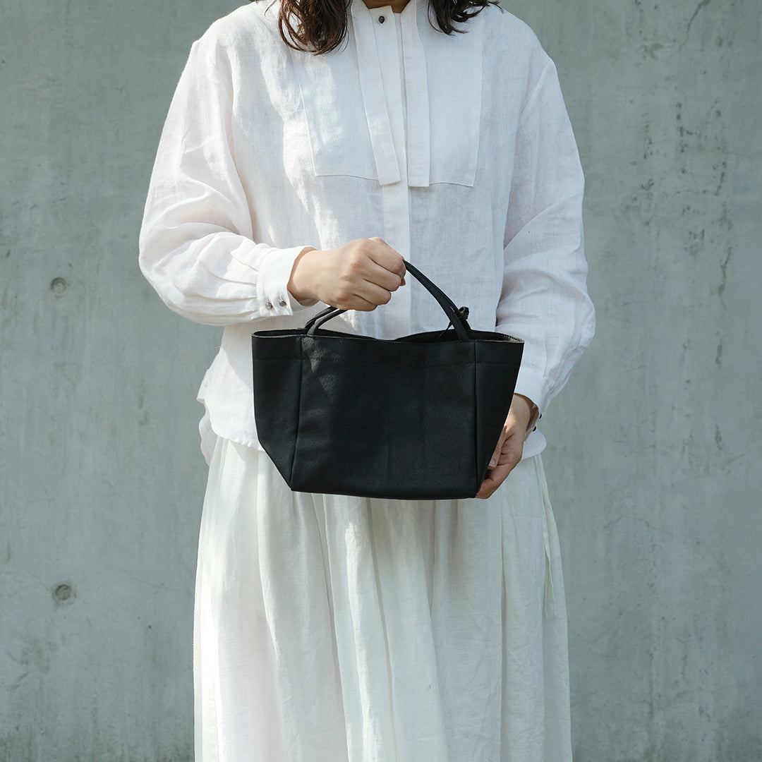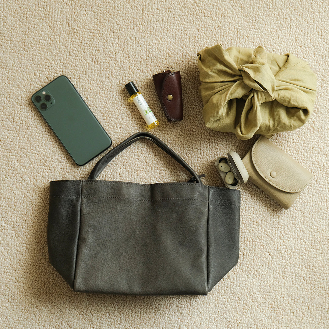 デザインはファスナーや金具がない潔さ。口を開けば中身が一目瞭然、必要なものがさっと取り出せるシンプル設計です。