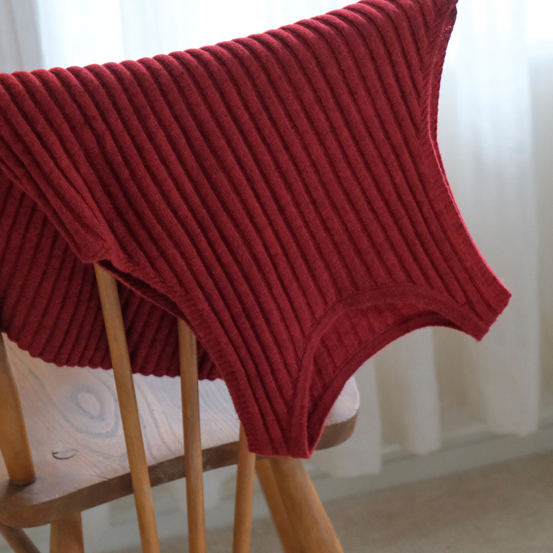 ボディ部分はふっくらと幅をもたせたアゼ編み。やわらかく身体にフィットして背中もしっかりとあたたかいデザインです。