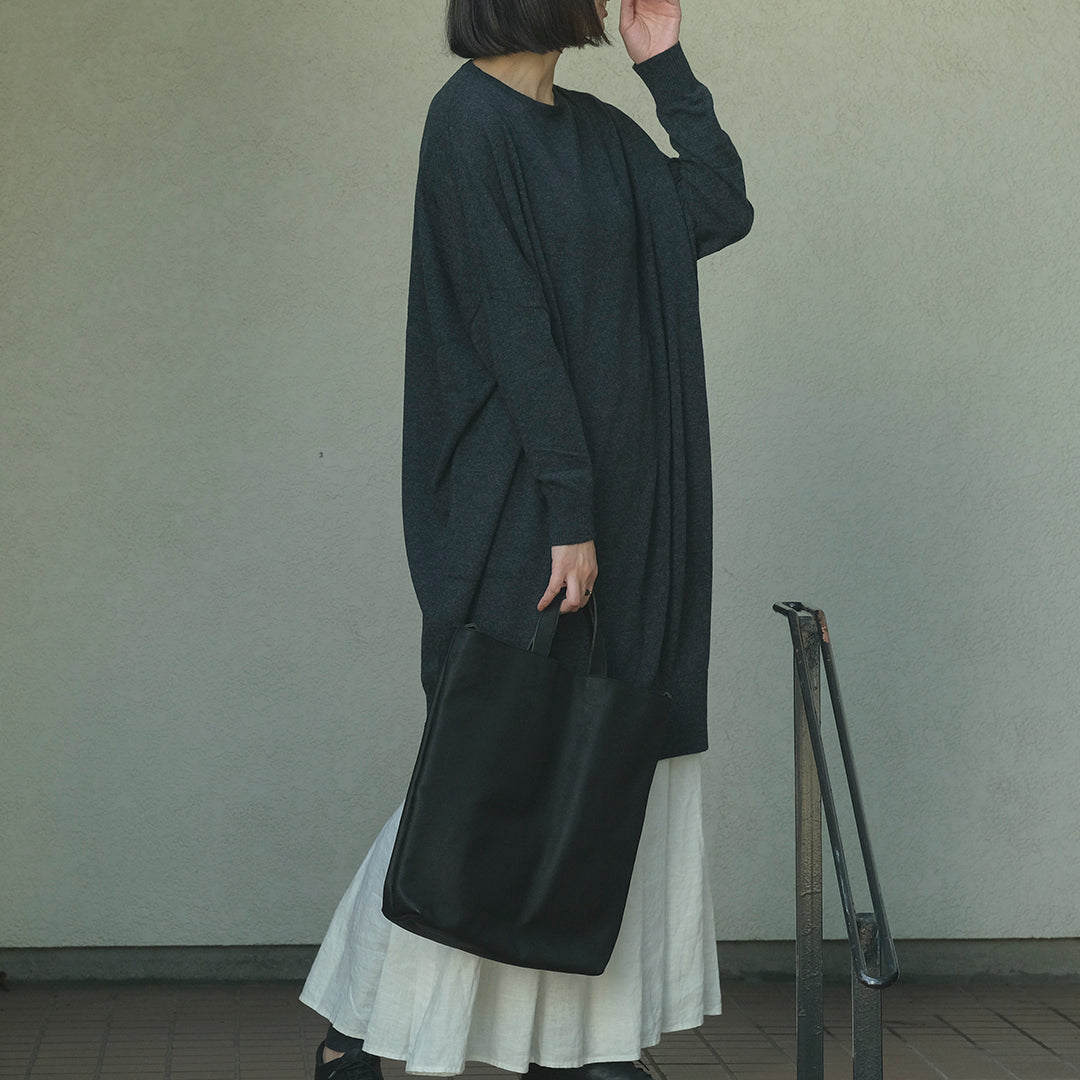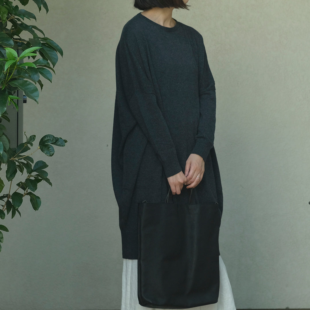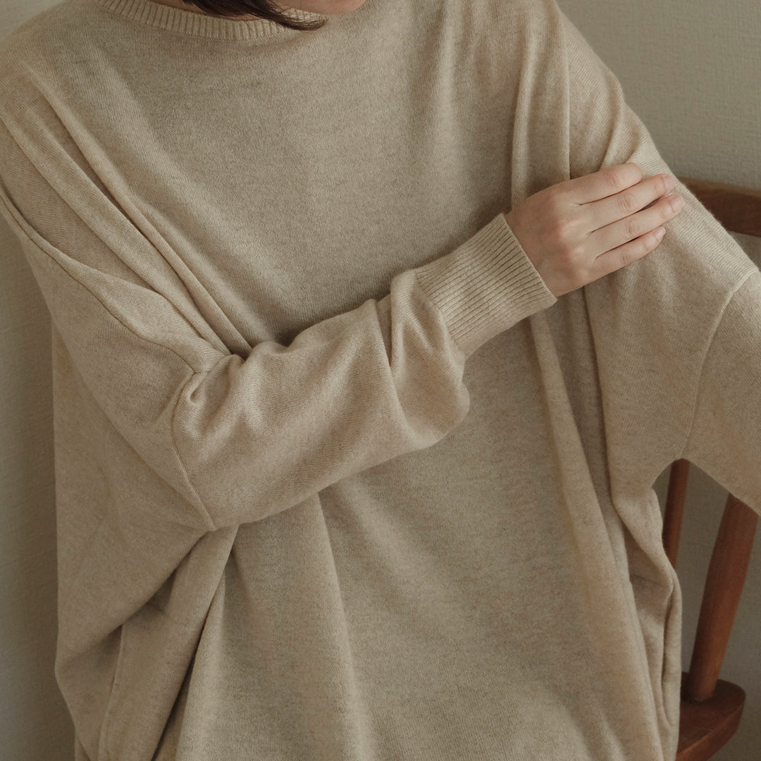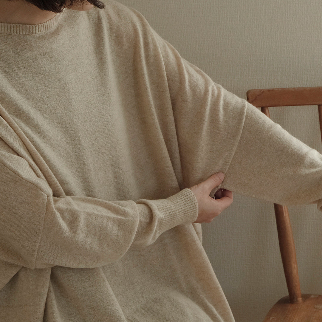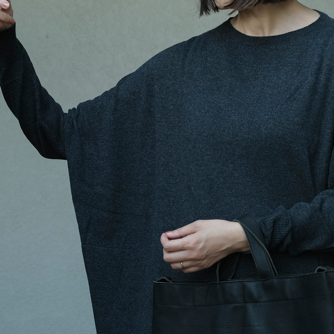 ゆったりとした着心地でシンプルな身頃と、肩を落としたドルマンなシルエットがゆったり大人な雰囲気の一枚。