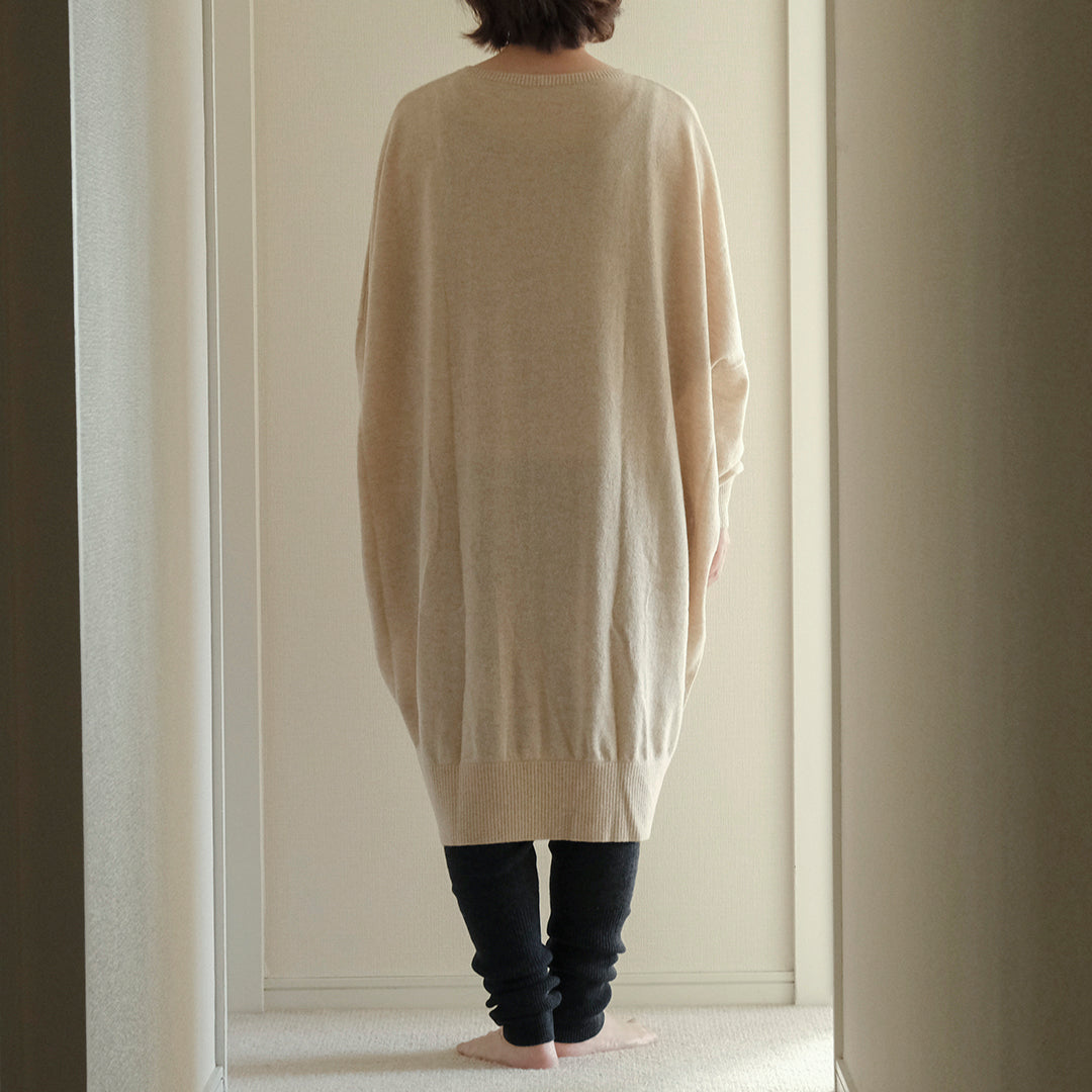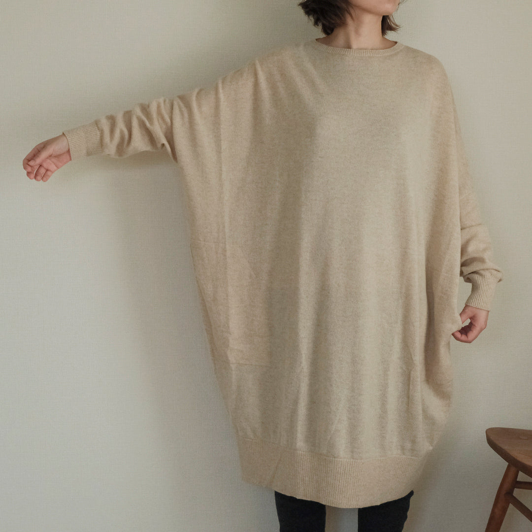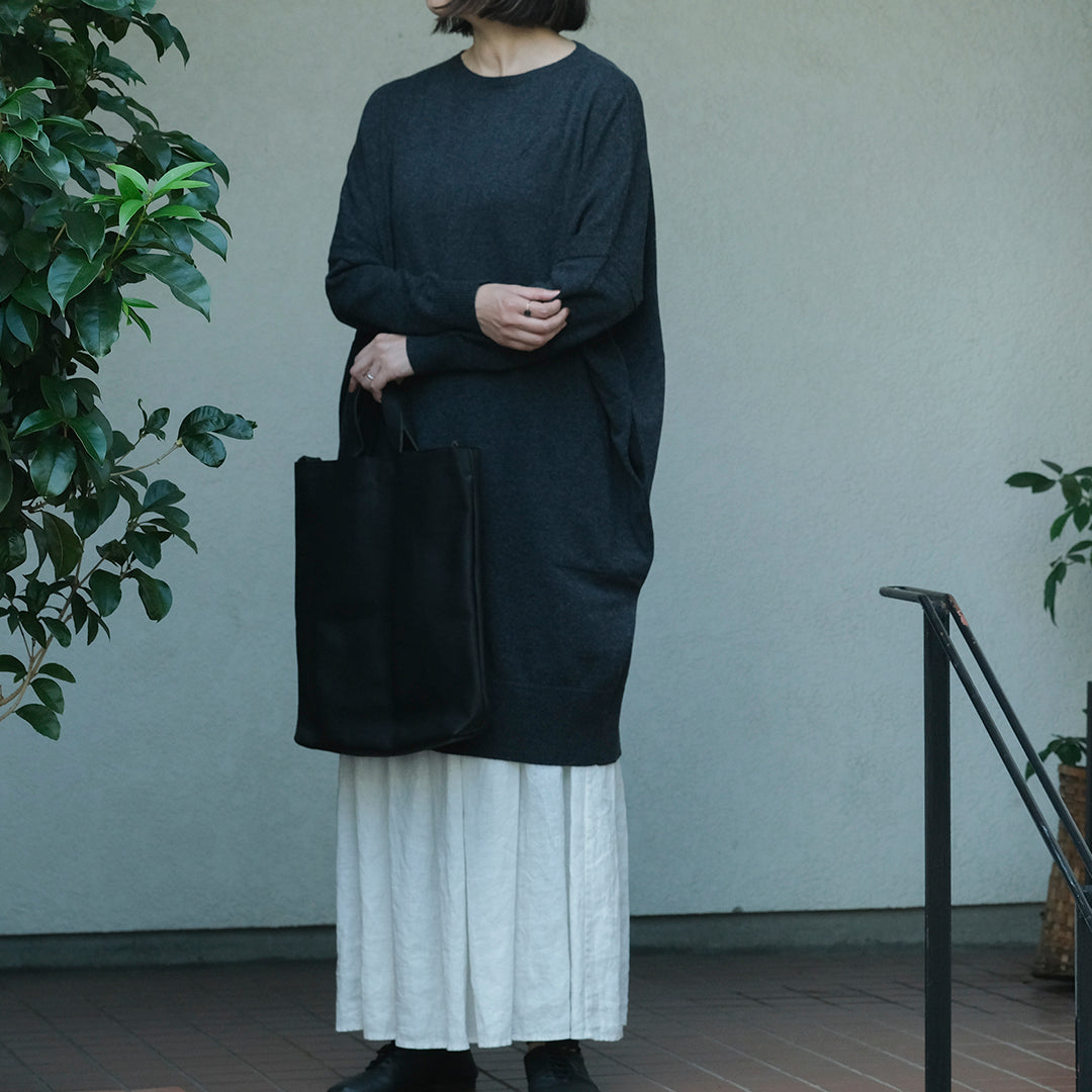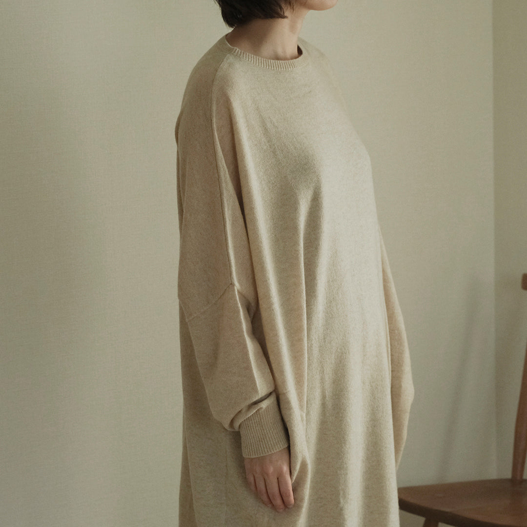 ゆったりとした着心地でシンプルな身頃と、肩を落としたドルマンなシルエットがゆったり大人な雰囲気の一枚。