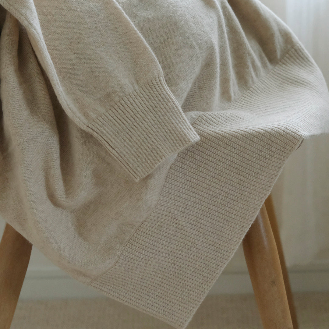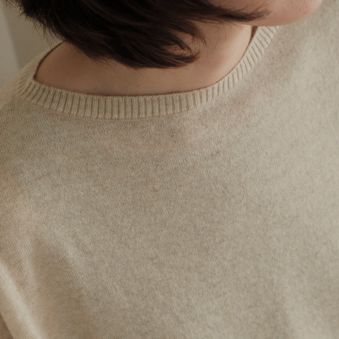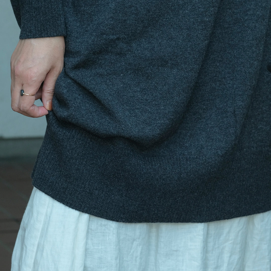 上品なリラックス感のある、すっきりとした襟回りに落ち感のある肩線。単色ではないカシミヤの複雑な色味がカジュアルになりすぎずモードな雰囲気に。