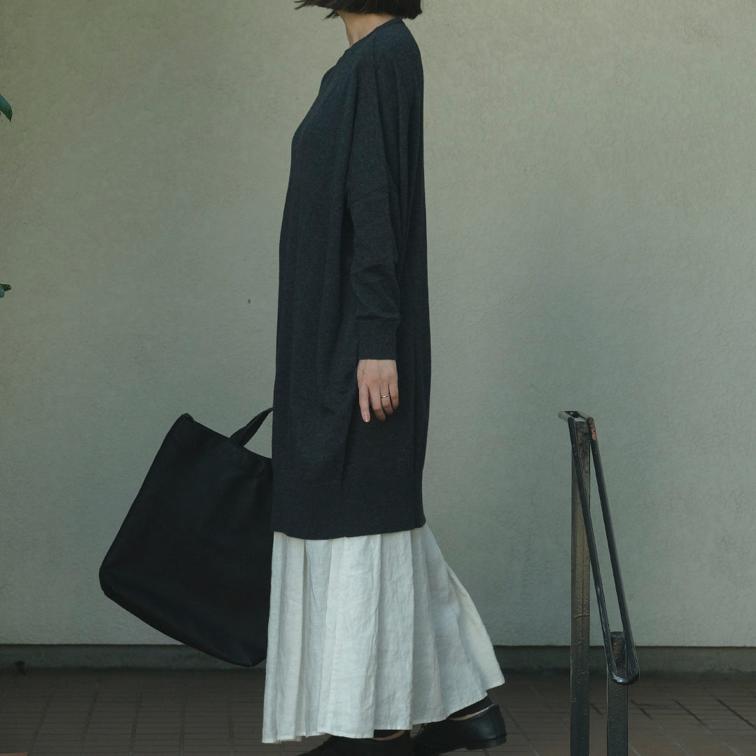 お尻まですっぽりやさしく包み込む着丈は、パンツはもちろんロングスカートやワイドパンツにも合わせやすいデザイン。▲ミックスブラック モデル身長:168cm