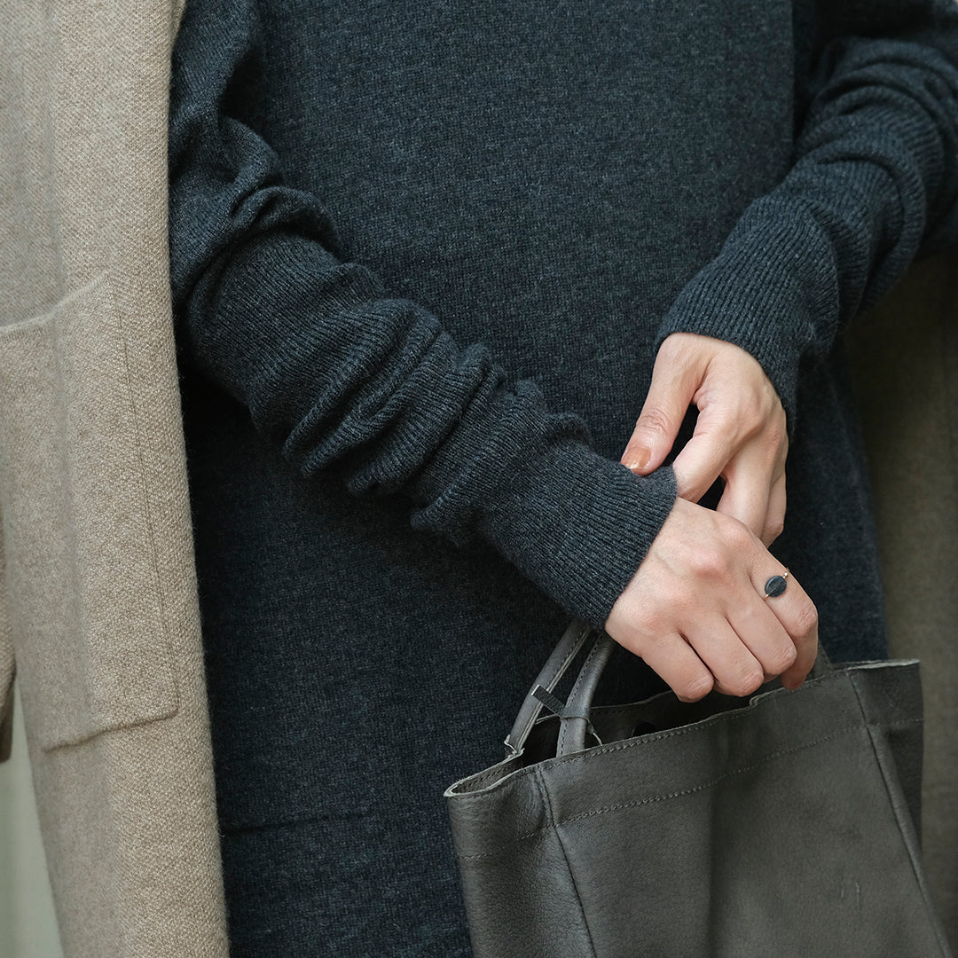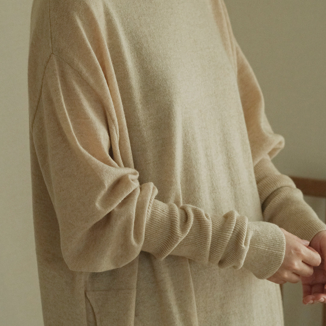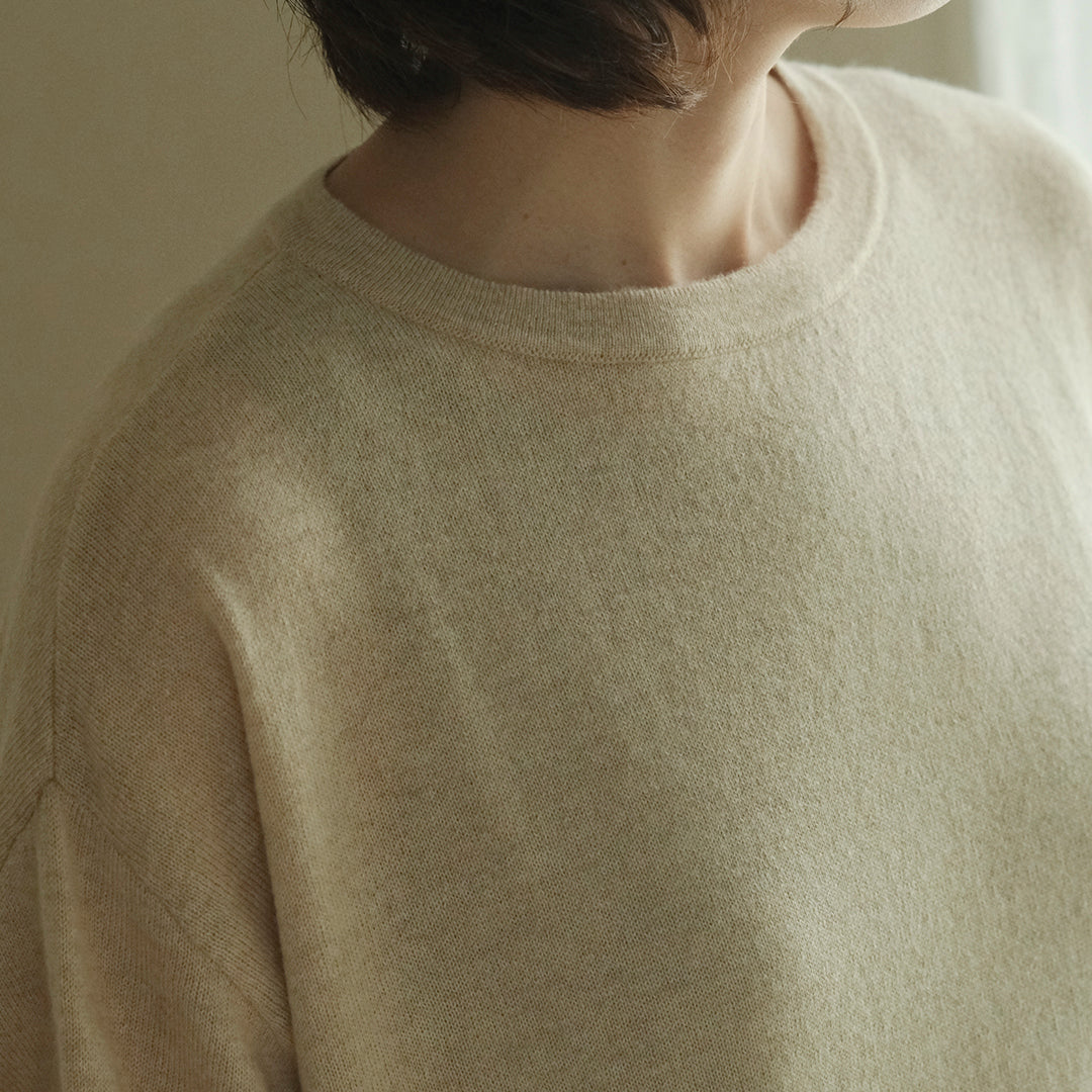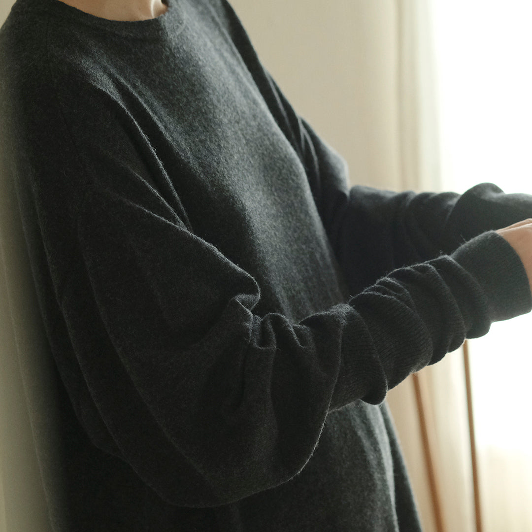 ゆったりとした着心地でシンプルな身頃と、リブの長い袖のシルエットがきれいな一枚。軽い着心地の生地は、重ね着もしやすく長い季節で頼りになる一枚。全身をカシミヤに包まれる贅沢なぬくもりがたまりません。
