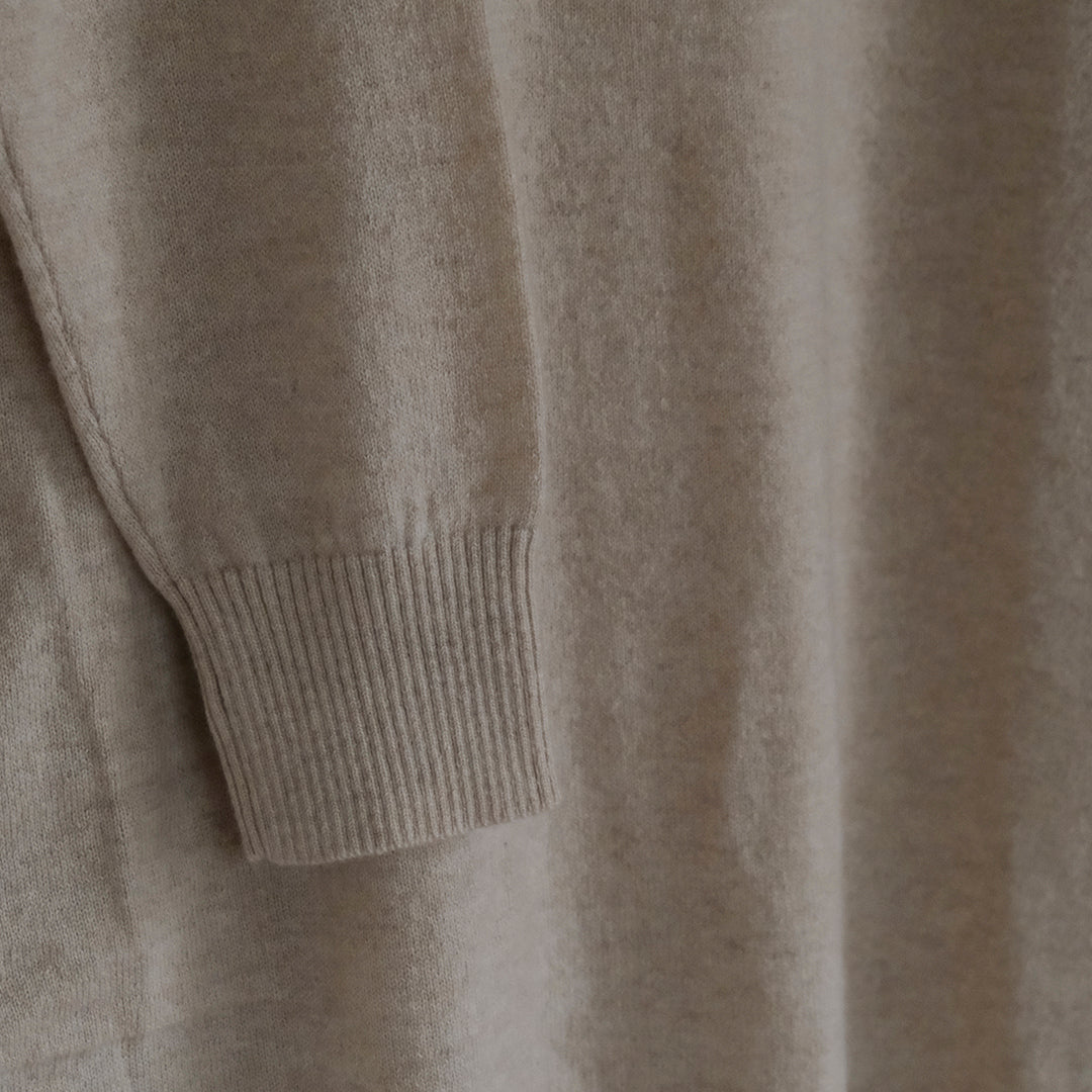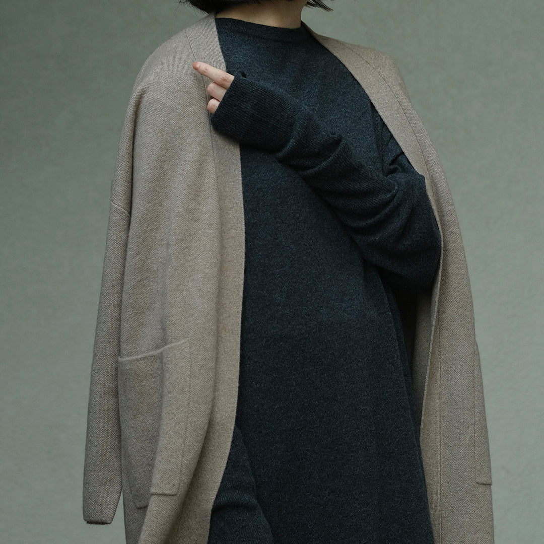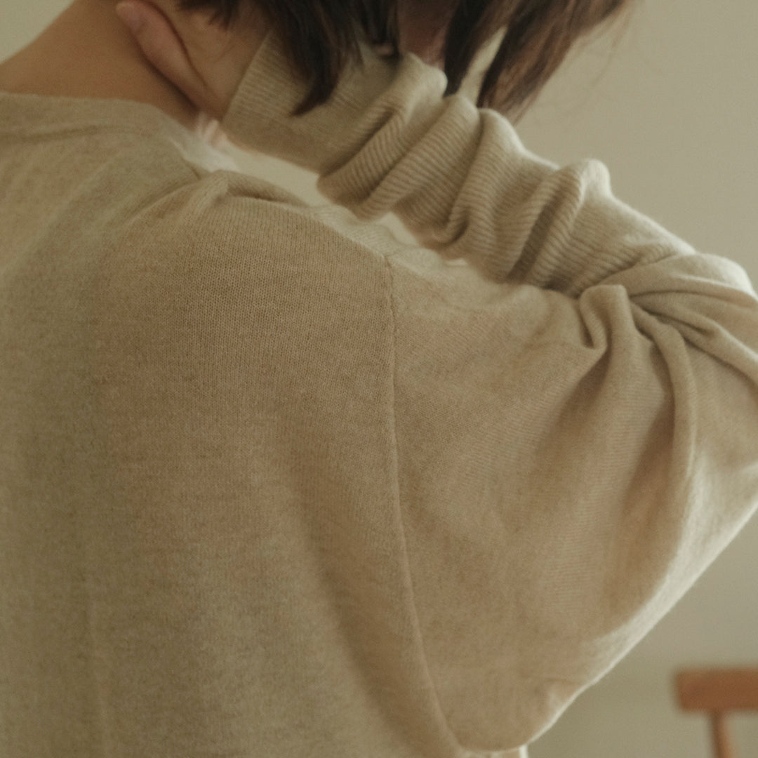 ゆったりとした着心地でシンプルな身頃と、リブの長い袖のシルエットがきれいな一枚。軽い着心地の生地は、重ね着もしやすく長い季節で頼りになる一枚。全身をカシミヤに包まれる贅沢なぬくもりがたまりません。
