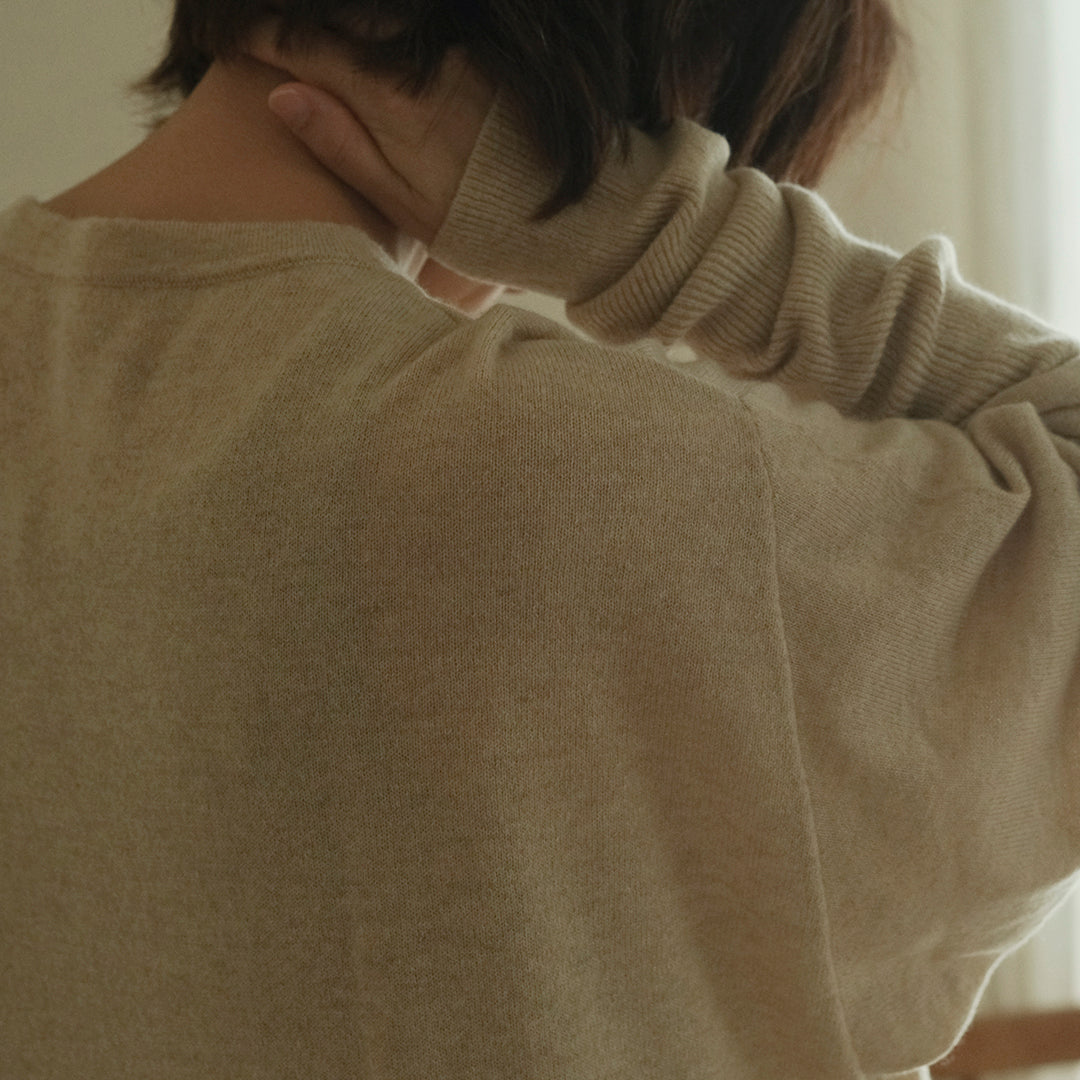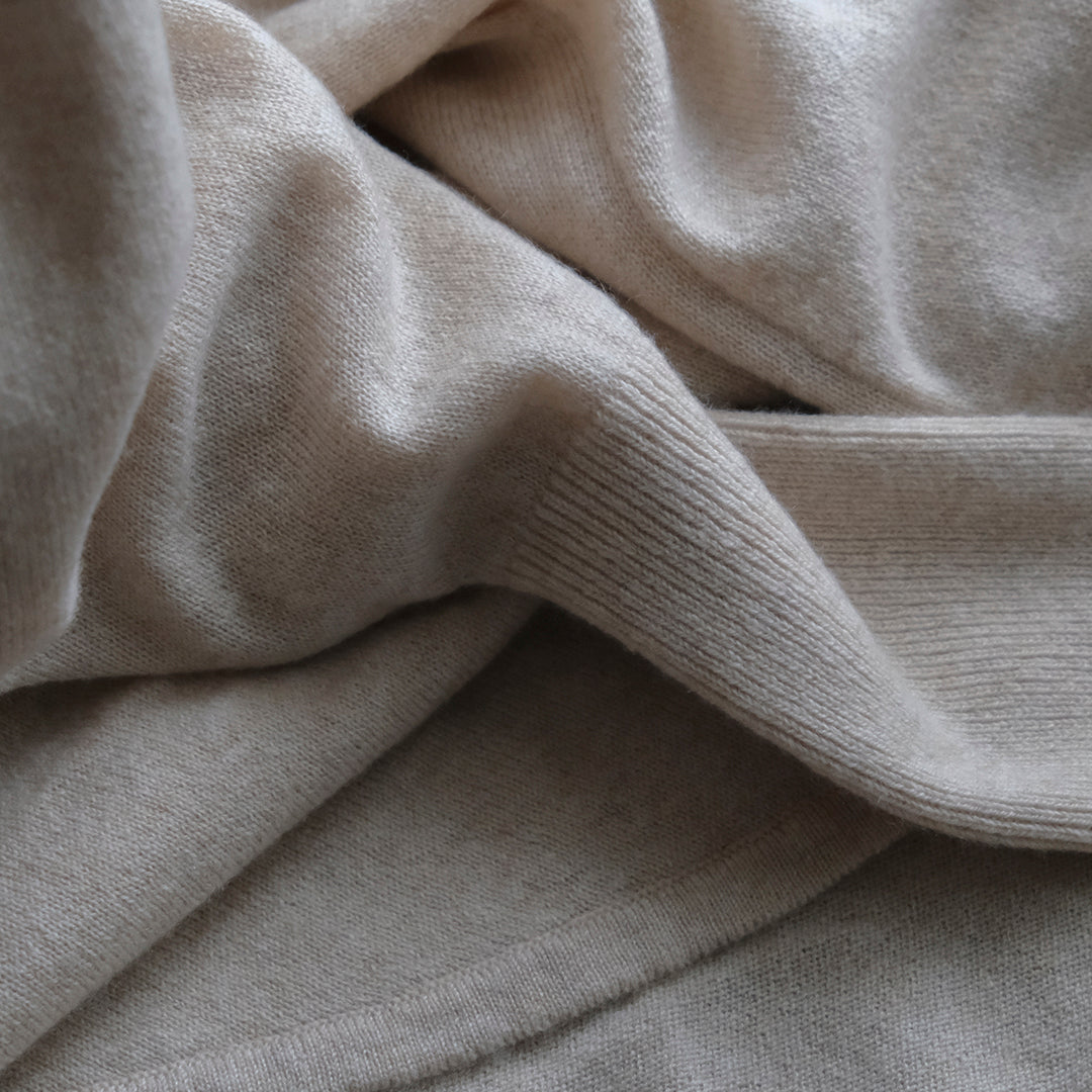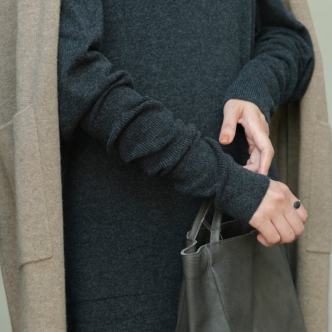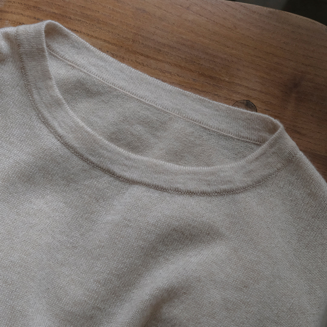 ゆったりとした着心地でシンプルな身頃と、リブの長い袖のシルエットがきれいな一枚。軽い着心地の生地は、重ね着もしやすく長い季節で頼りになる一枚。全身をカシミヤに包まれる贅沢なぬくもりがたまりません。