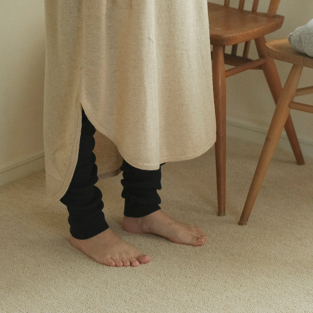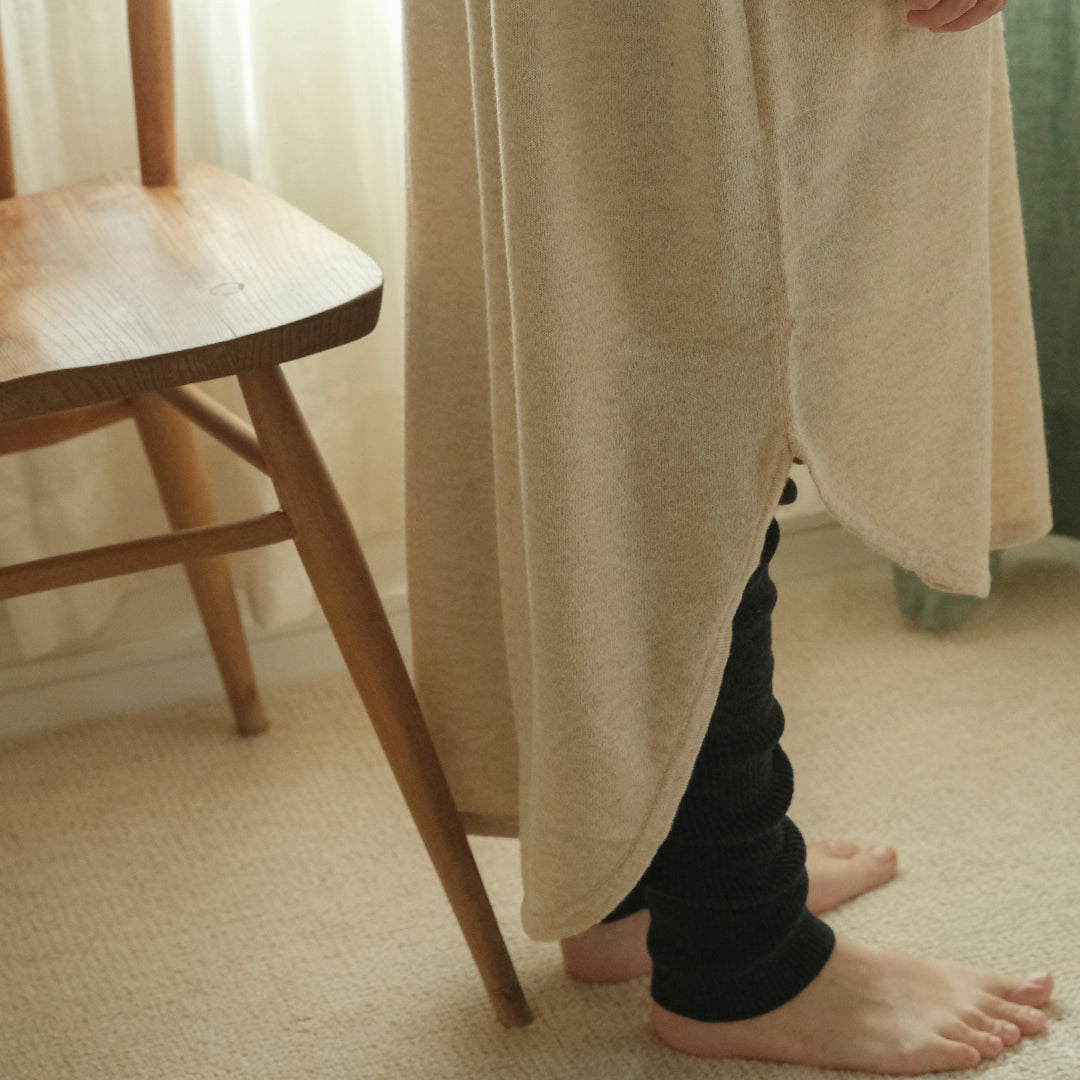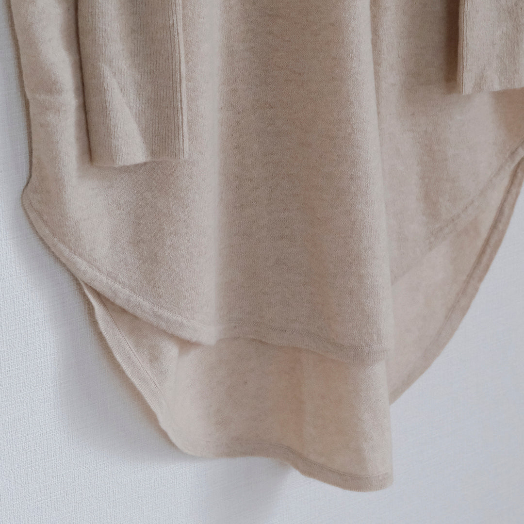 後ろが長めの前後差をつけた裾は、シャツの裾ようにラウンドカットされた仕様。サイドに向かって弧を描きます。▲ベージュ モデル身長:155cm、カシミヤゆるレギンス