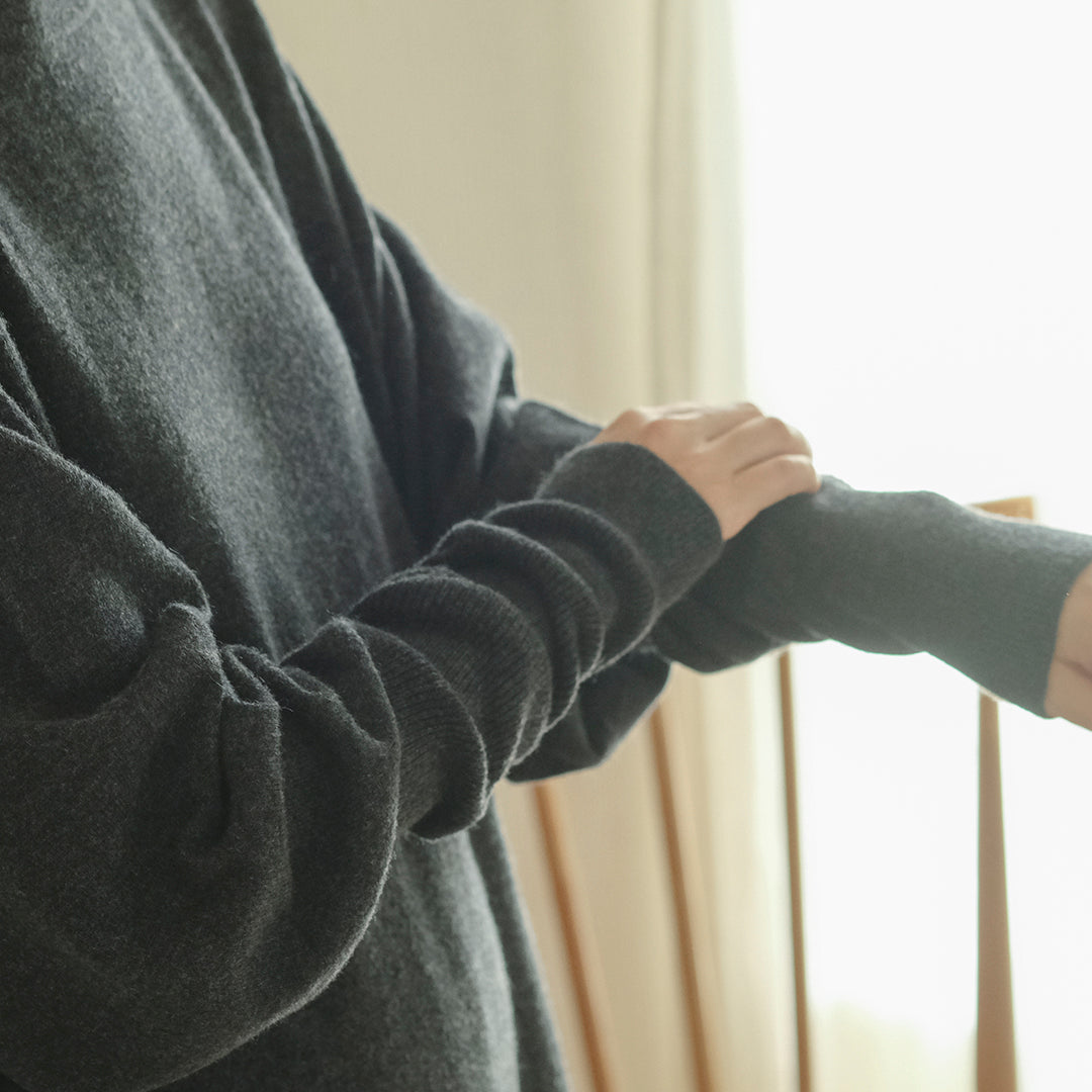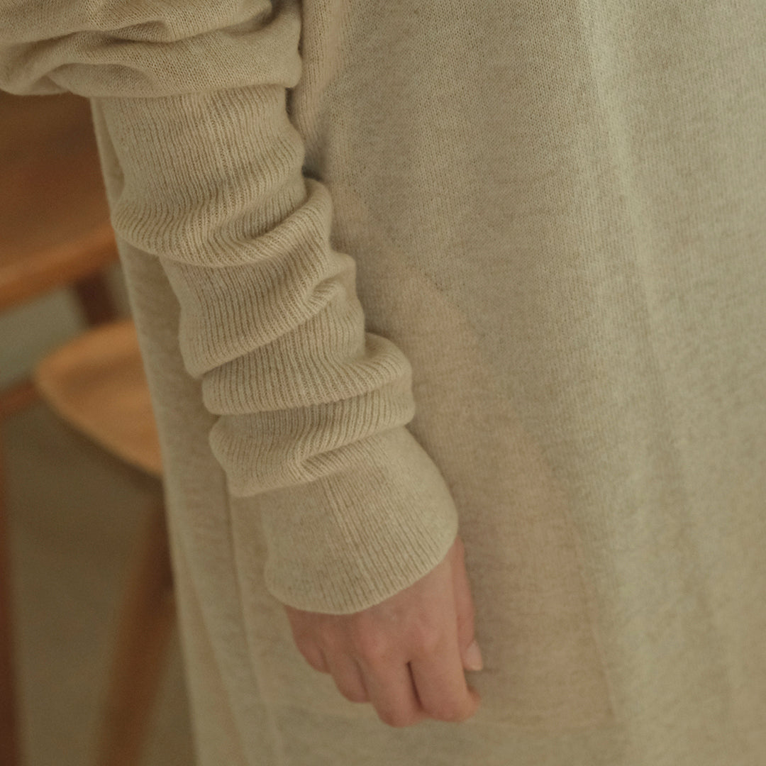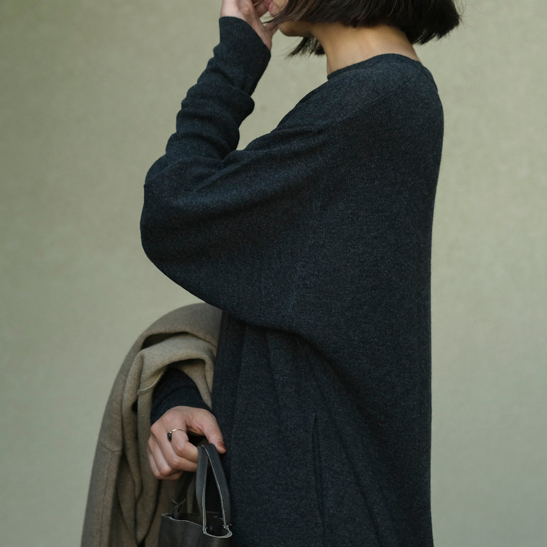 ほどよい襟ぐりの開きに、ドロップショルダーで落ち感のある肩線は、上品なリラックス感があります。それでいてリブ部分の長い袖口が印象的で、モードにも着こなすことができるデザインです。