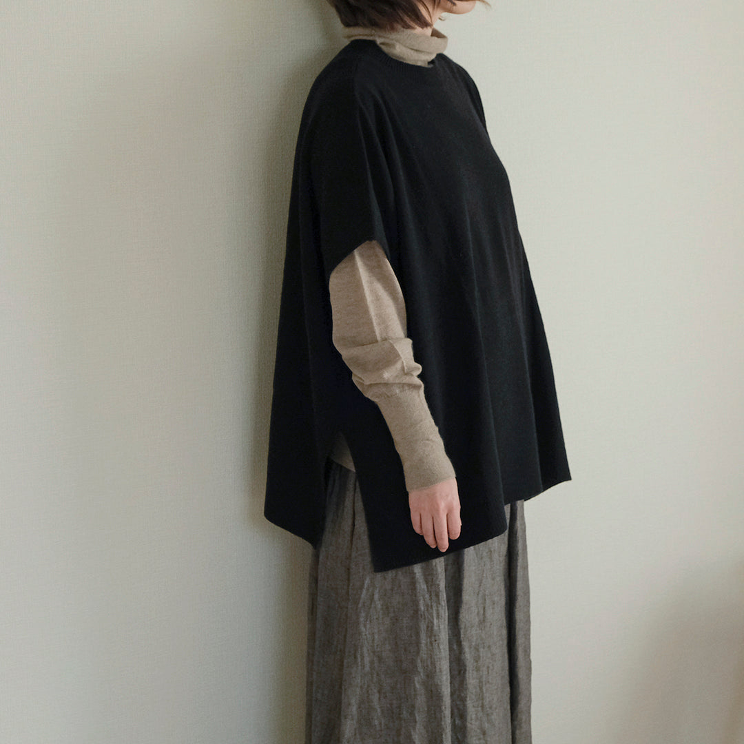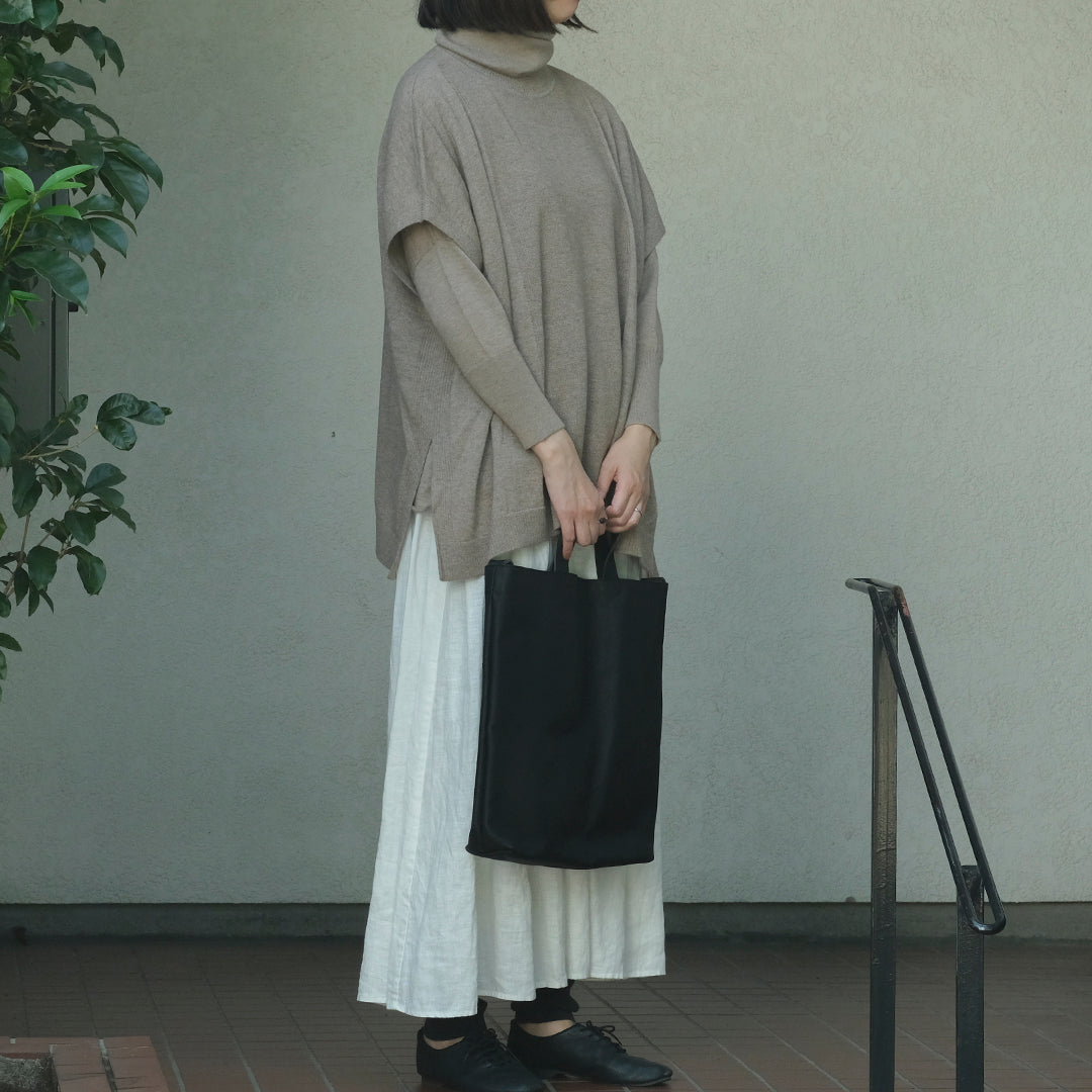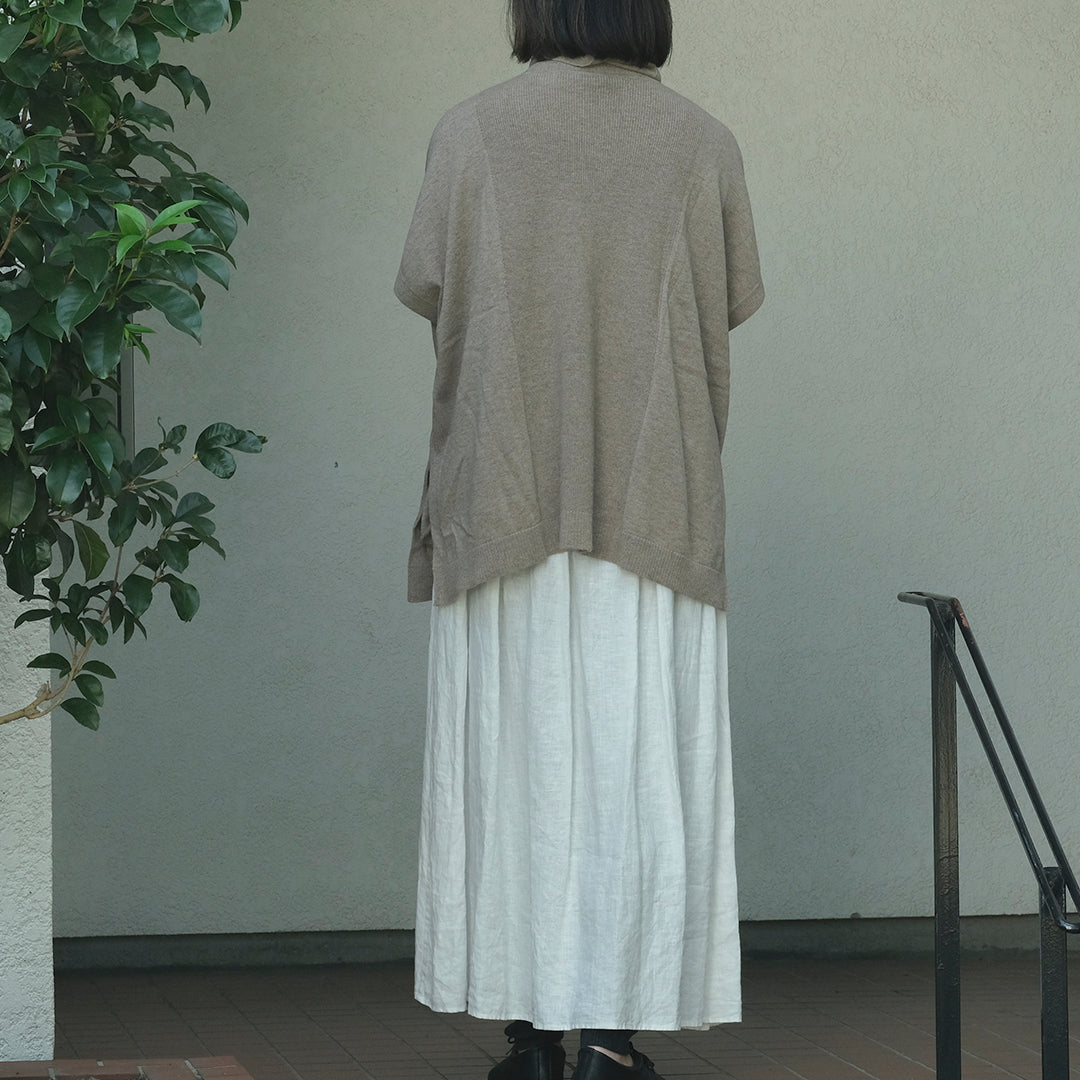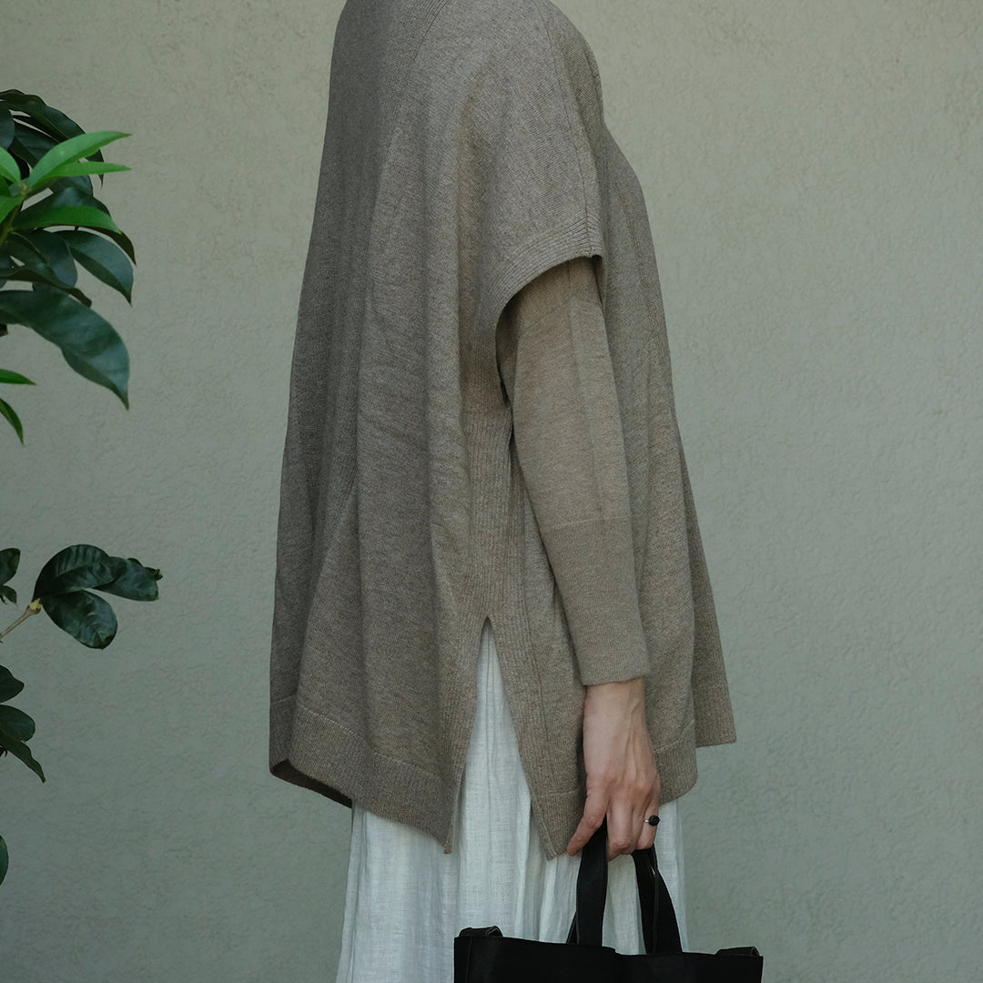 スクエアなシルエットに肩幅を選ばないサイズ感、中央とサイドの編み方を変えて縦ラインをデザインしたスクエアラインジレ。フラットなシルエットはワンピースやスカート、パンツにも合わせやすい一枚です。▲ブラウン、モデル身長168cm、テントラインタートルを重ねて、スカート:リトアニアンリネンタックギャザースカート