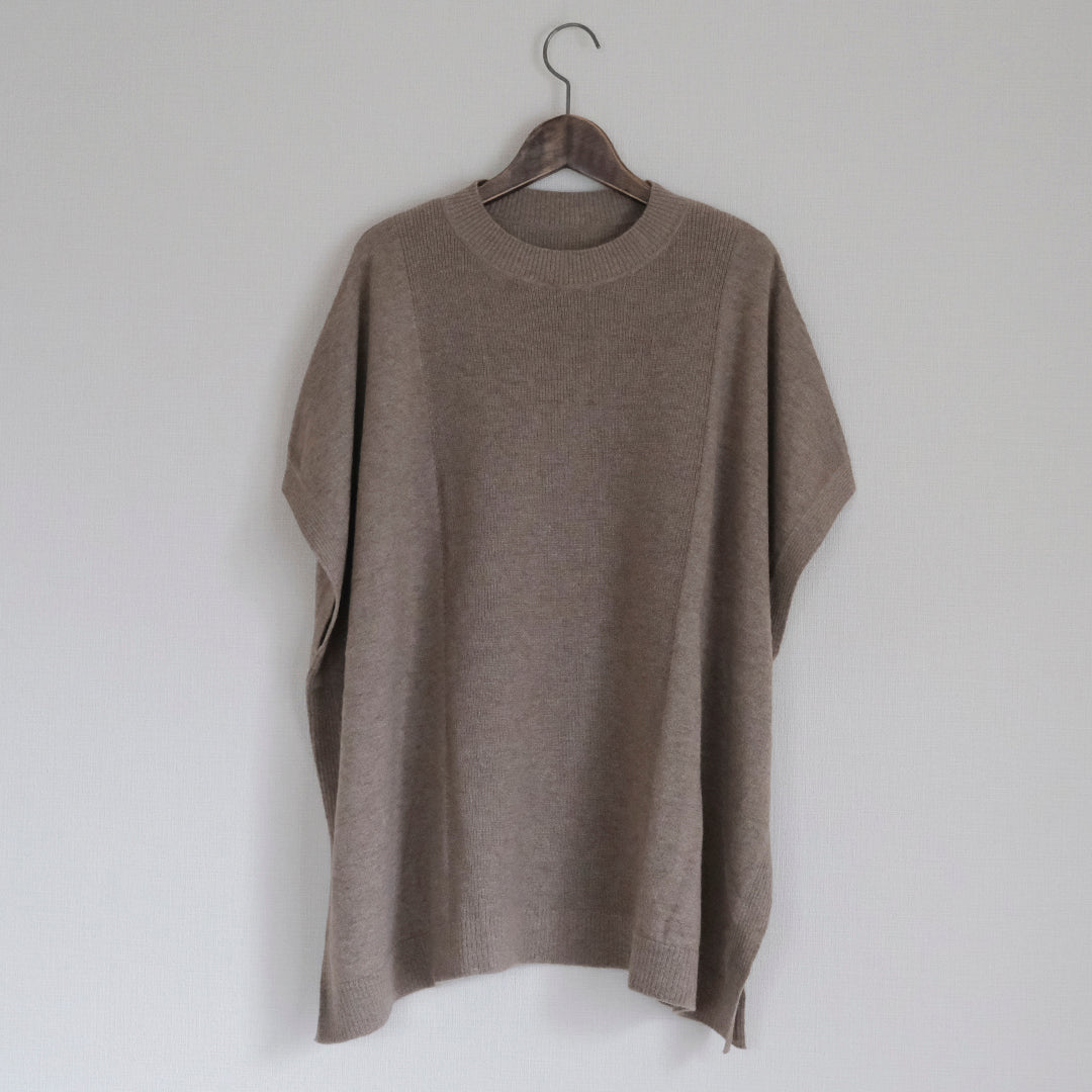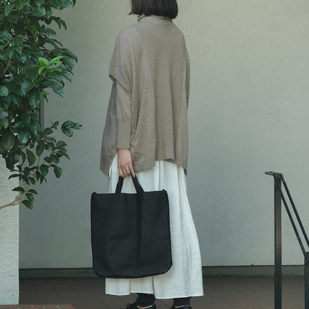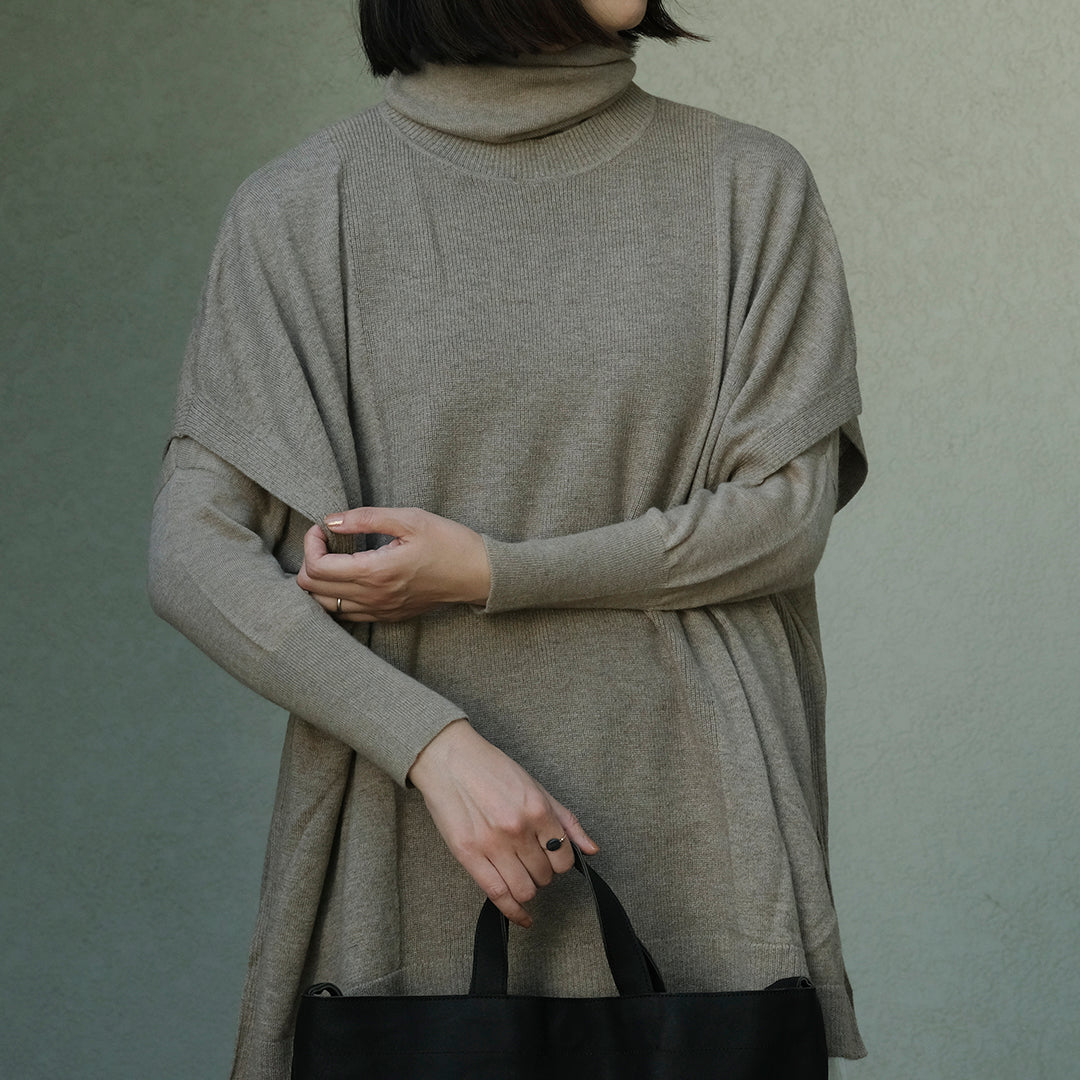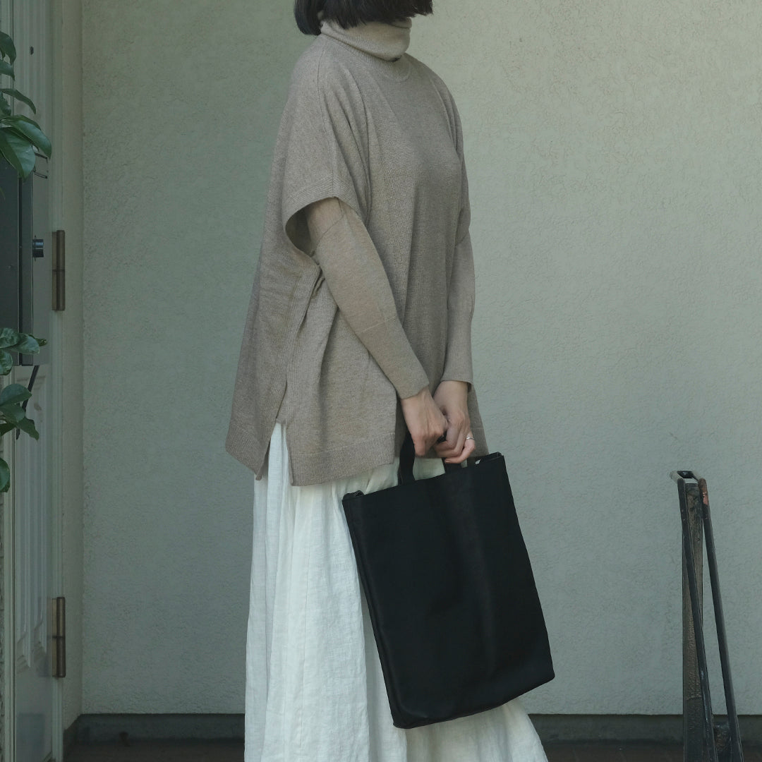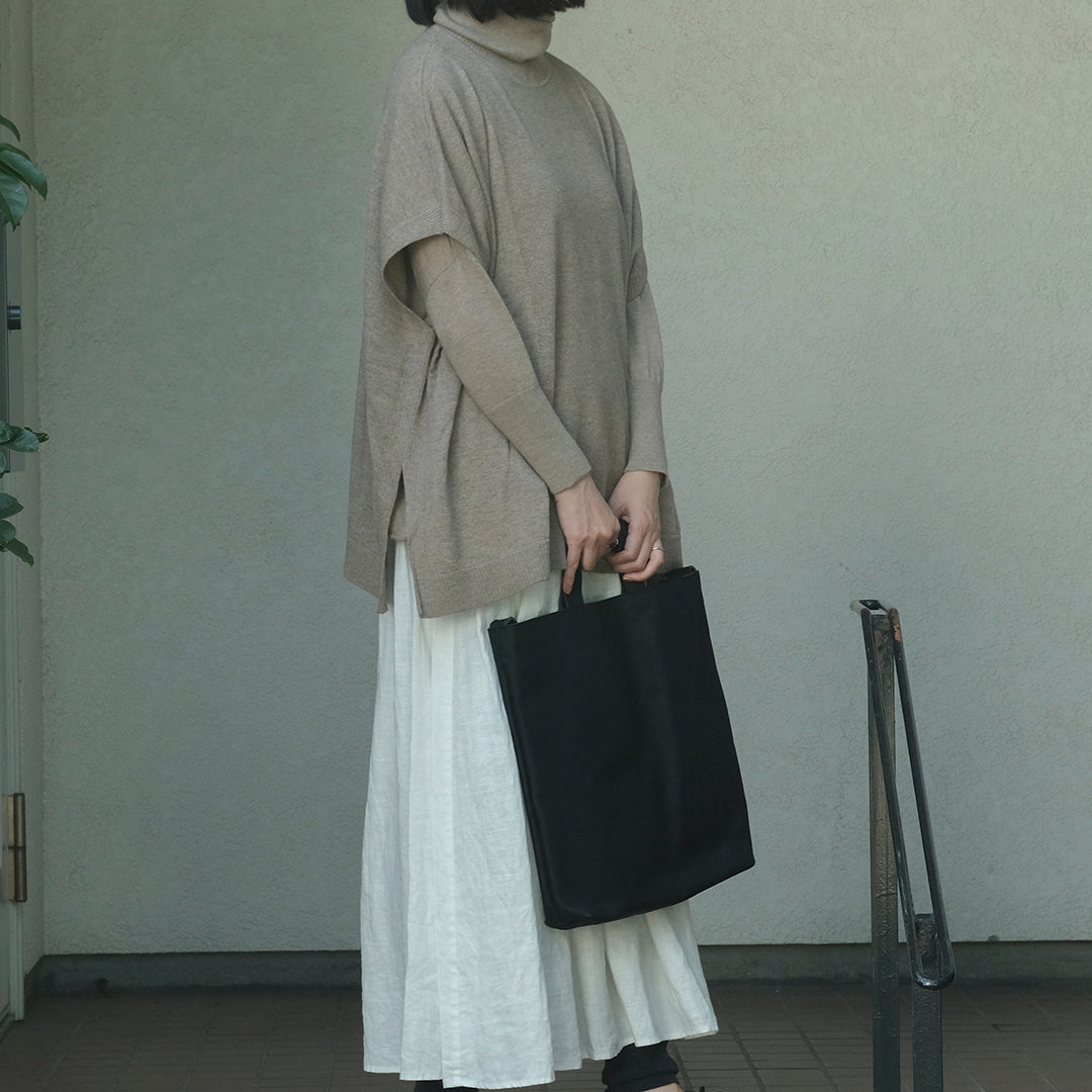スクエアなシルエットに肩幅を選ばないサイズ感、中央とサイドの編み方を変えて縦ラインをデザインしたスクエアラインジレ。フラットなシルエットはワンピースやスカート、パンツにも合わせやすい一枚です。▲ブラウン、モデル身長168cm、テントラインタートルを重ねて、スカート:リトアニアンリネンタックギャザースカート