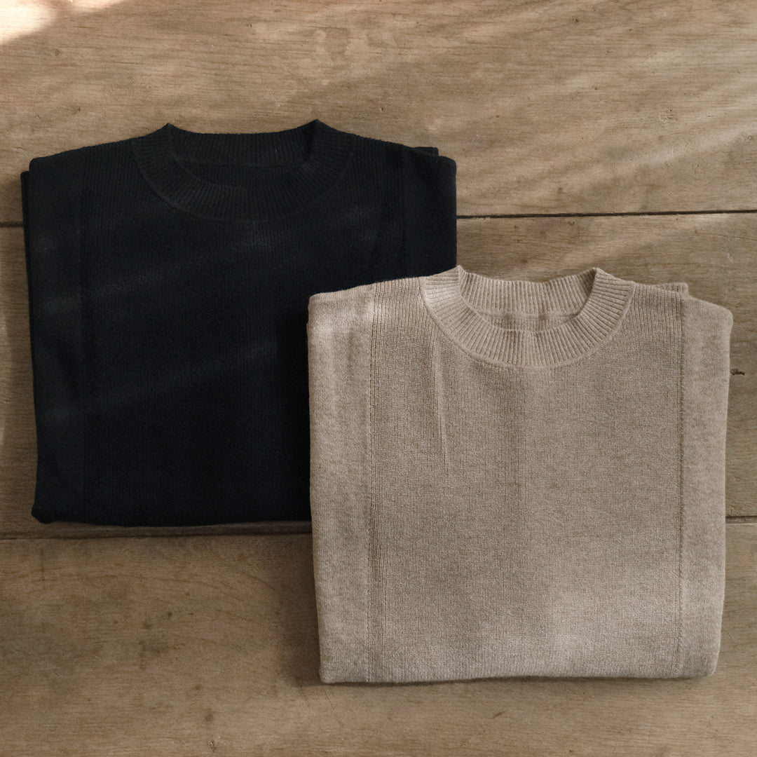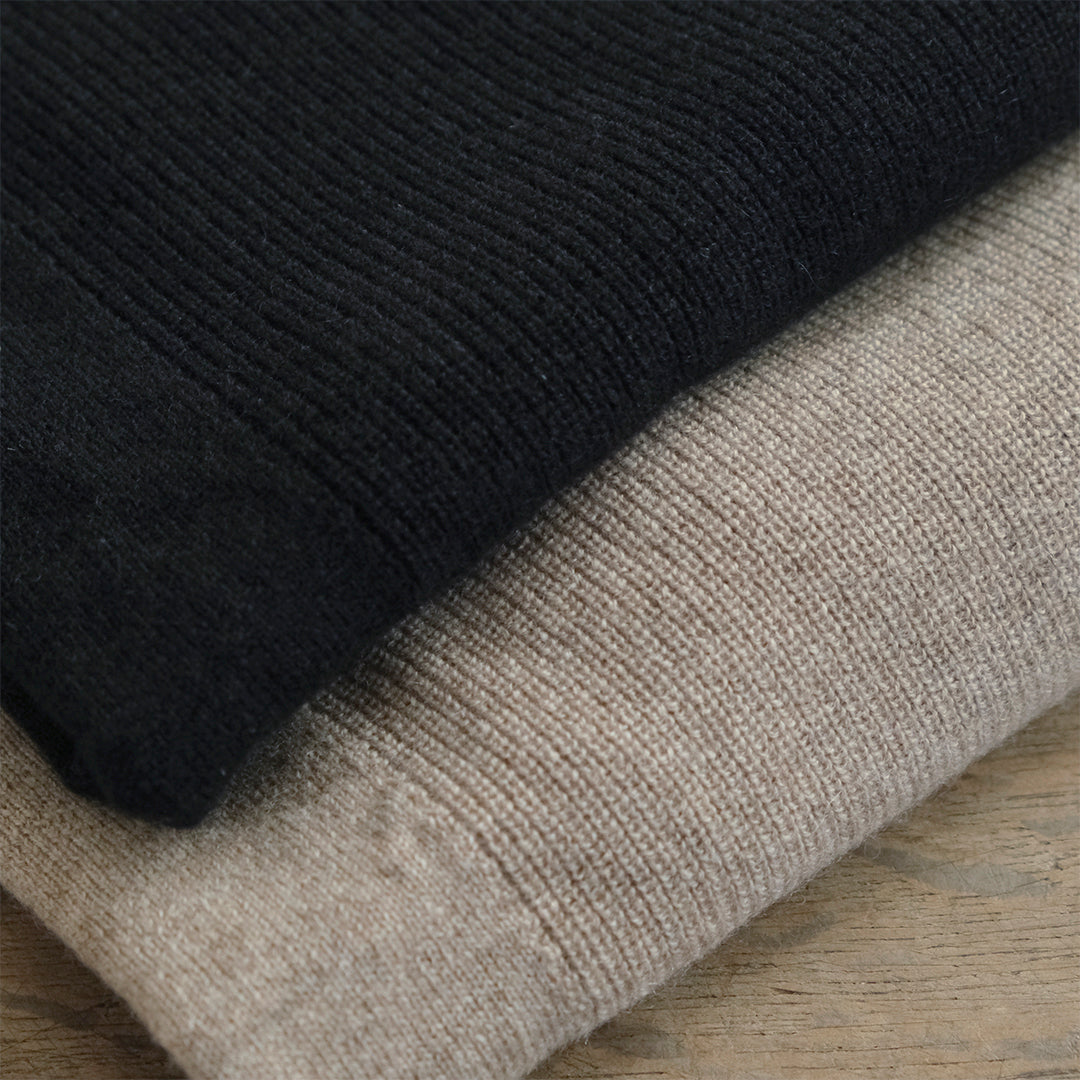 重ねて使いやすいベーシックな2つのカラー。カシミヤそのもの「ロウカシミヤ」のブラウンは、高級感もあり他にはない奥深いカラー。