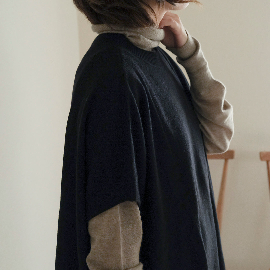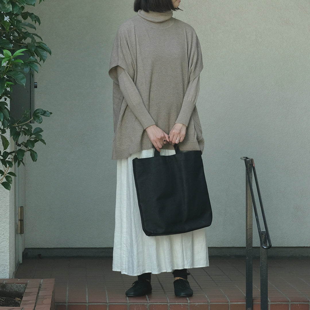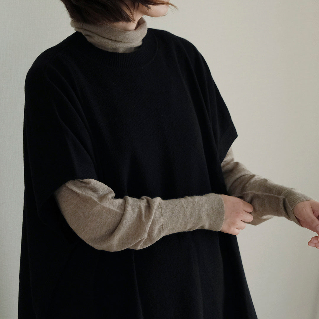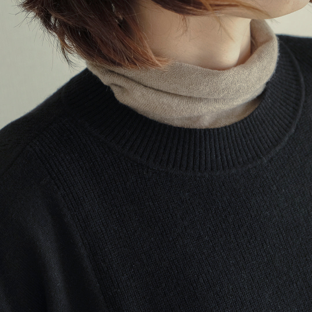 下に合わせるアイテムを選ばないのもうれしいポイント。重ねたアイテムの影響を受けにくい程よい厚みがすっきりとした印象の着こなしに。▲ブラックにバックシームタートルニットを重ねて、モデル身長155cm