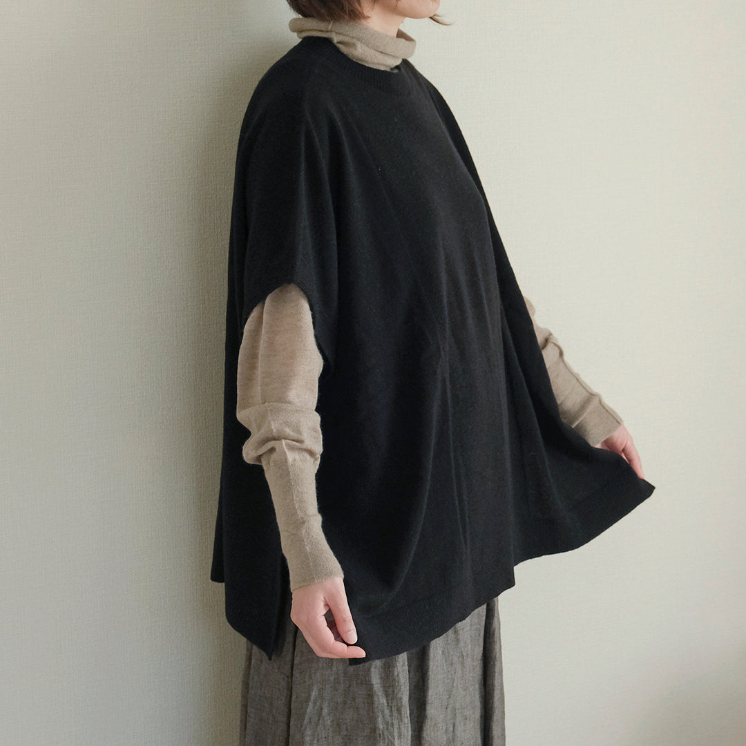 ハイネックやシャツの襟にも重ねやすい襟もと。季節の変わり目に頼りになるジレ。長袖だけではなく半袖に合わせたり、一枚でTシャツのような着こなしもおすすめです。